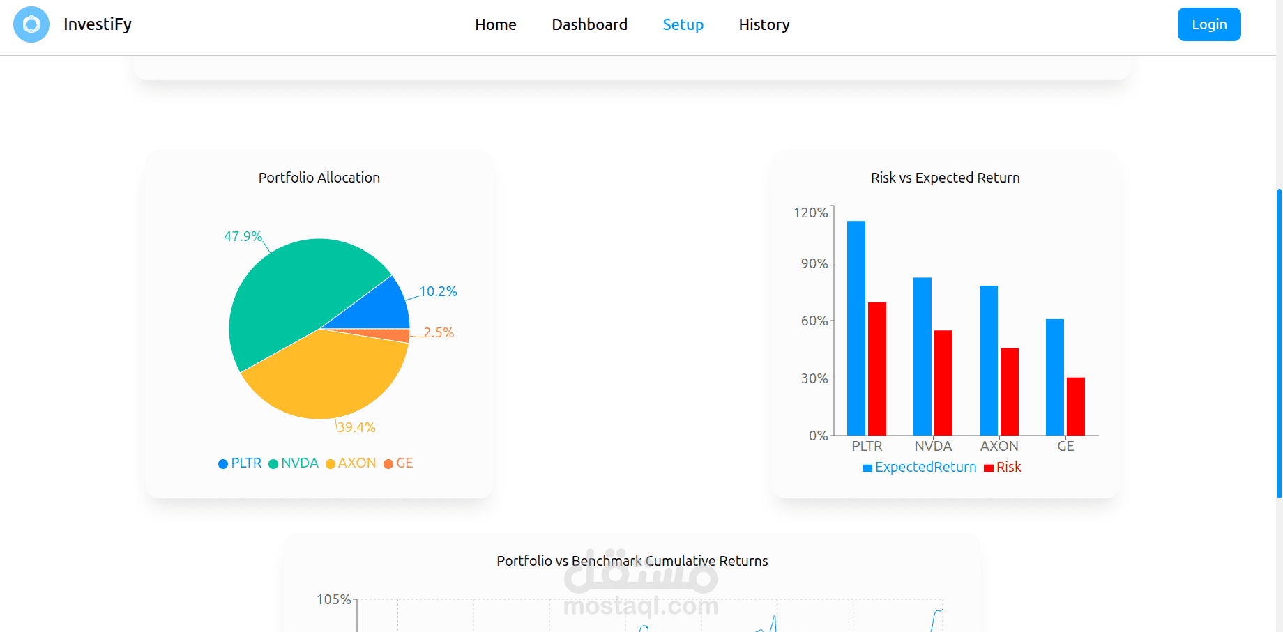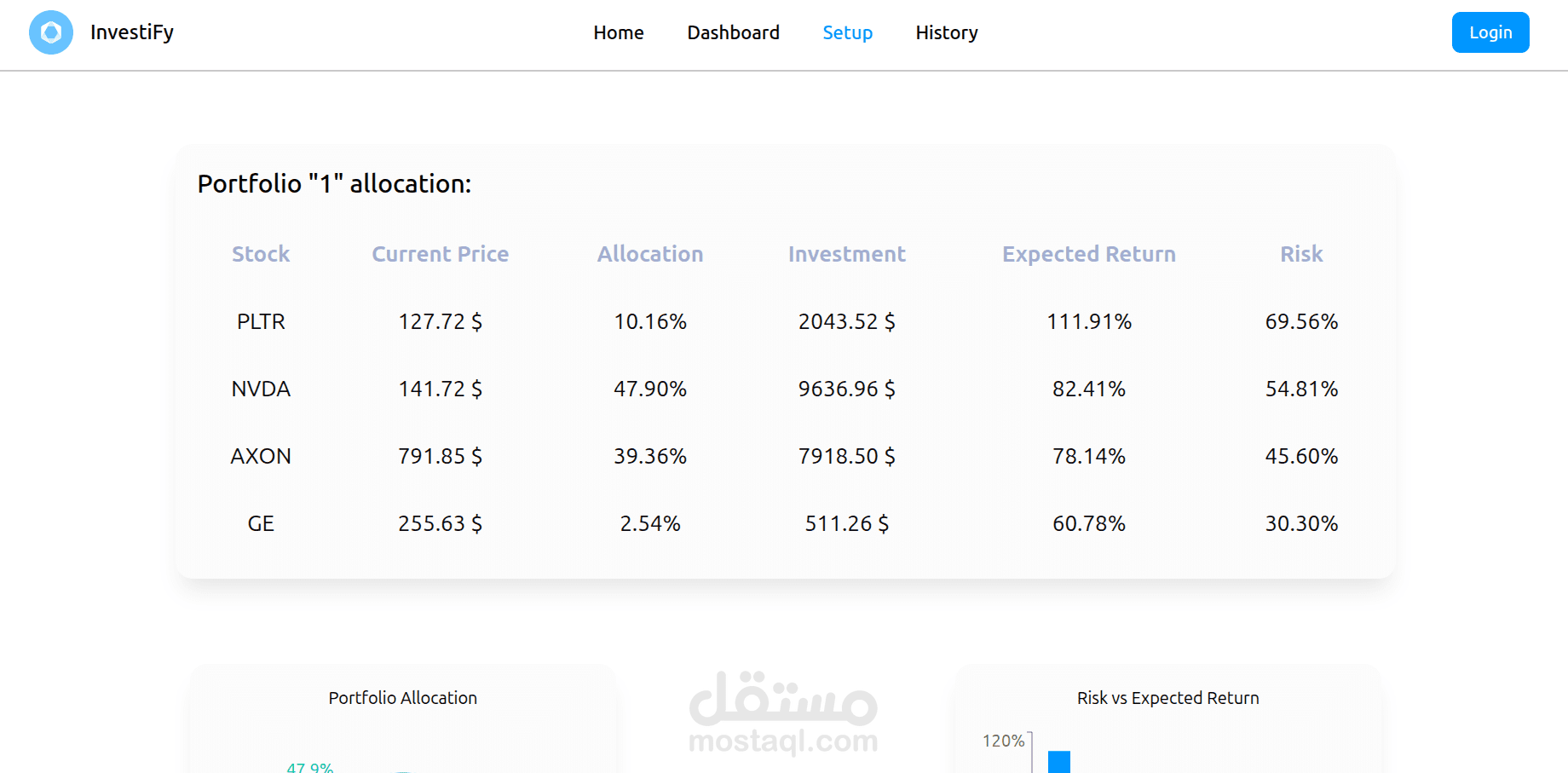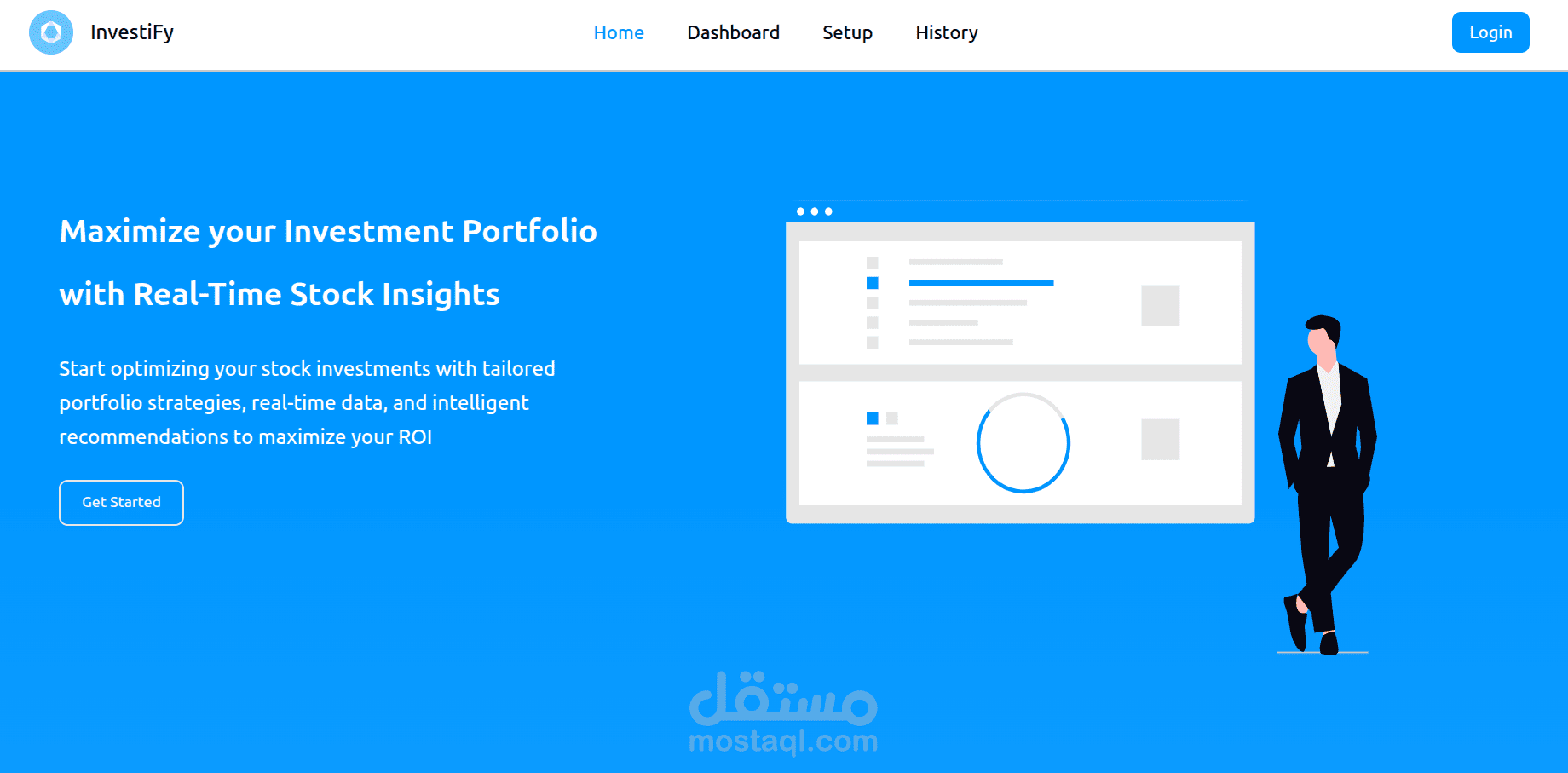 Investify هو تطبيق ويب ذكي لإدارة المحافظ الاستثمارية، تم تطويره كمشروع جامعي جماعي. في هذا المشروع كنت المسؤول عن تطوير الويب (Full Stack Web Development) حيث عملت على بناء معظم أجزاء التطبيق باستخدام تقنيات حديثة.