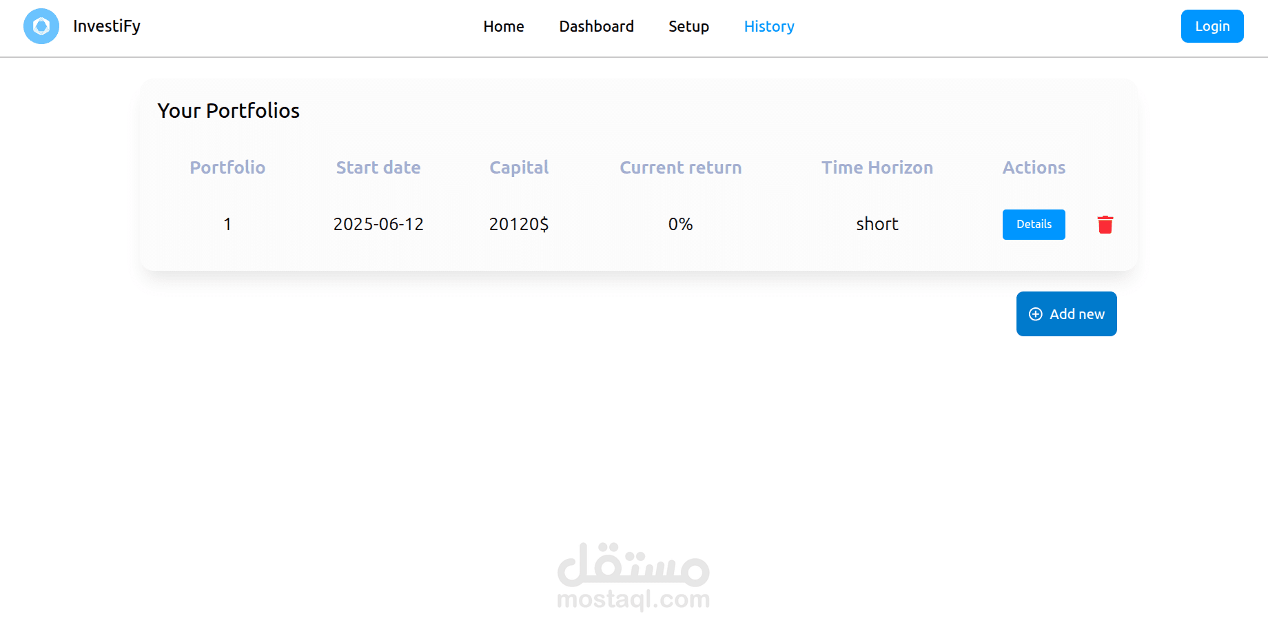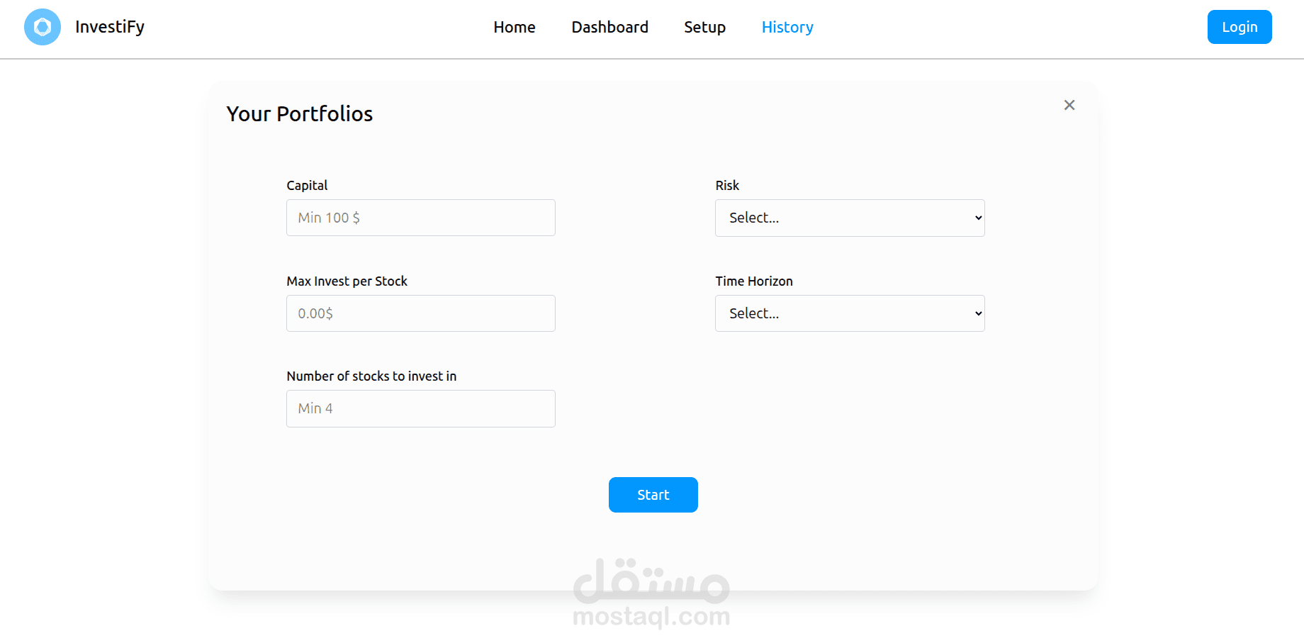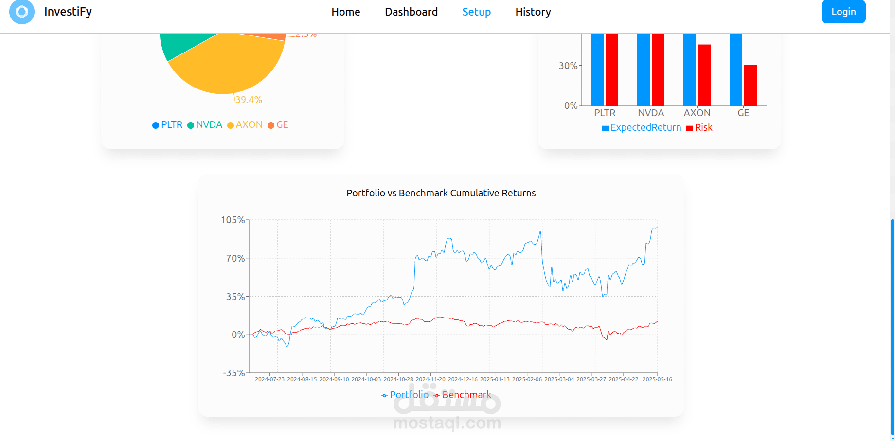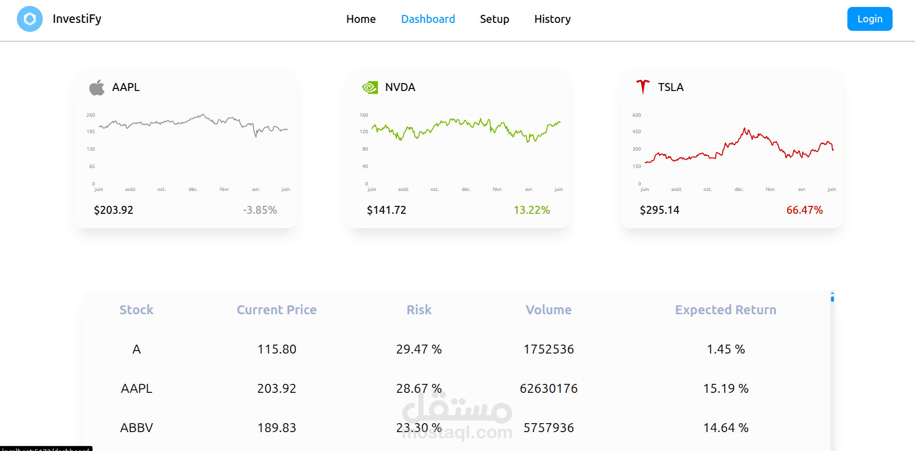 Investify هو تطبيق ويب ذكي لإدارة المحافظ الاستثمارية، تم تطويره كمشروع جامعي جماعي. في هذا المشروع كنت المسؤول عن تطوير الويب (Full Stack Web Development) حيث عملت على بناء معظم أجزاء التطبيق باستخدام تقنيات حديثة.