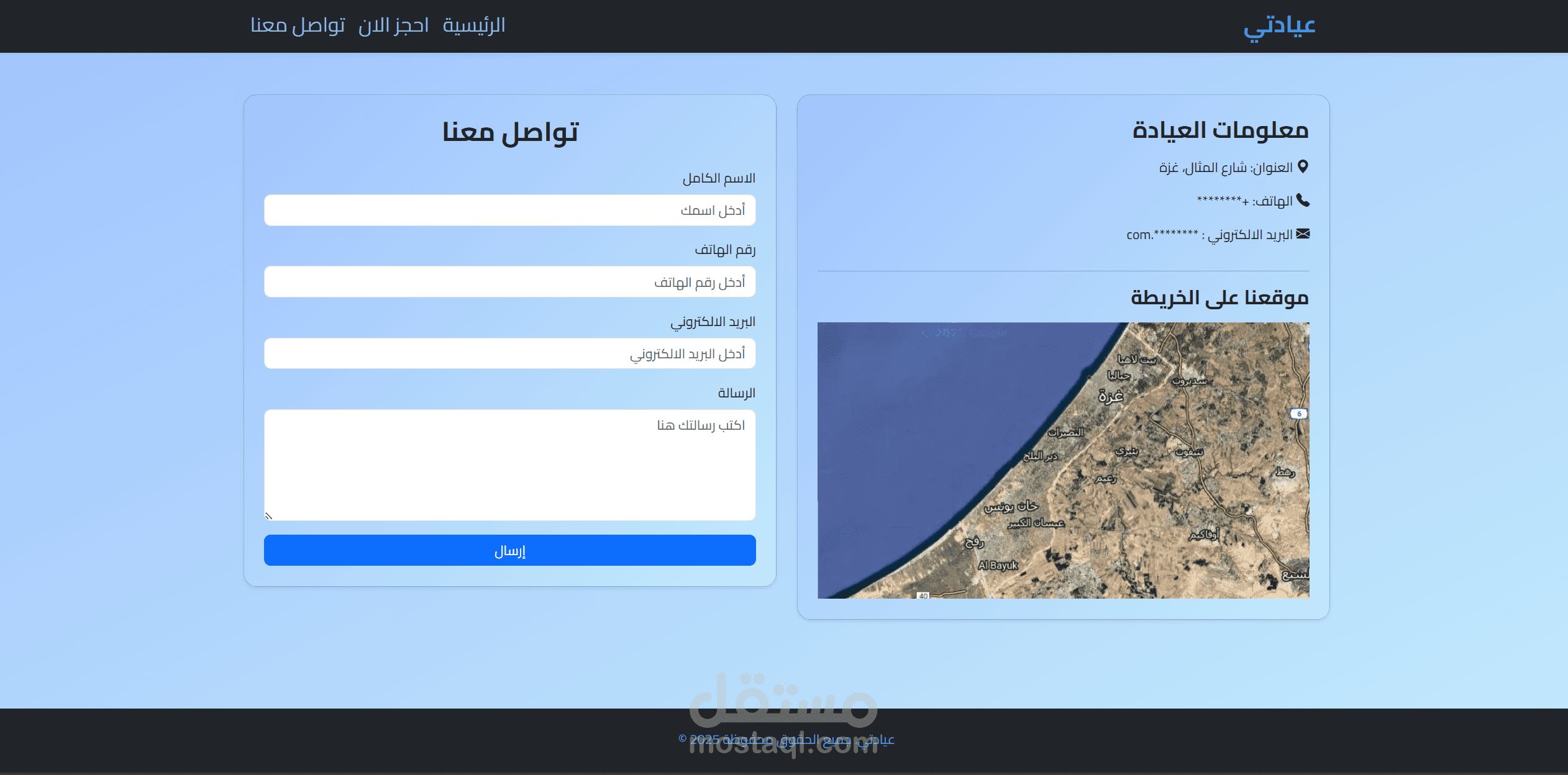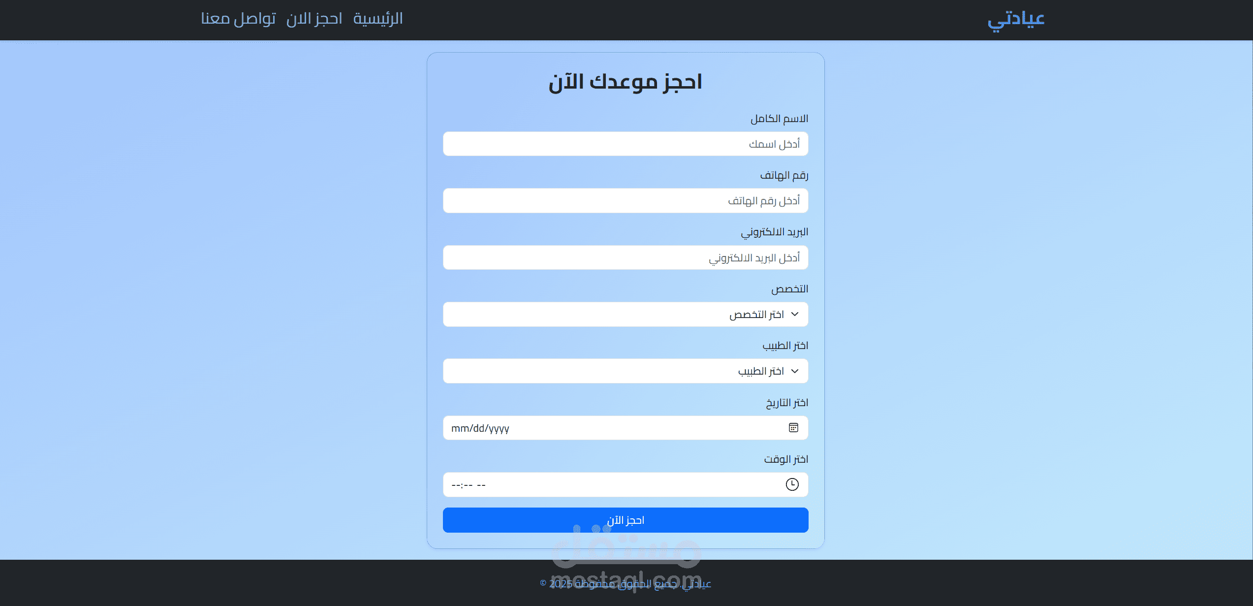 مشروع شامل لإنشاء موقع عيادة إلكتروني بالعربي، يتيح للزوار حجز المواعيد والتواصل مع الإدارة بسهولة. الموقع يشمل: