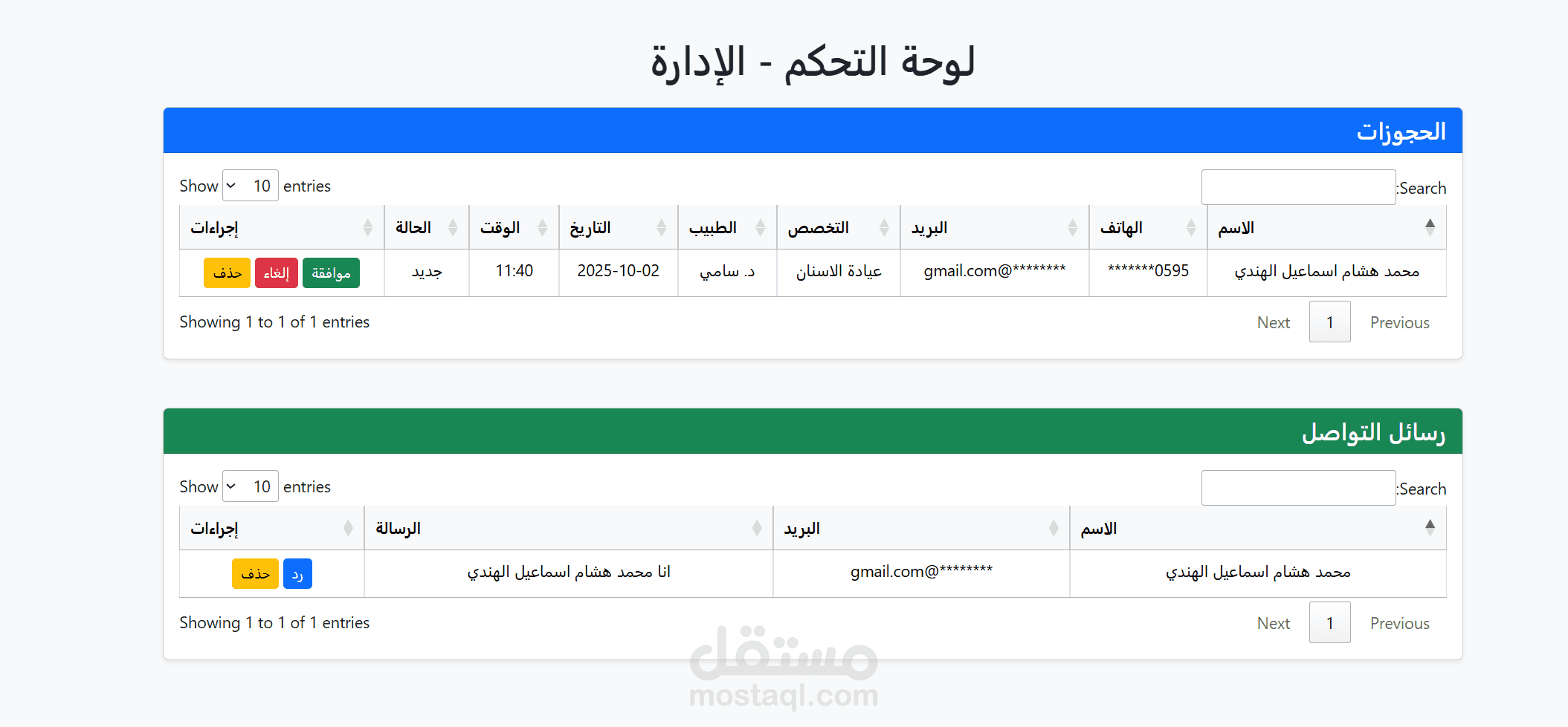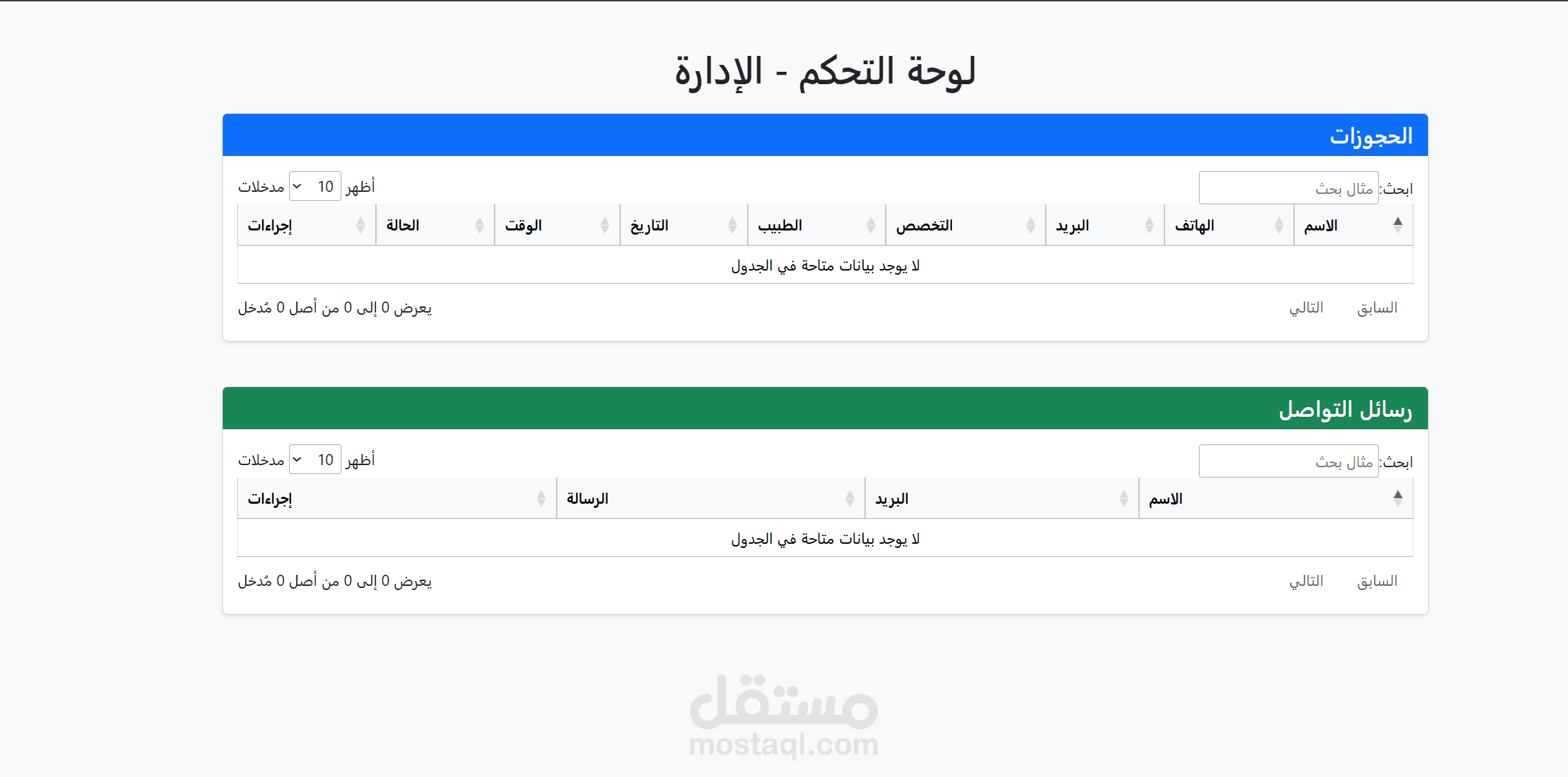 عرض جميع الحجوزات والرسائل في جداول منظمة.