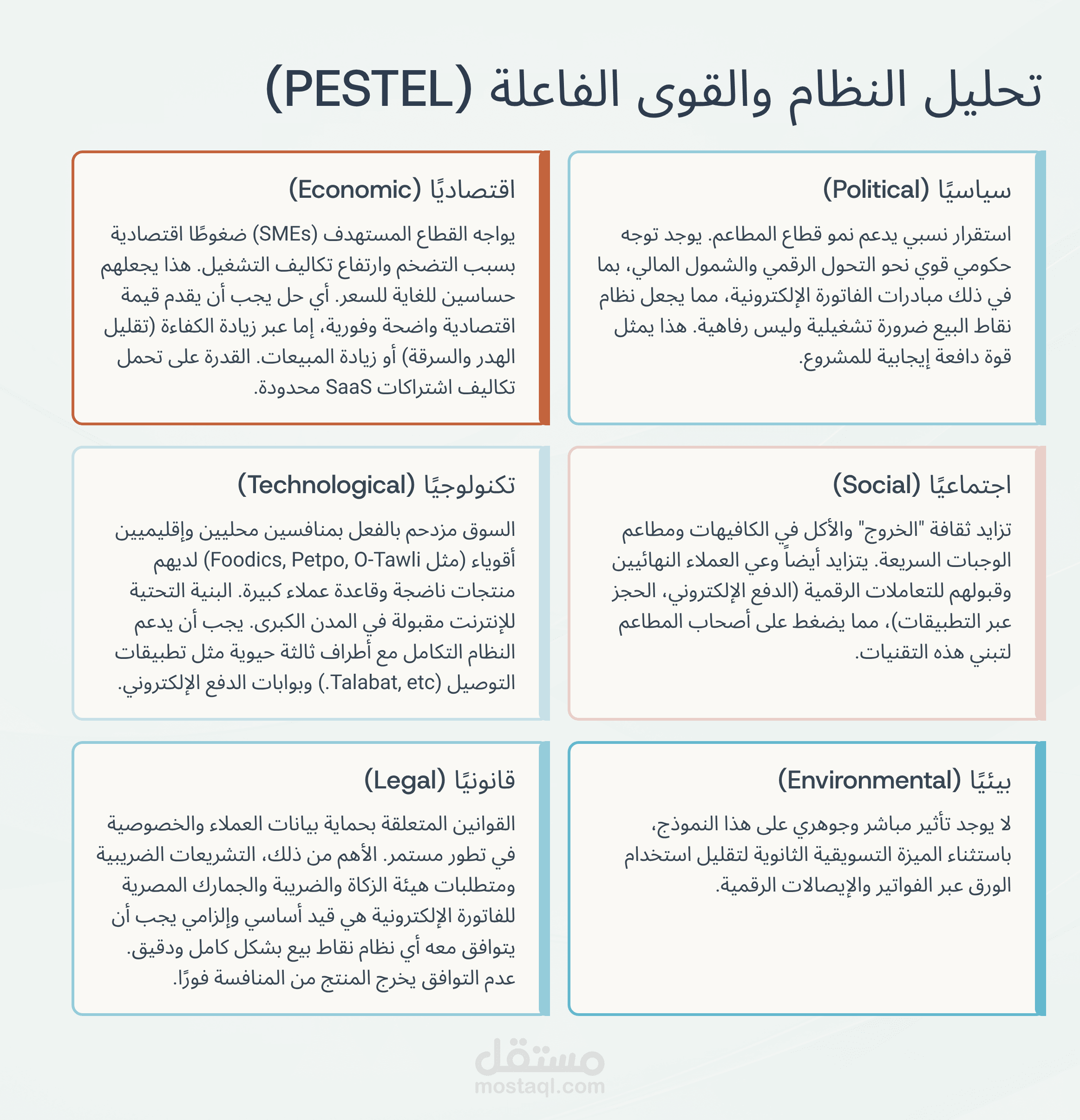 تحليل PESTEL للعوامل السياسية والاقتصادية والاجتماعية والتكنولوجية المؤثرة.