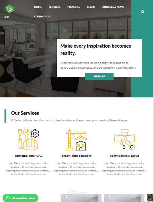 يشمل الصفحات الأساسية: الرئيسية – المشروعات – الخدمات – الفريق – من نحن – الأسئلة الشائعة – تواصل معنا.