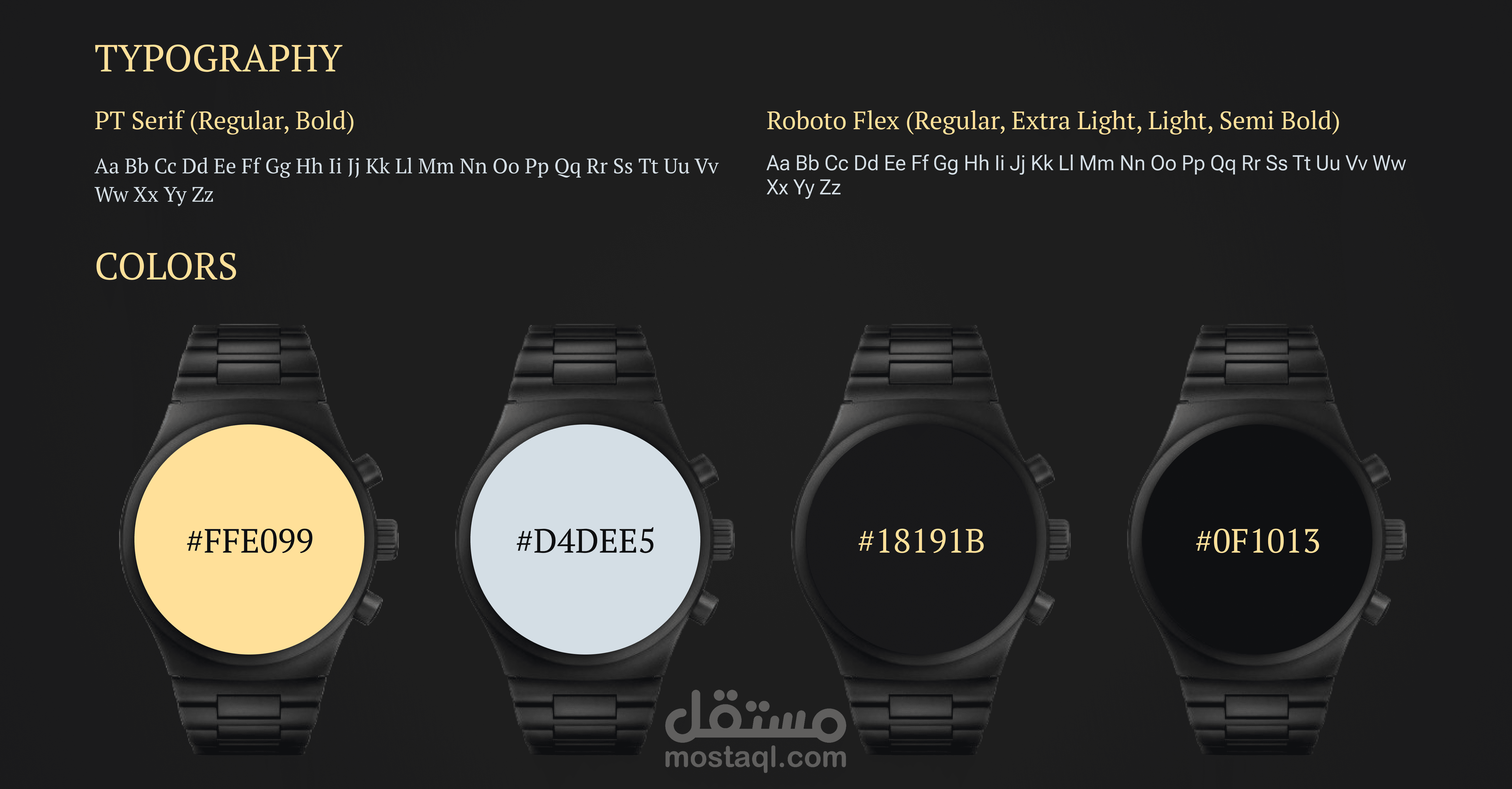 اخترت لوحة ألوان بسيطة وعالية التباين تتكون أساسًا من الأسود والذهبي مع لمسات من الفضي، لتعبر عن الفخامة والرُقي والأناقة الدائمة.