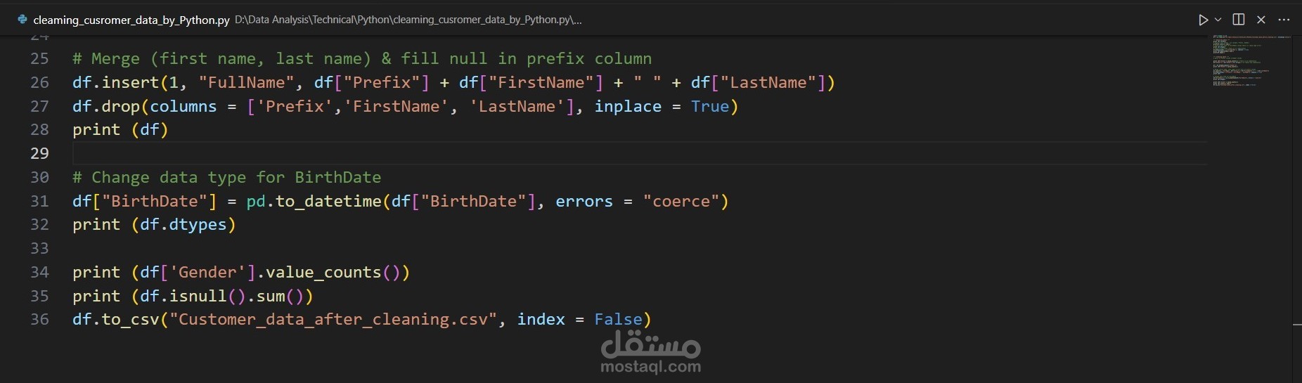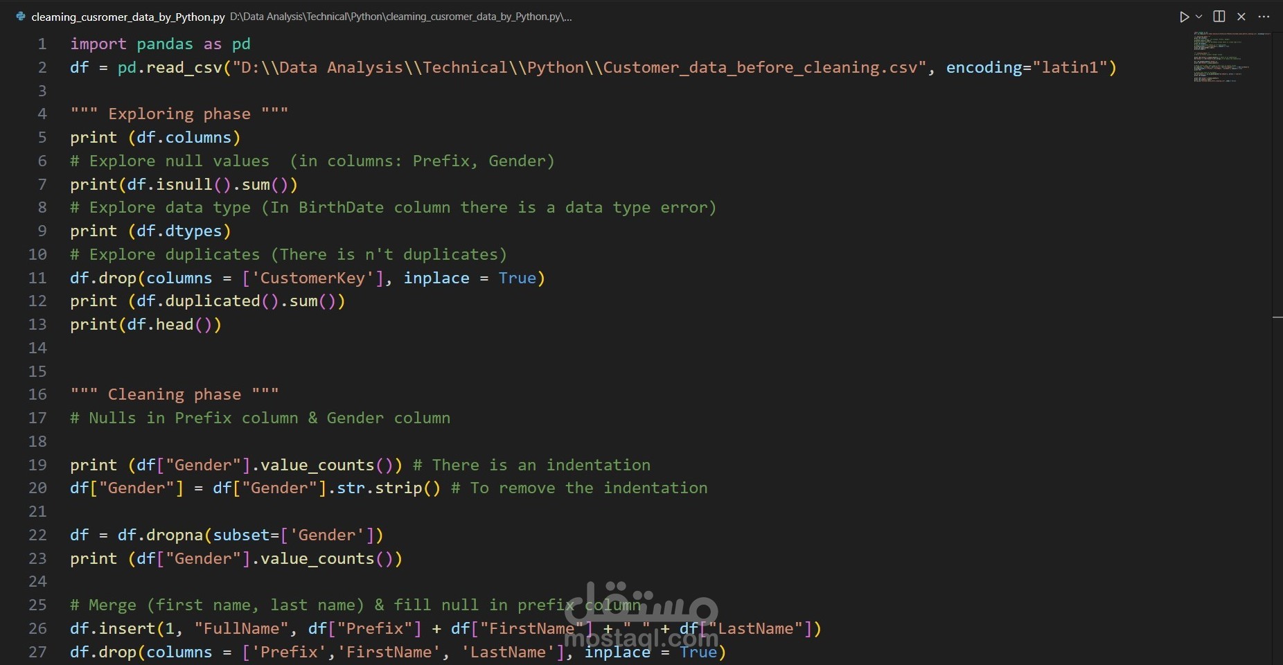 في هذا المشروع قمت بتنفيذ مراحل تنظيف البيانات باستخدام Python كما يلي: