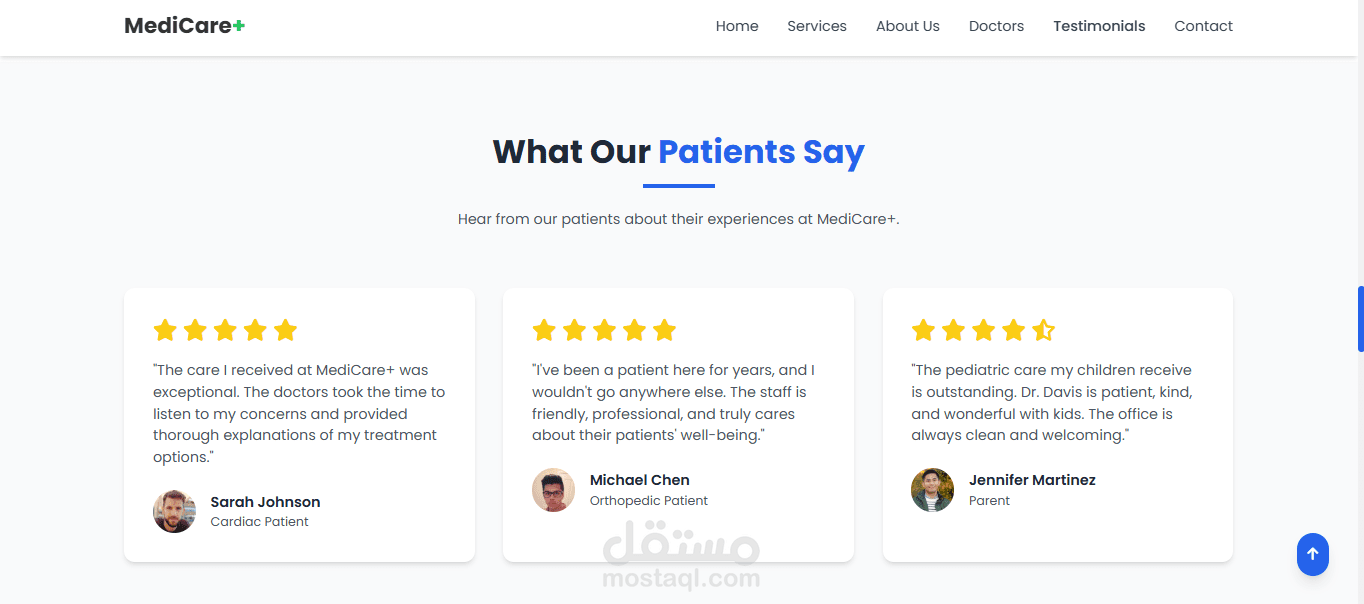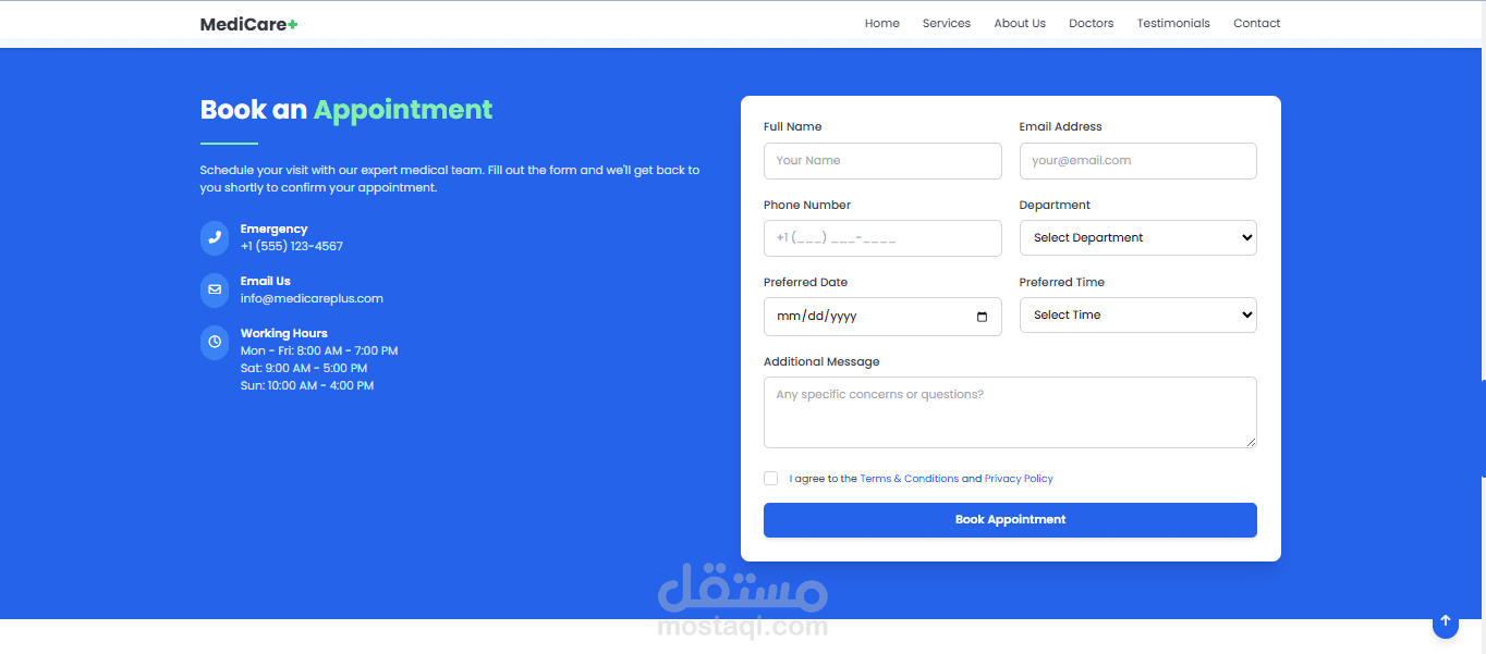 تصميم وتطوير صفحة هبوط احترافية لعيادة طبية بتصميم عصري وجذاب، بألوان هادئة تناسب المجال الطبي (الأزرق – الأبيض – الأخضر الفاتح).