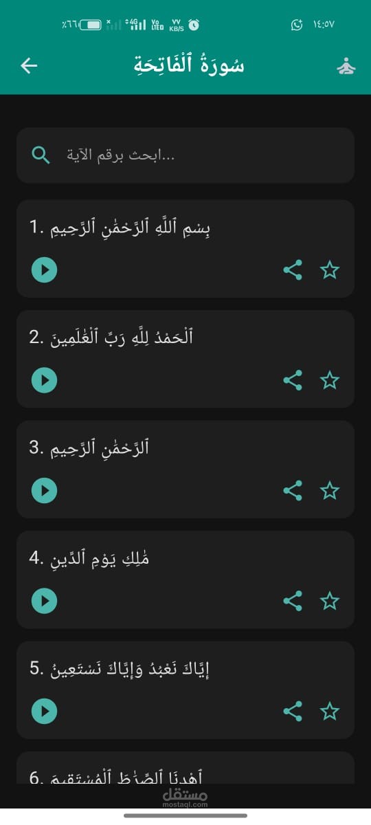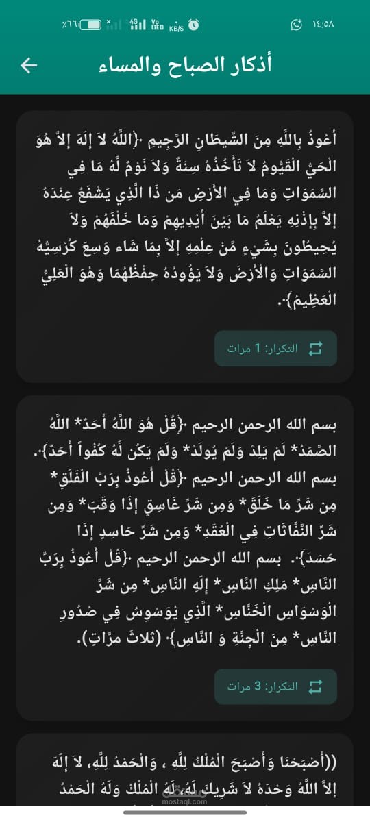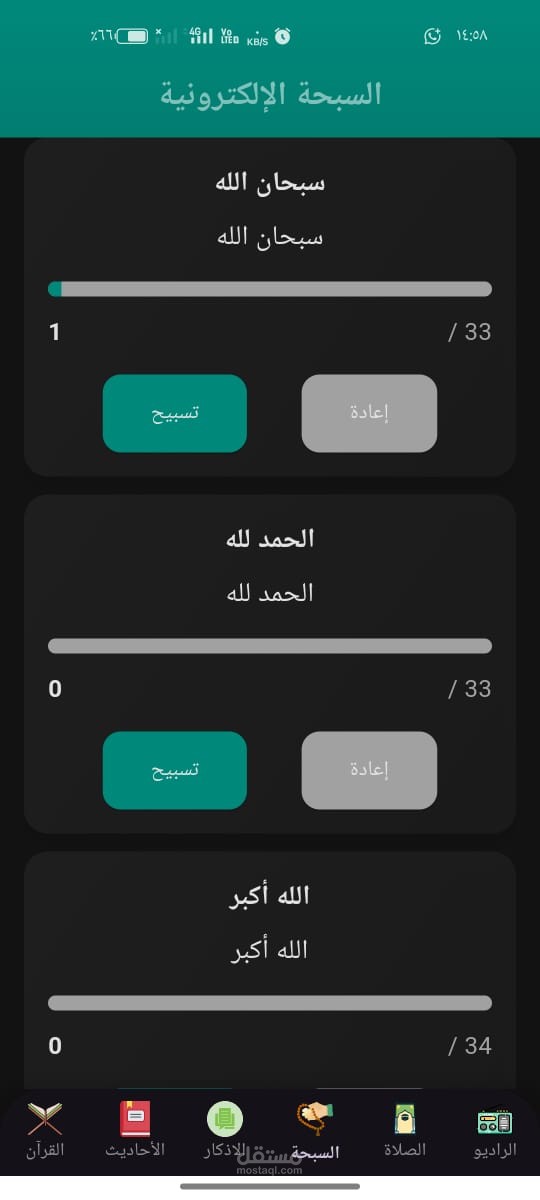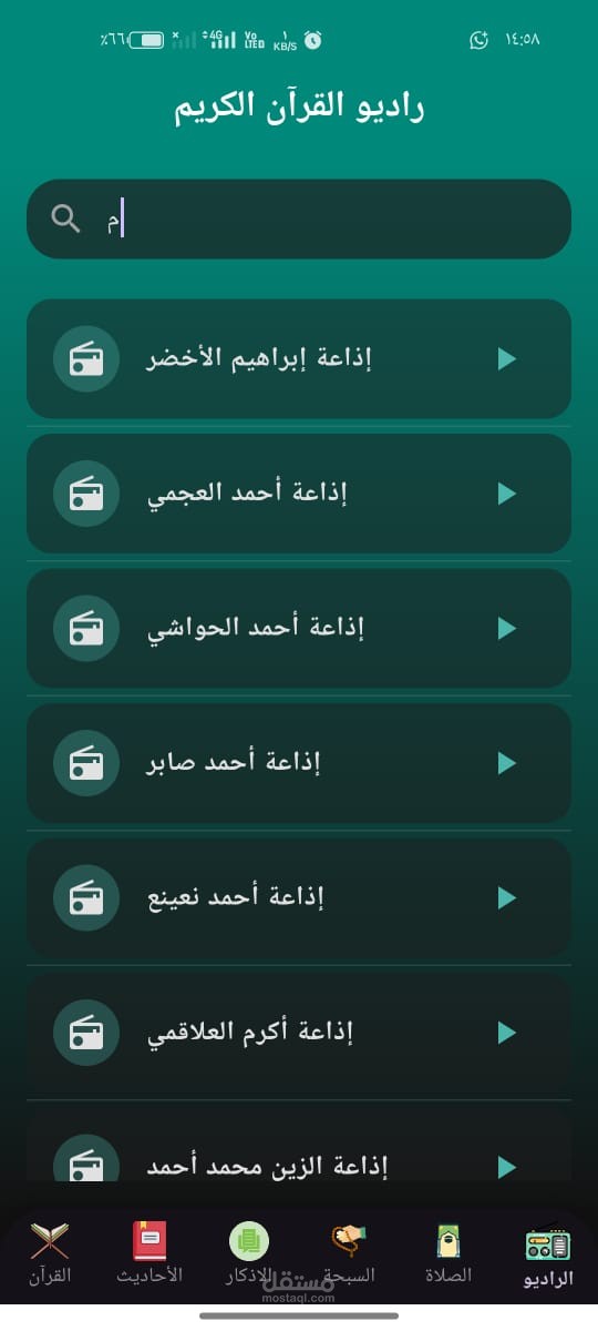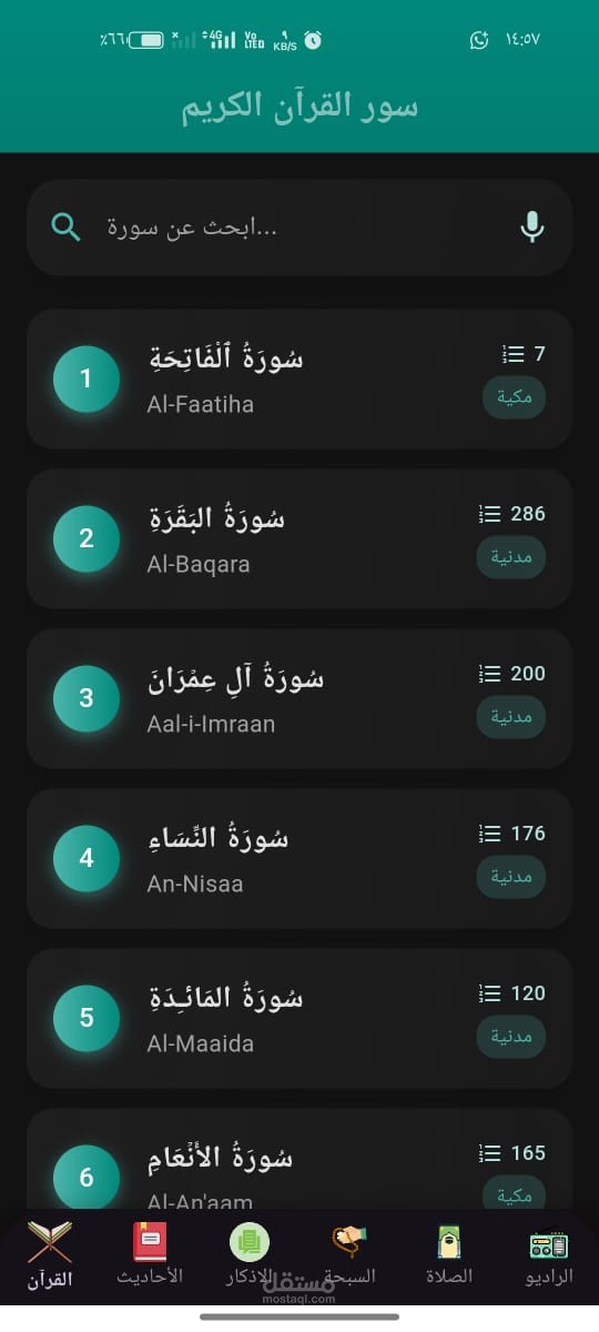 دوري: تصميم الواجهة، تنفيذ شاشة القرآن والأذكار، إدارة الحالة.