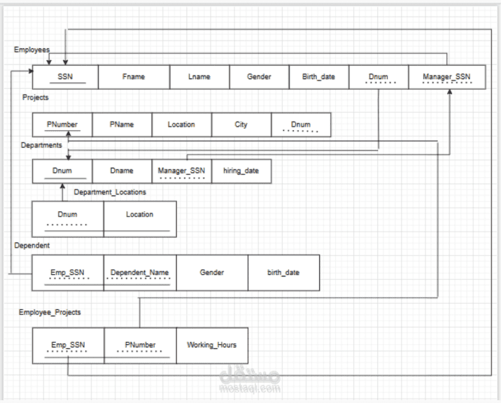 بالاضافة الى mapping دي بتمثل شركة فيها موظفين بينتموا لأقسام، كل قسم له مدير ومواقع متعددة، والمشاريع مربوطة بالأقسام. الموظفين ممكن يشتغلوا على مشاريع متعددة بعدد ساعات معينة، وكمان ممكن يكون ليهم تابعين (Dependents).