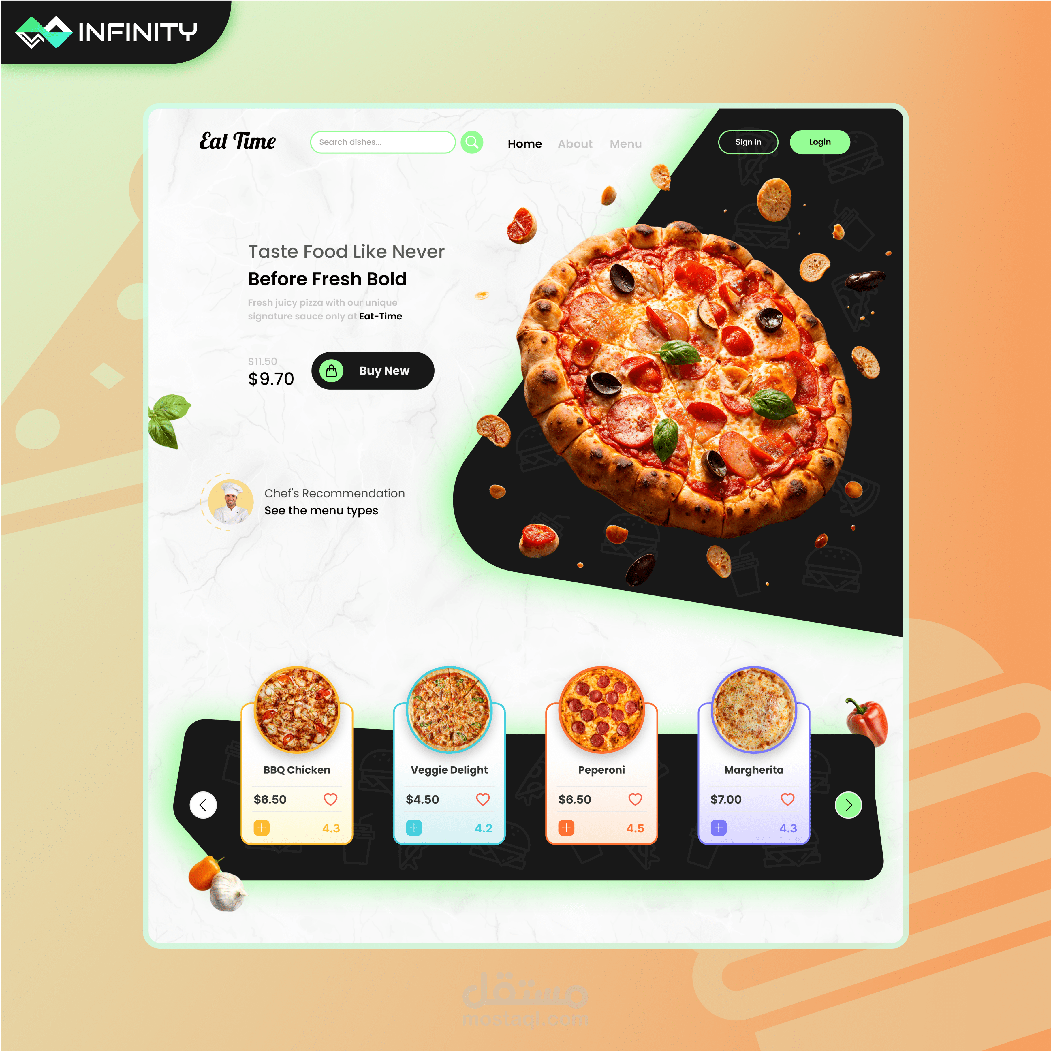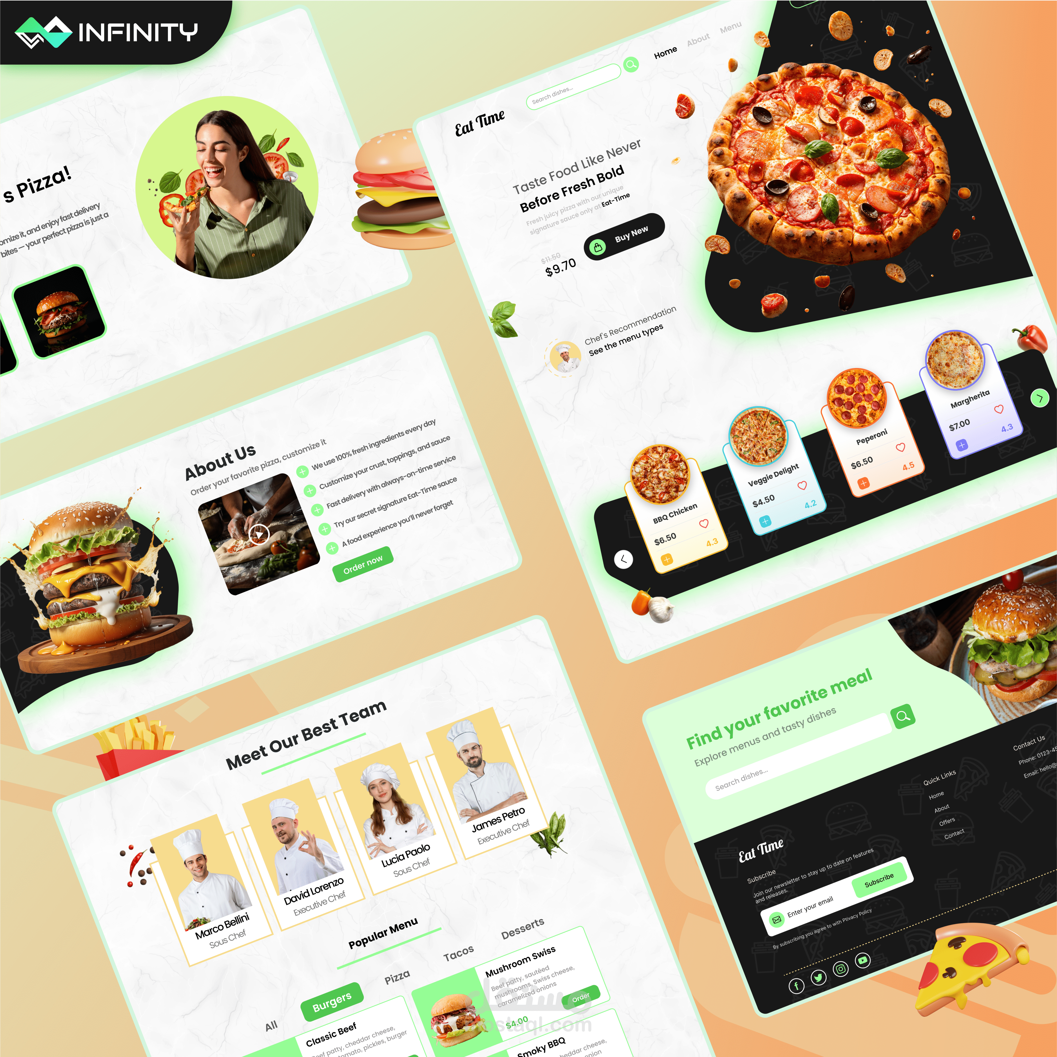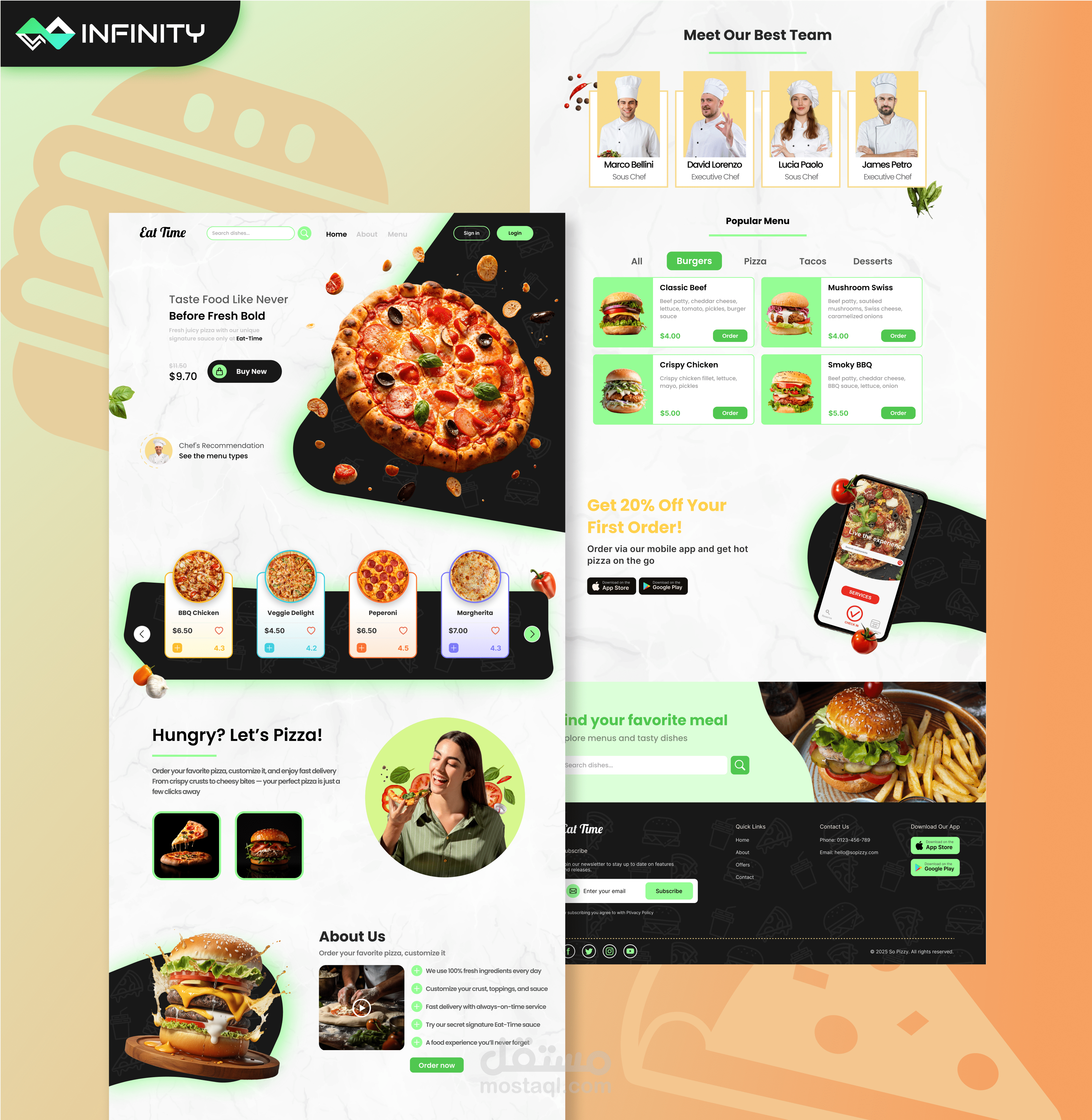 التصميم يدمج بين صور عالية الجودة للأطعمة أزرار واضحة لـ Call-to-Action، وأقسام منظّمة جيدًا لتشجيع المستخدمين على Online Ordering وزيادة Customer Engagement.