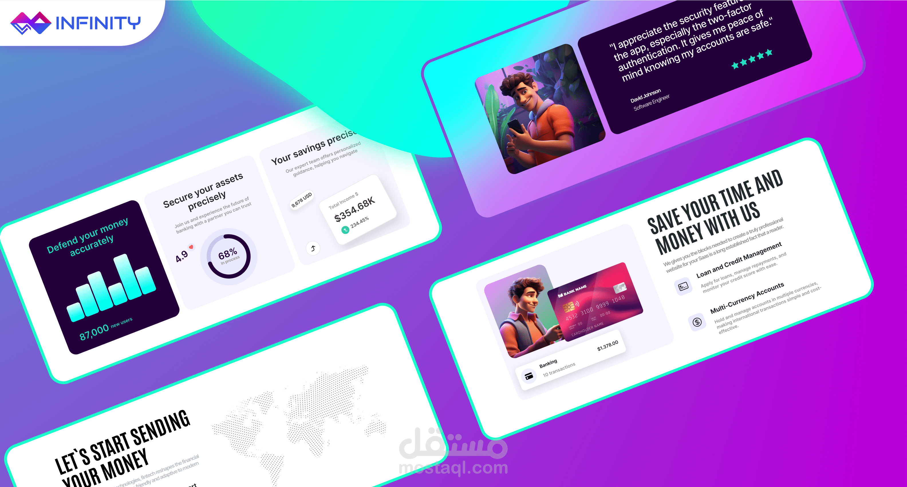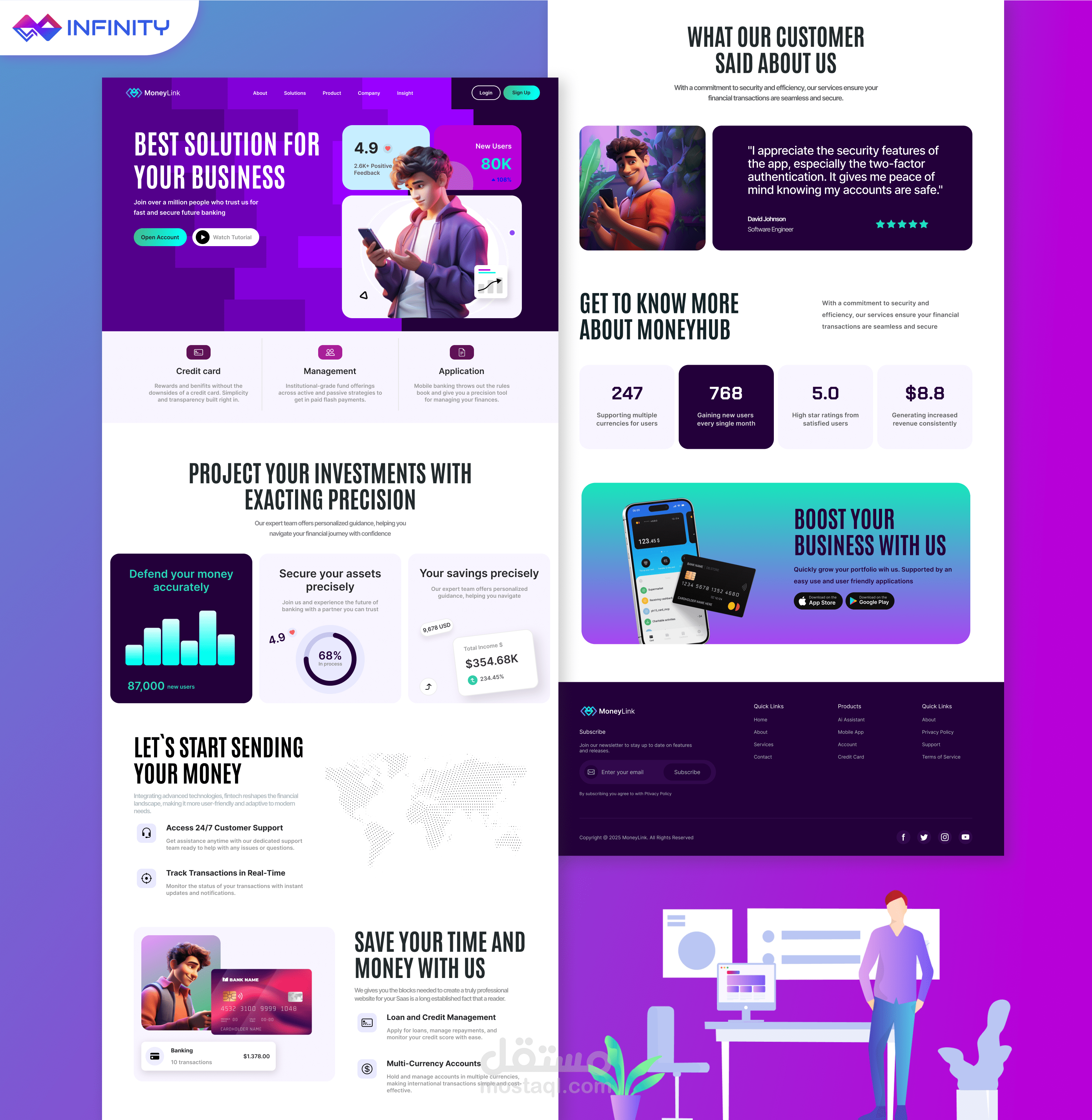 قمت بتصميم Landing Page متكاملة لتطبيق Digital Banking يُسمى MoneyLink. الصفحة تعرض مميزات التطبيق بشكل واضح وبسيط و User-friendly مثل: Money Management، Multi-currency Support، Security، وكل ما يحتاجه المستخدم قبل عملية الـ Sign up.