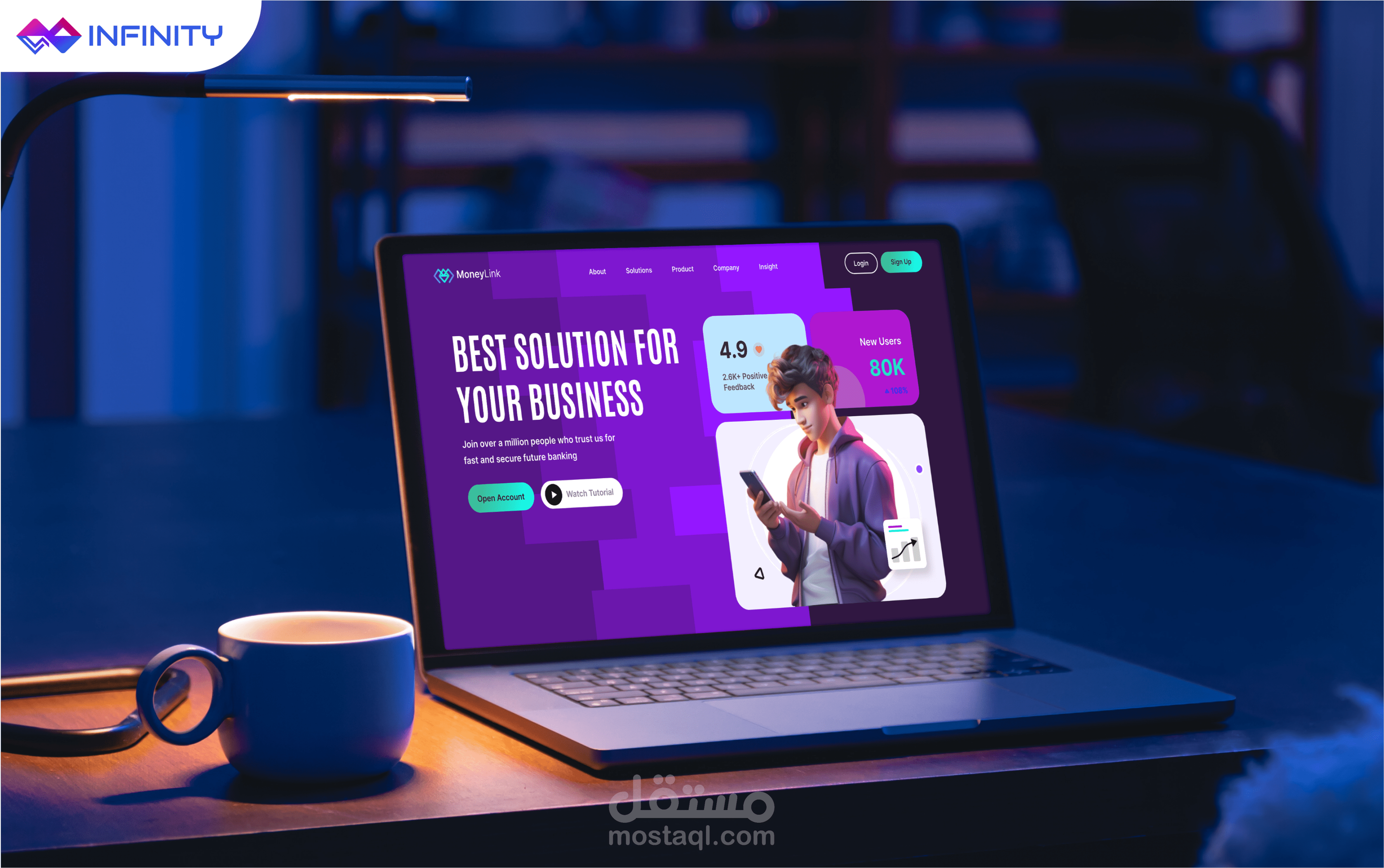 ركزت على إنشاء تصميم حديث وجذاب بصريًا يعمل بسلاسة على Desktop. كل عنصر في الصفحة تمت صياغته بعناية لتشجيع المستخدمين على فتح حساب.