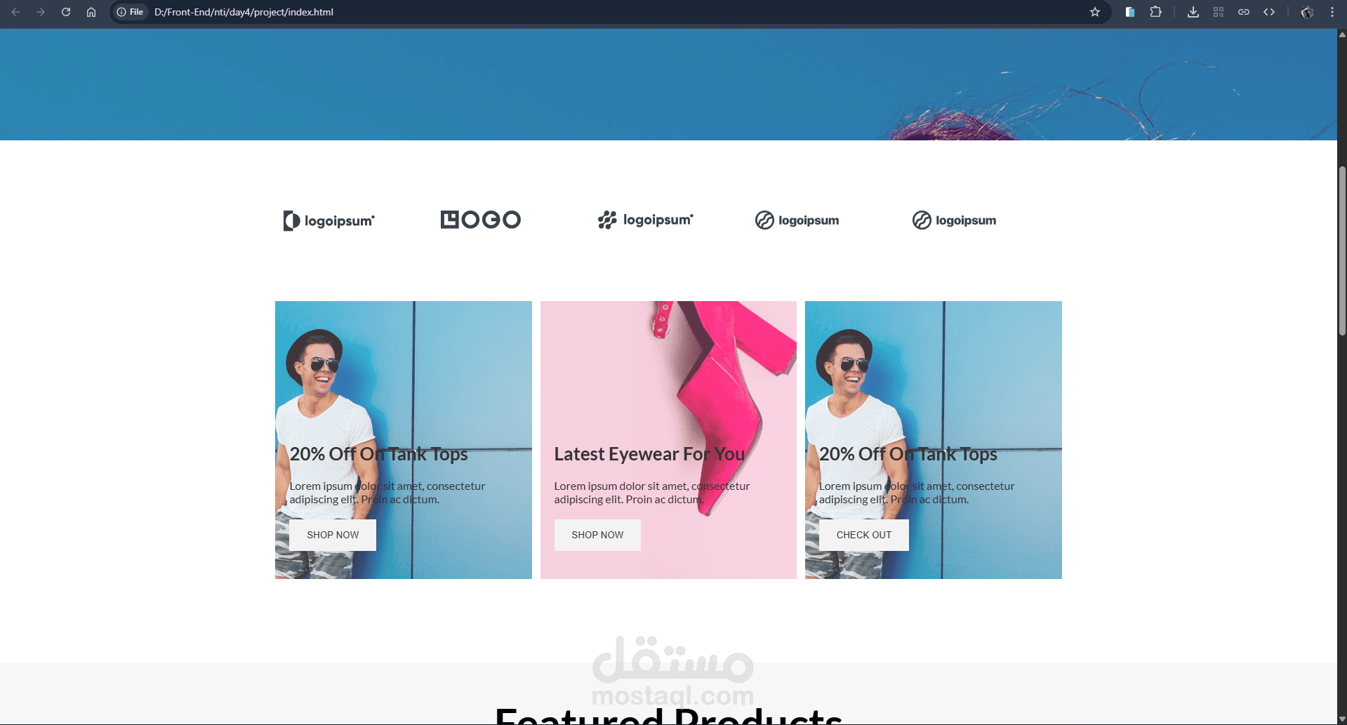 موقع المتجر هو نموذج لمتجر إلكتروني بسيط قمت بتصميمه باستخدام HTML وCSS فقط. الموقع بيحتوي على صفحة رئيسية جذابة تعرض منتجات مع خصومات وصور واضحة، بالإضافة إلى أقسام مخصصة للرجال والنساء والإكسسوارات. التصميم متجاوب ومنظم بحيث يسهل على المستخدم التنقل بين الصفحات والوصول للمنتجات، كما أضفت في أسفل الموقع جزء يوضح مميزات المتجر مثل الشحن والجودة والعروض. الهدف من المشروع كان التدريب العملي على بناء واجهة متجر إلكتروني متكامل باستخدام أساسيات الـ Front-End بشكل احترافي وبسيط.