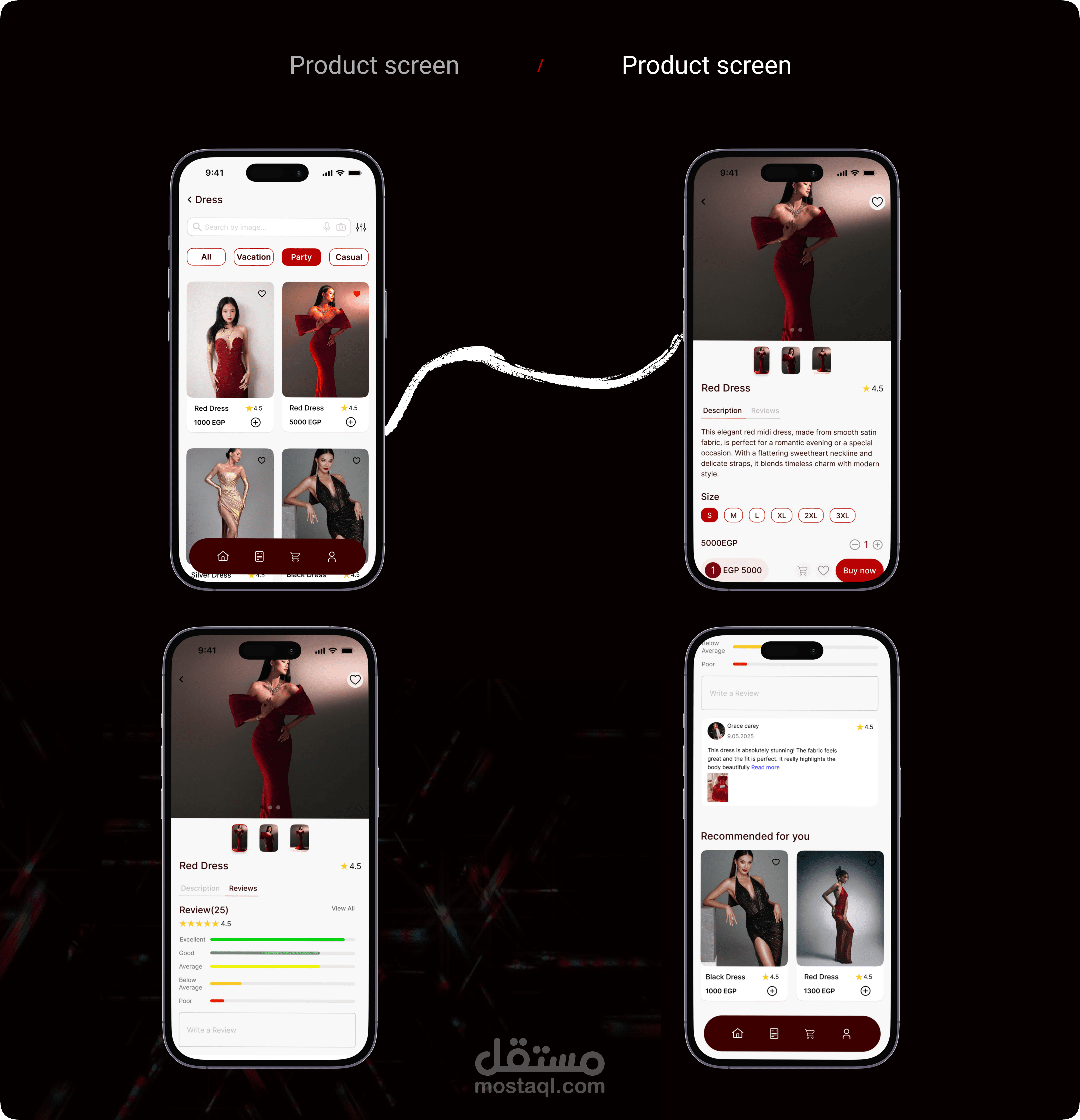 تطبيق تسوّق للفساتين، الأكسسوارات، والأحذية بتصميم أنيق وبسيط، يركز على عرض المنتجات بجودة عالية مع تجربة مستخدم سهلة وسلسة من التصفح لغاية الشراء.