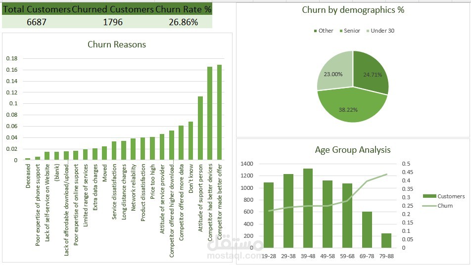 نسبة churn rate: 26.86%، وهي نسبة مرتفعة نسبيًا تشير إلى ضرورة دراسة الأسباب ومعالجتها