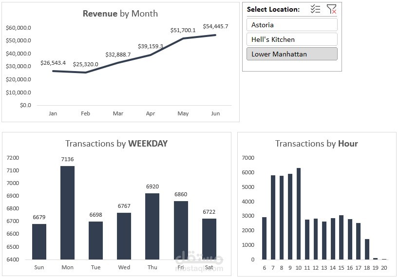 يمكن تحليل البيانات بحسب 3 مواقع: Astoria، Hell's Kitchen، وLower Manhattan.