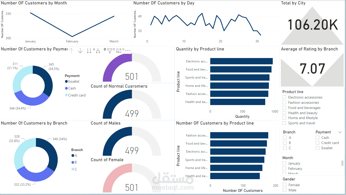 تحليل العمليات التشغيلية: حللت وسائل الدفع الأكثر شيوعًا (Ewallet و Cash) وراقبت متوسط تقييم الفروع، مما يساعد في تحسين تجربة العميل وجودة الخدمة.