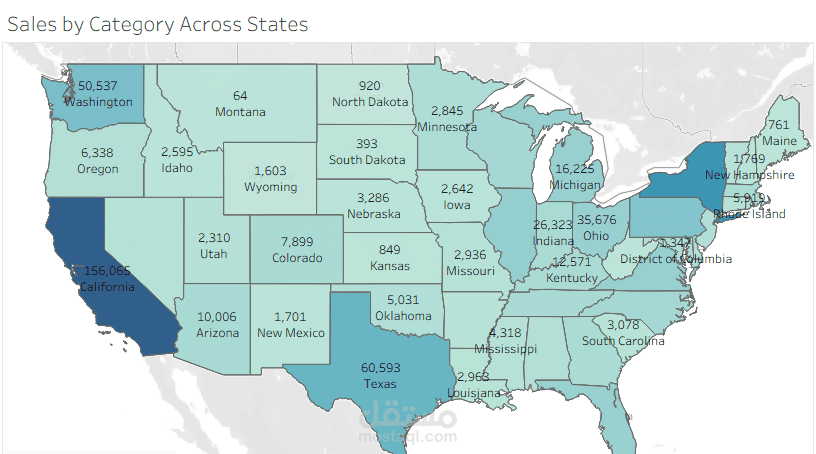 - أنشأت خريطة تفاعلية توضح حجم المبيعات في كل ولاية داخل الولايات المتحدة، مع عرض القيم داخل كل منطقة لسهولة المقارنة.