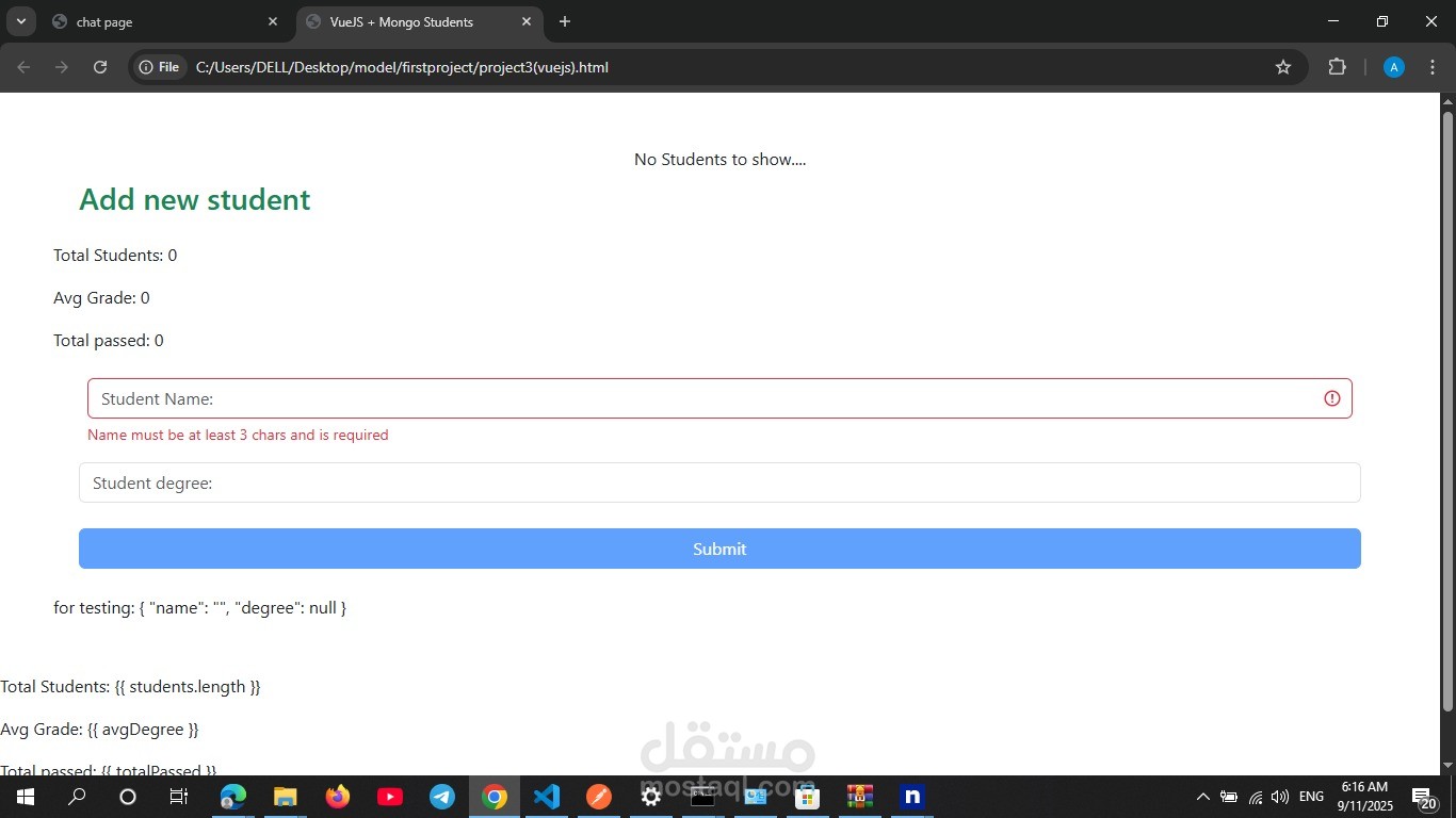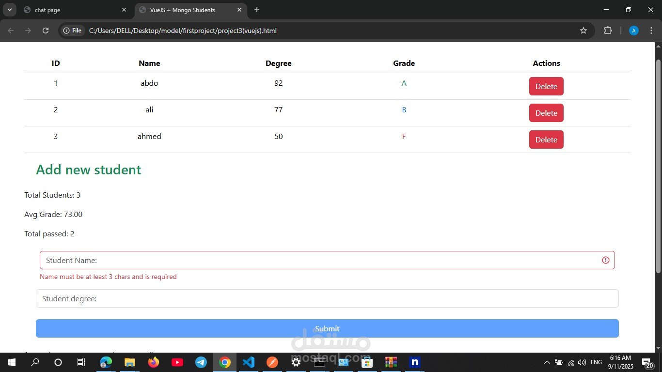 صفحة ويب نظام لايحة للطلاب حيث يضيف المستخدم الاسم والدرجه يظهر الطالب امامه مرقم بid خاص ويتم حساب تقديره وممكن تعدديل او حذفه مع توافر داتا بيز متجاوبه مع الصفحه المعروضه للمستخدم حيث المعلومات تحول اليها وممكن من خلالها التعديل او الحذف وينفذ فورا بالصفحه عند المستخدم