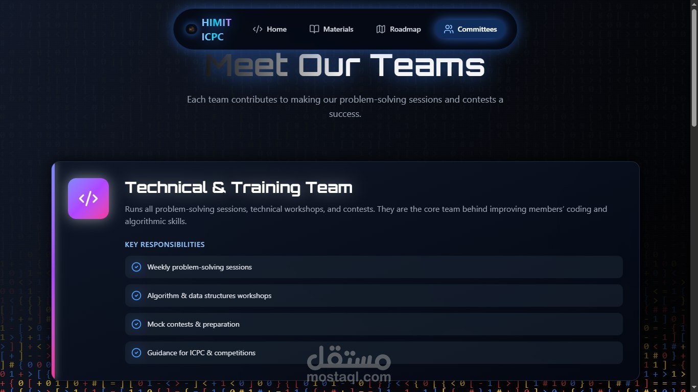 صفحات اللجان والفرق: تعريف بكل لجنة أو فريق، مع عرض مسؤولياتهم، مهامهم، وأبرز إنجازاتهم بطريقة جذابة وسهلة القراءة.