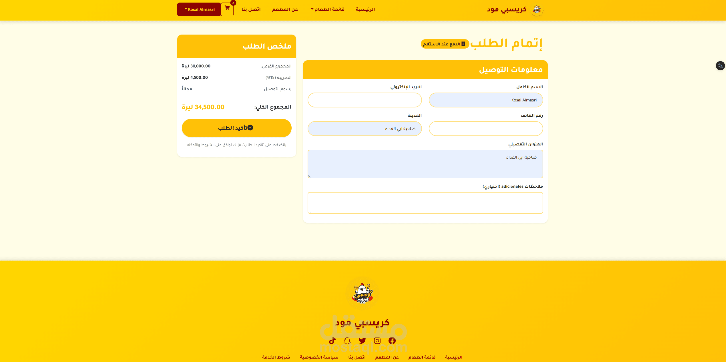 ملخص الطلب يوضح (إجمالي السعر، قيمة الضريبة، رسوم التوصيل "مجانية"، المجموع النهائي).