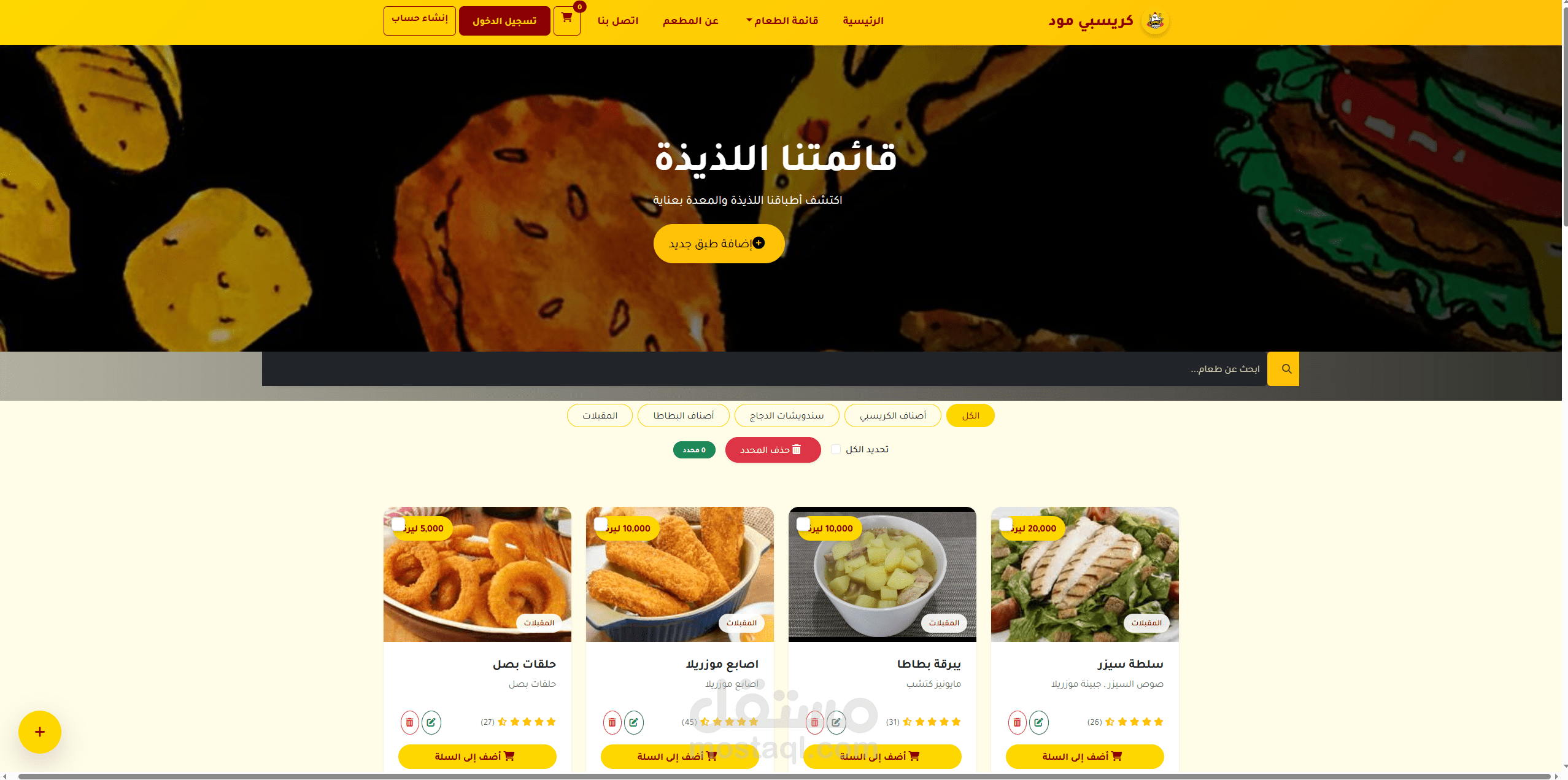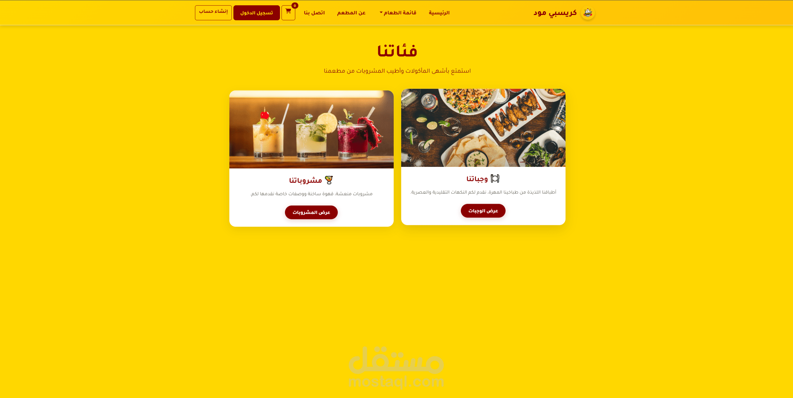 موقع المطعم هو منصة إلكترونية متكاملة لإدارة وعرض منتجات المطاعم بطريقة عصرية وسهلة الاستخدام، حيث يتيح للزوار تصفح الوجبات والمشروبات، إضافتها إلى السلة، وإتمام الطلب بخطوات بسيطة. يتميز الموقع بتصميم حديث وألوان جذابة (الأصفر الفاتح مع الأحمر الداكن) تجعله مختلفًا عن المواقع التقليدية.