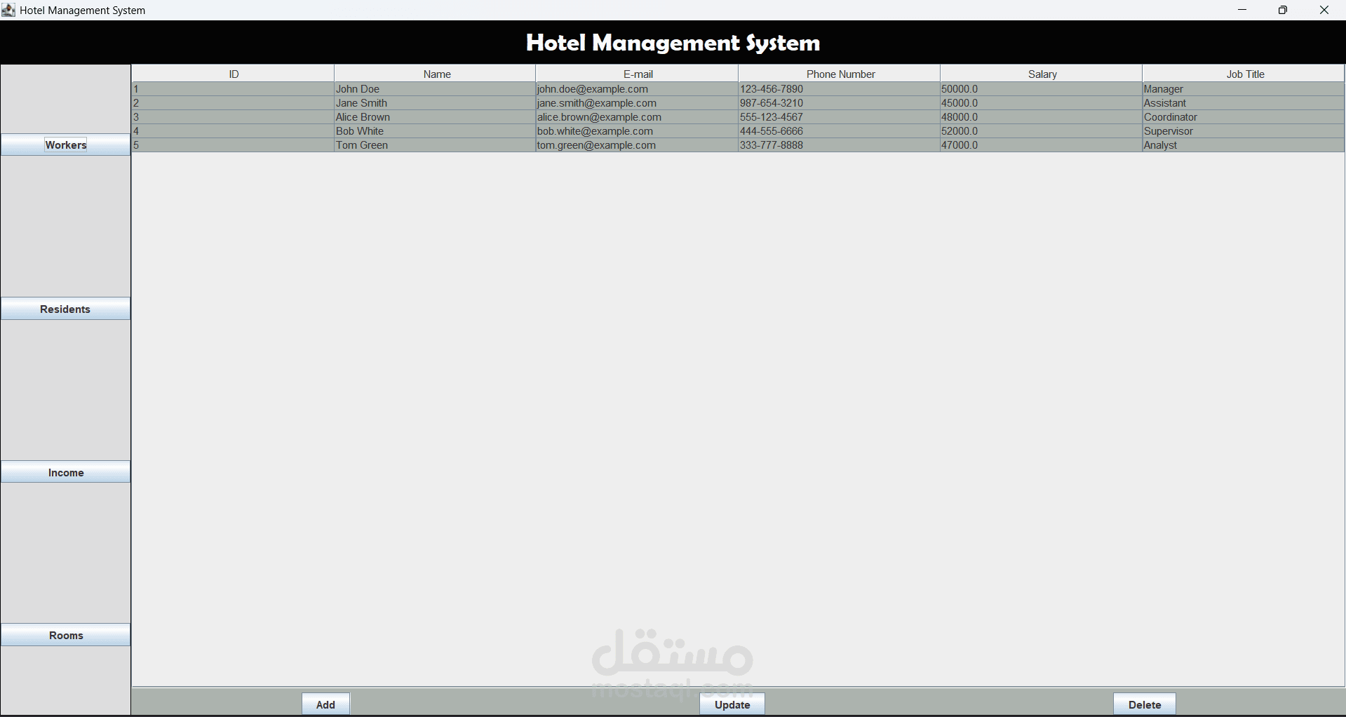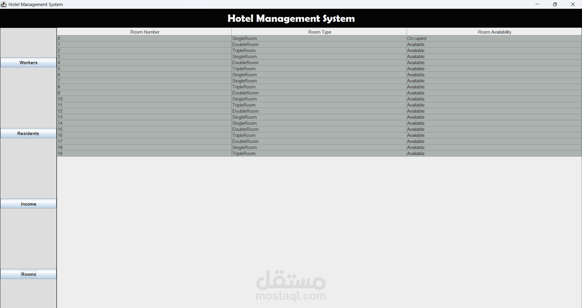 واجهة المستخدم الرسومية (GUI): يتميز النظام بواجهة مستخدم رسومية سهلة الاستخدام وتفاعلية لتسهيل إدارة العمليات اليومية للفندق.