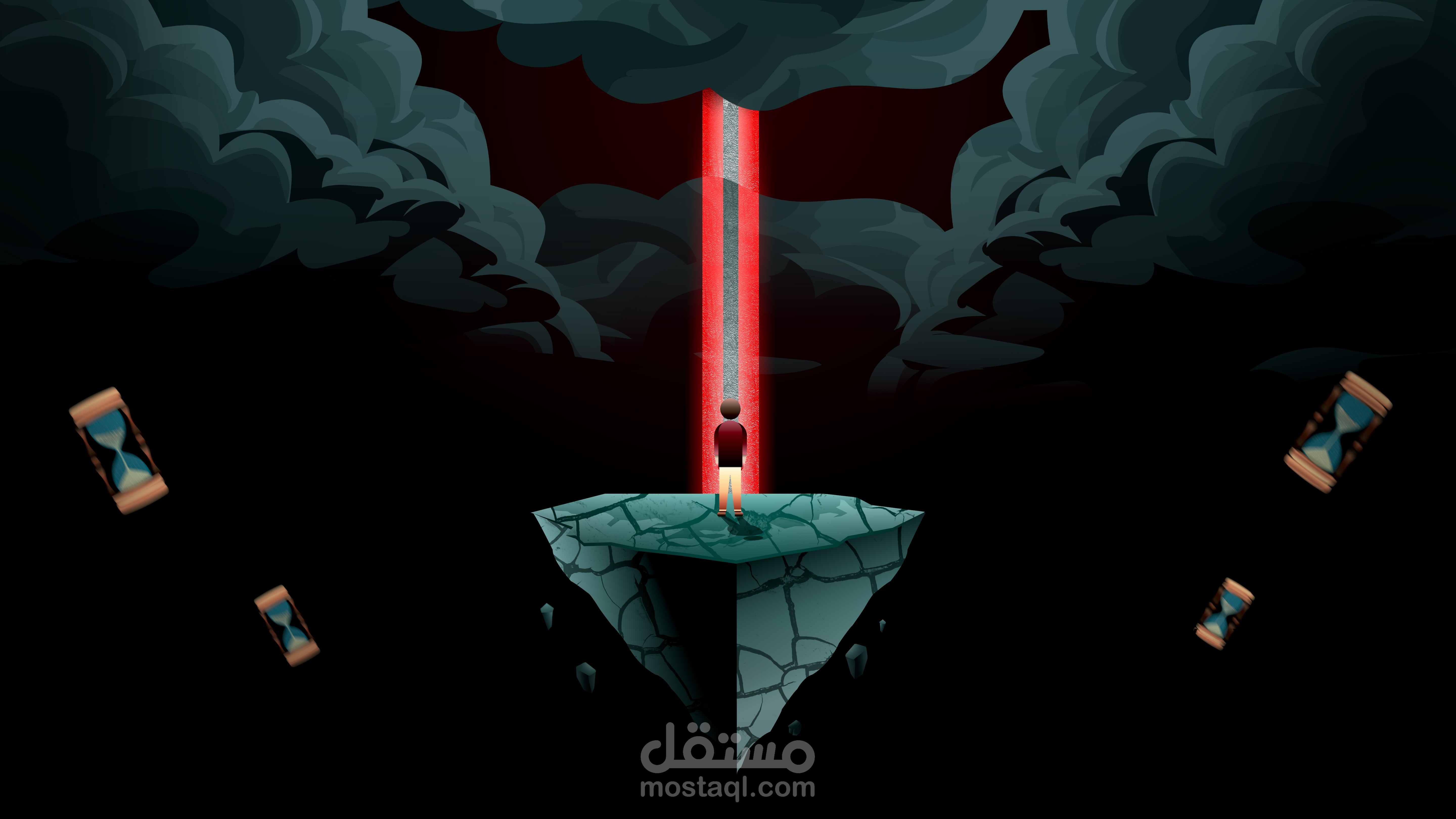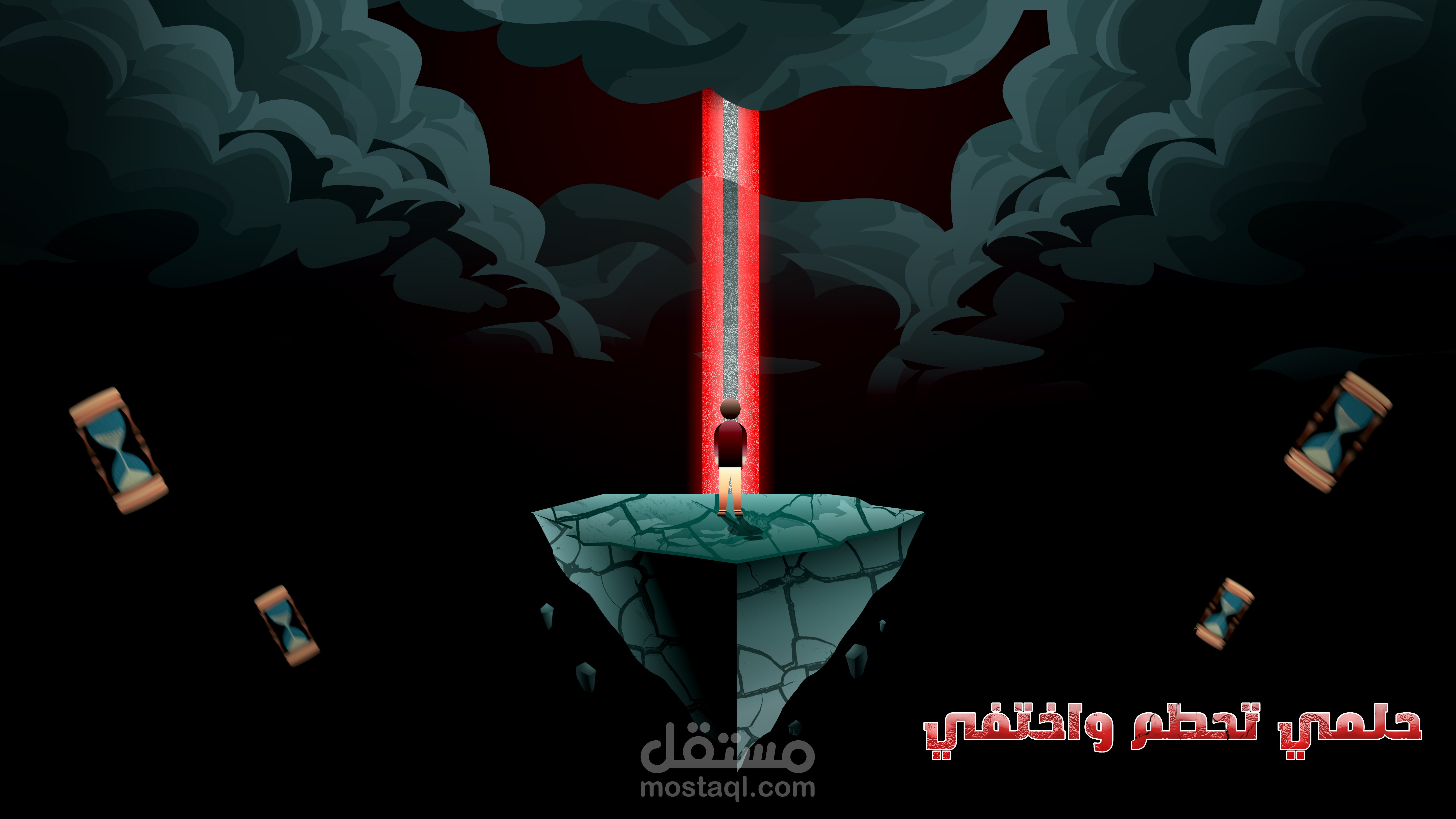 عمل فني سريالي تصوري يصوّر شخصية وحيدة تقف على صخرة متشققة تطفو في الفراغ، مضاءة بشعاع أحمر قوي يخترق سحب العاصفة الداكنة. تحيط بها ساعات رملية تطفو في الجو، ترمز إلى انهيار الزمن وتلاشي الأحلام. يجمع التصميم بين الرمزية والمشاهد الدرامية للتعبير عن مشاعر الانكسار والاختفاء.