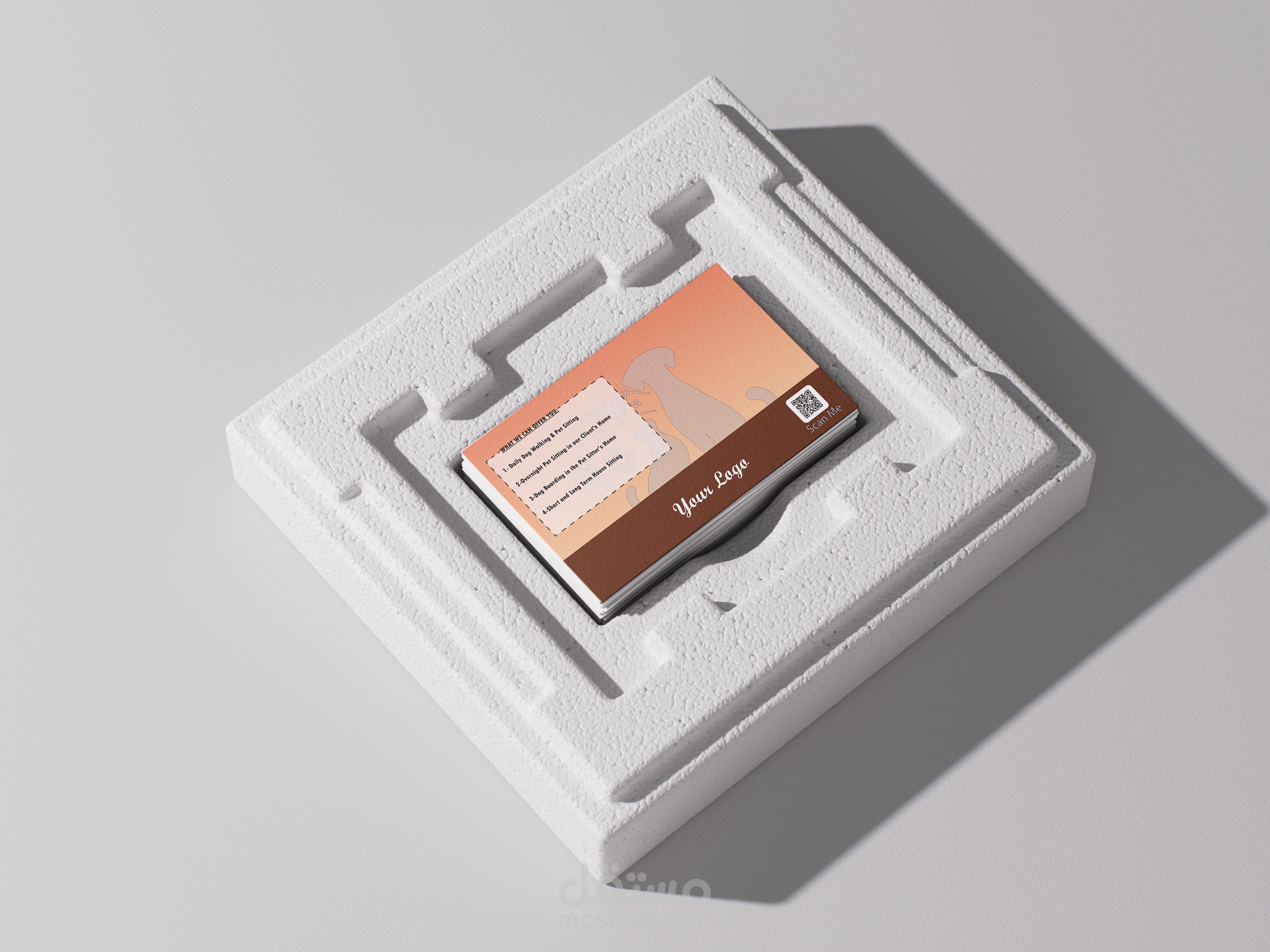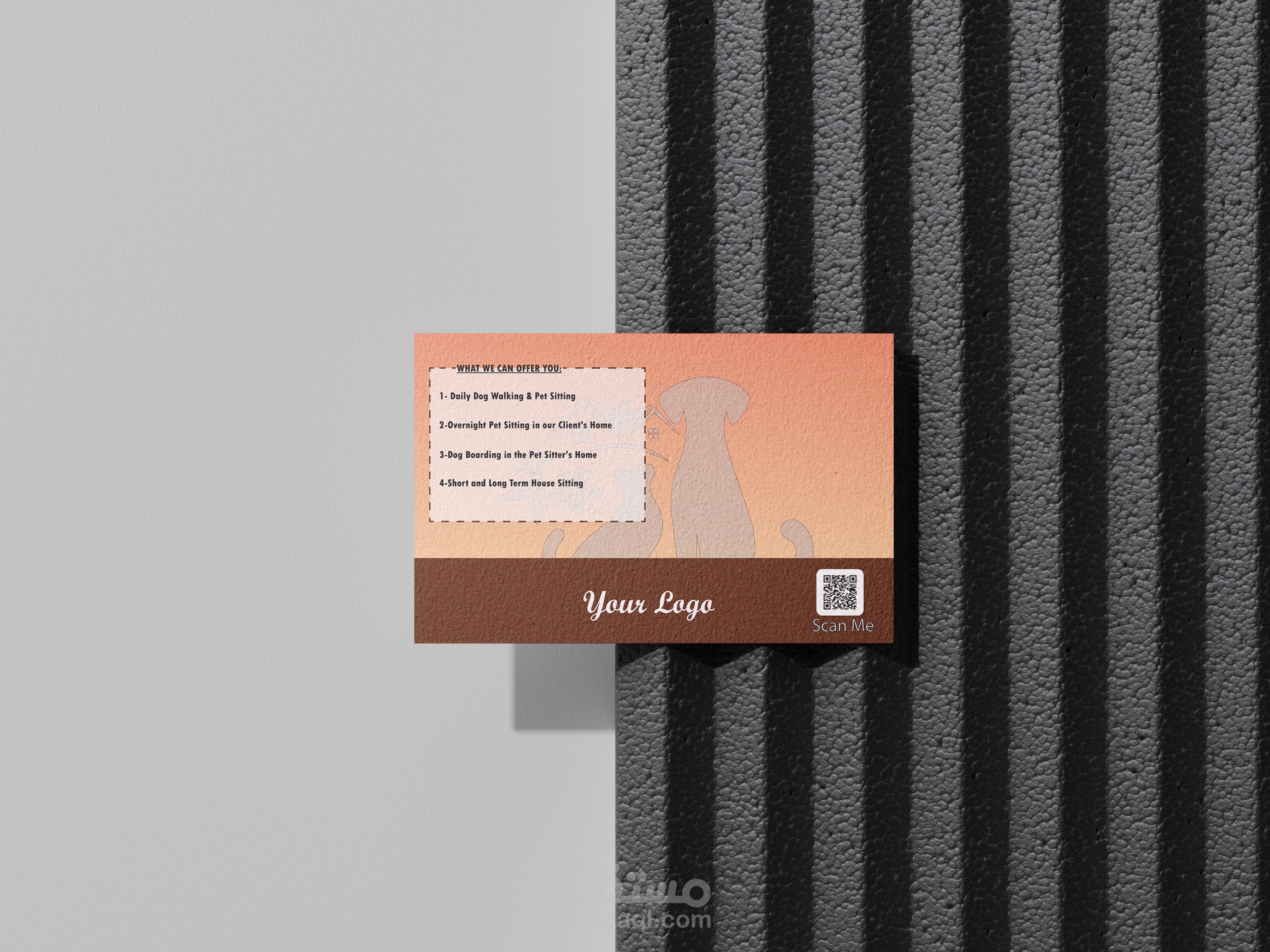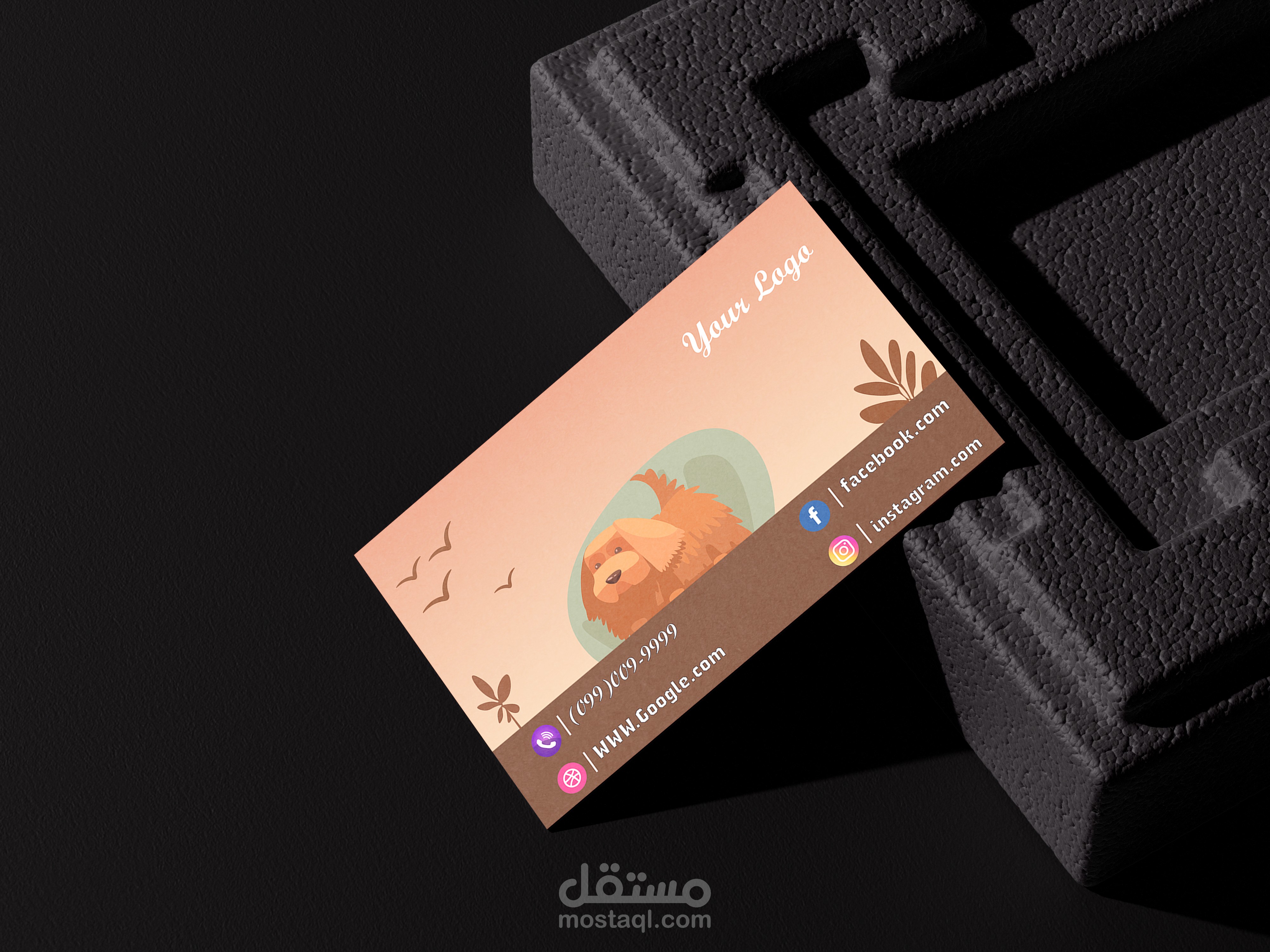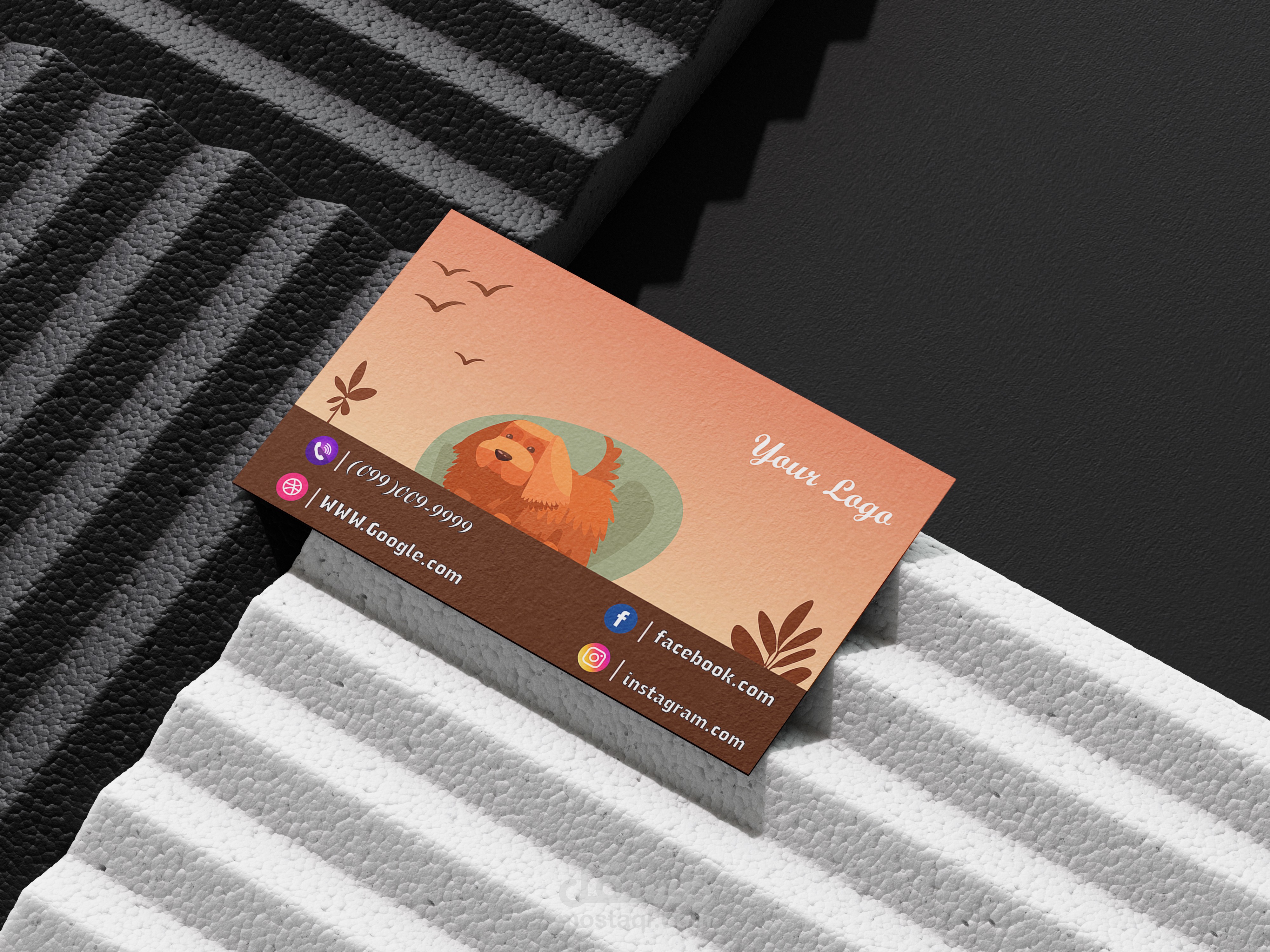 بطاقة أنيقة لمركز رعاية الحيوانات الأليفة تتميز بتصميم دافئ مستوحى من الطبيعة، مع رسمة لطيفة لكلب. تعرض البطاقة بوضوح معلومات الاتصال مع أيقونات وسائل التواصل الاجتماعي، وتتضمن مساحة مخصصة للشعار — مما يجعلها مثالية لإبراز العناية والاحترافية في خدمات رعاية الحيوانات.