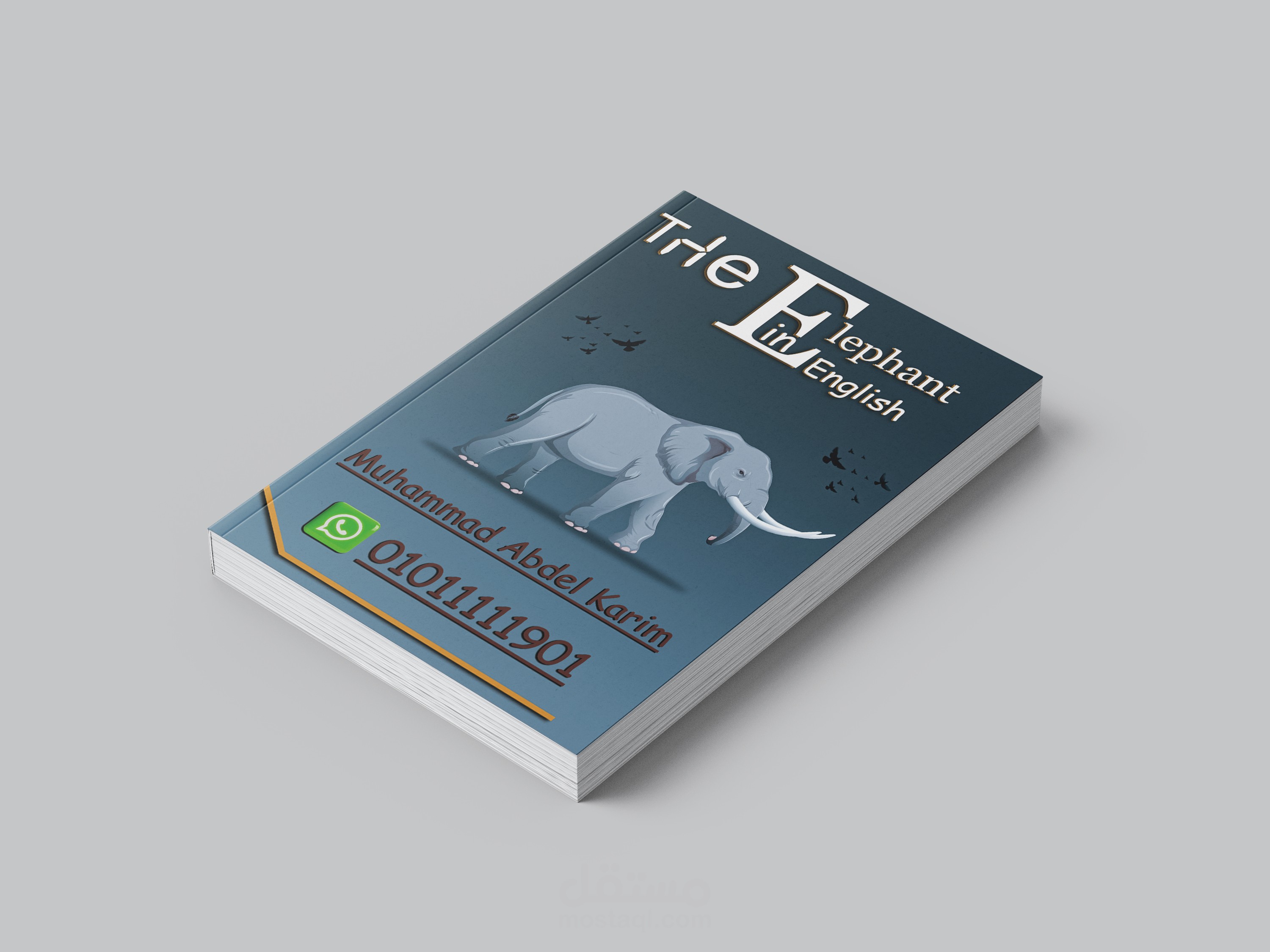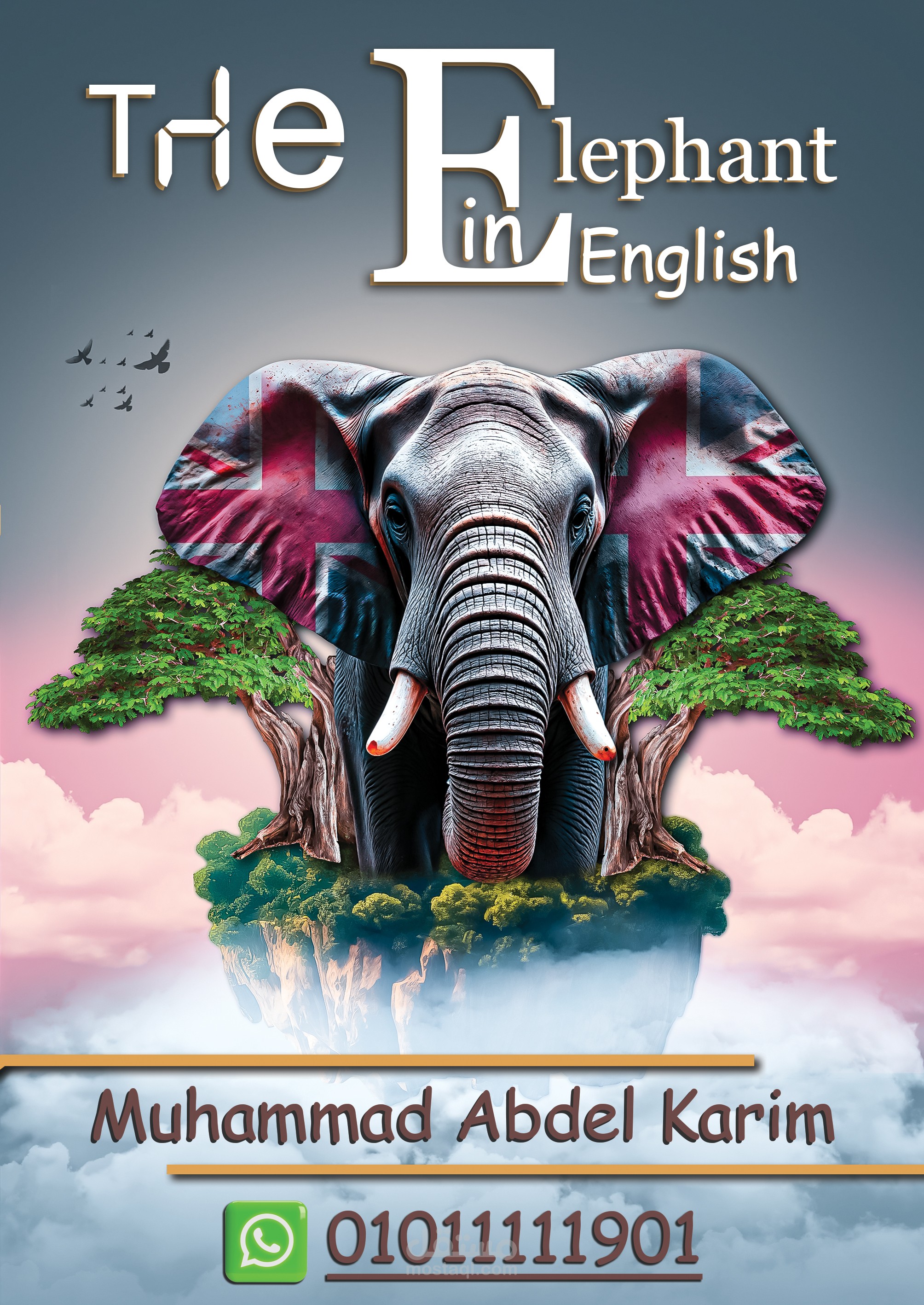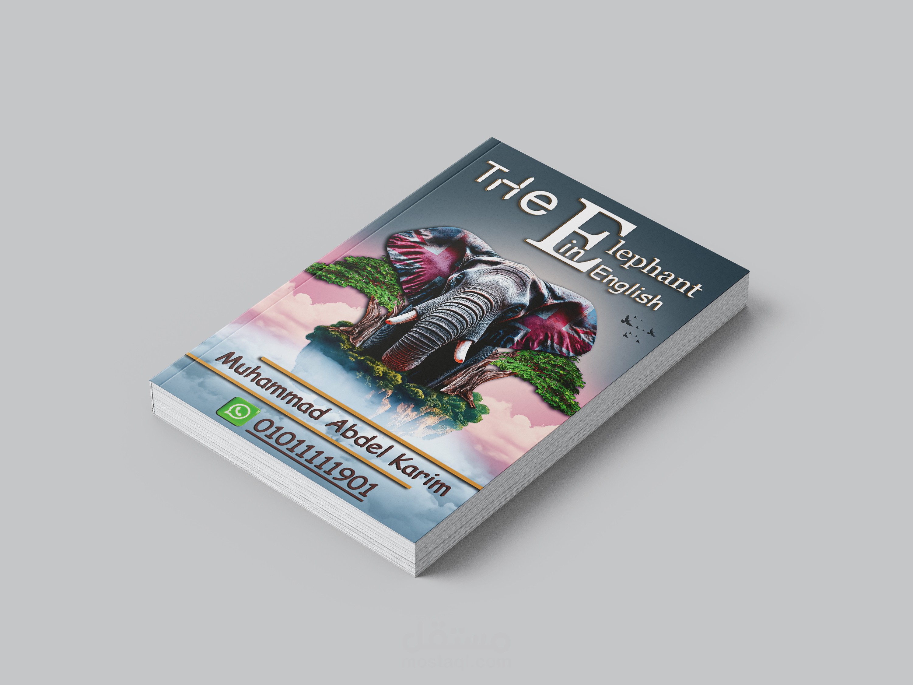 هذا التصميم هو غلاف لكتيّب دراسة لغة إنجليزية من إعداد معلم. يظهر العنوان "The Elephant in English" بشكل بارز بأسلوب typographic إبداعي. ويتميز الغلاف برسمة جذابة لفيل وسط مشهد طبيعي نابض بالحياة، مما يضفي طابعاً مشوّقاً ومليئاً بالخيال على المحتوى التعليمي.
