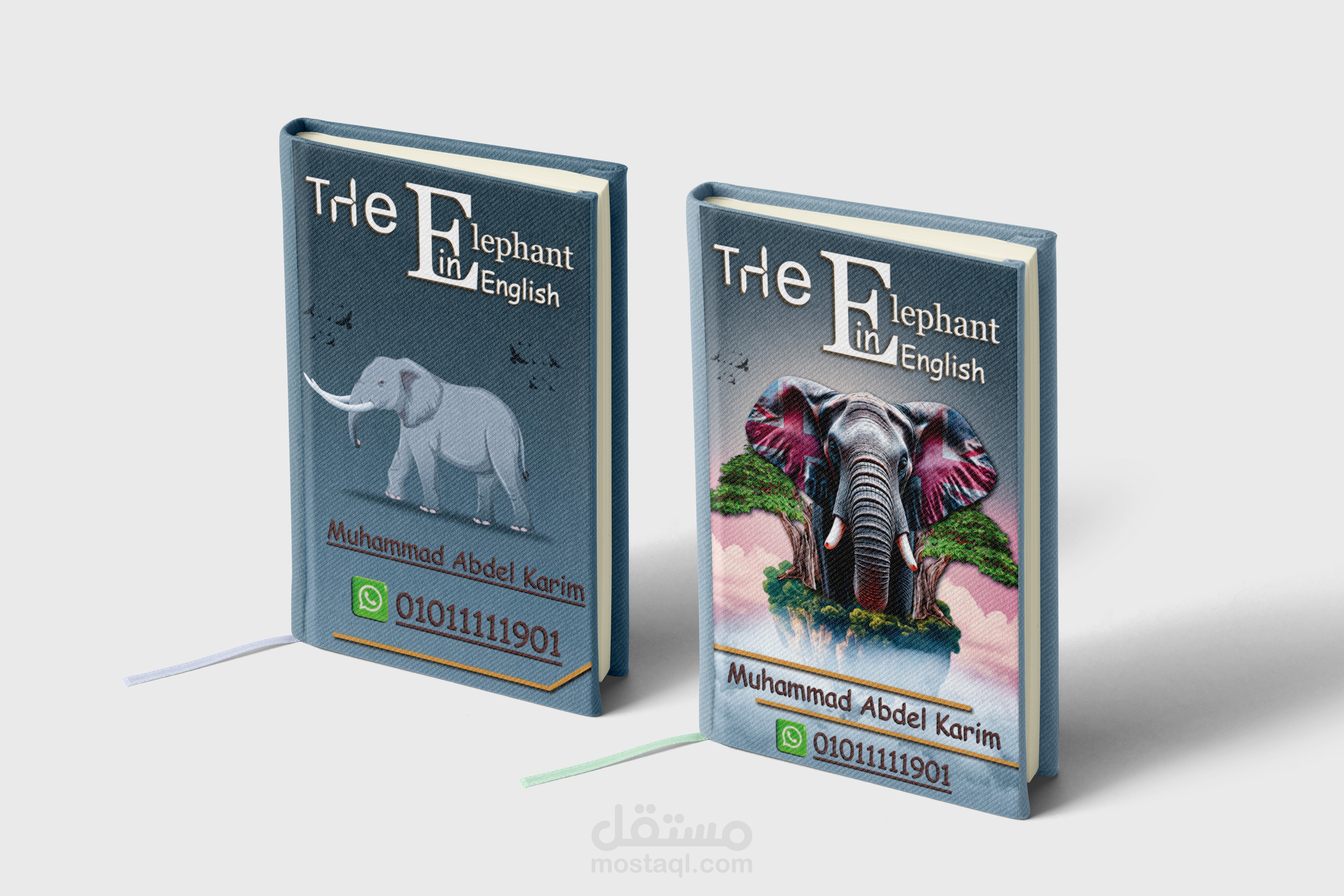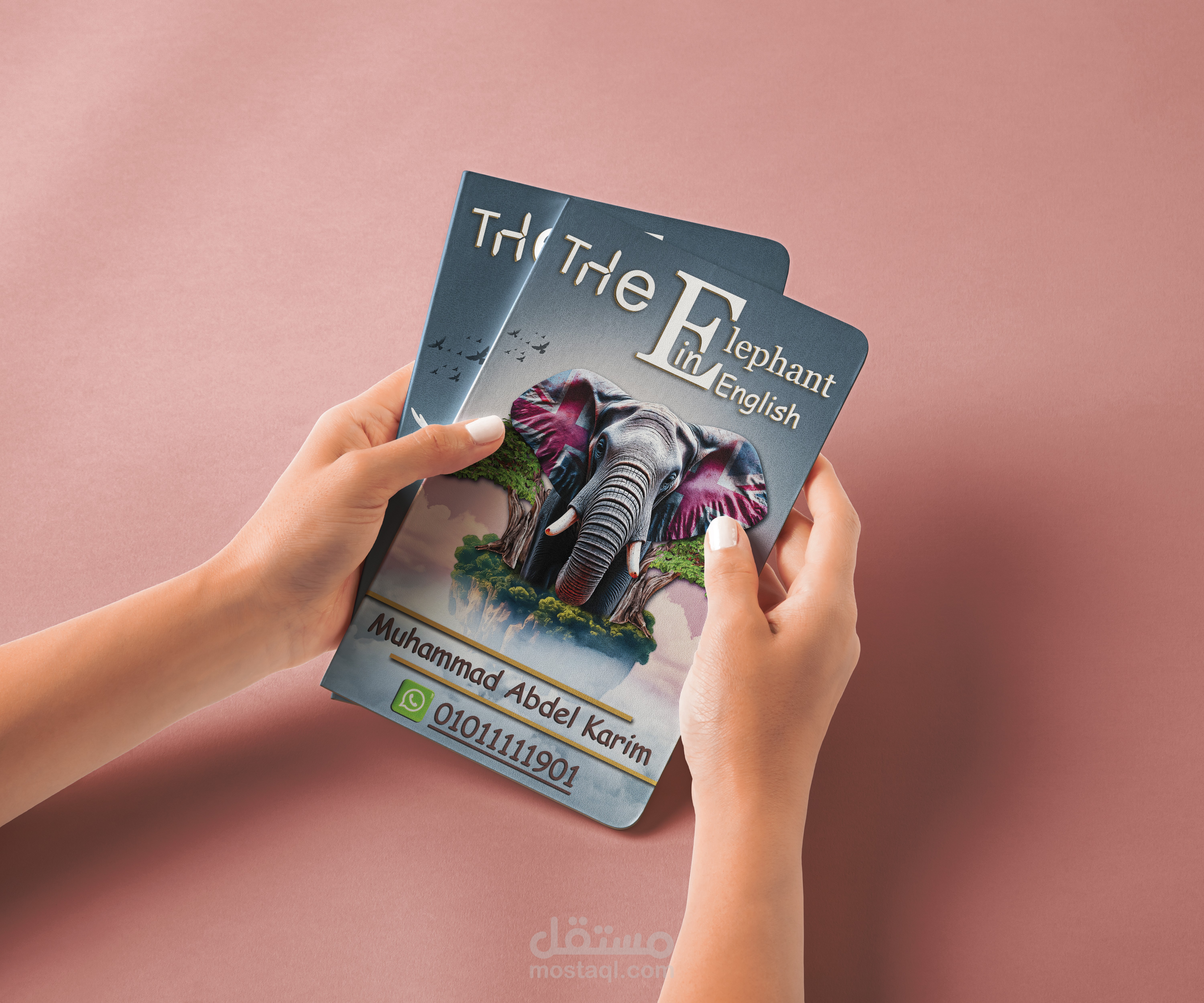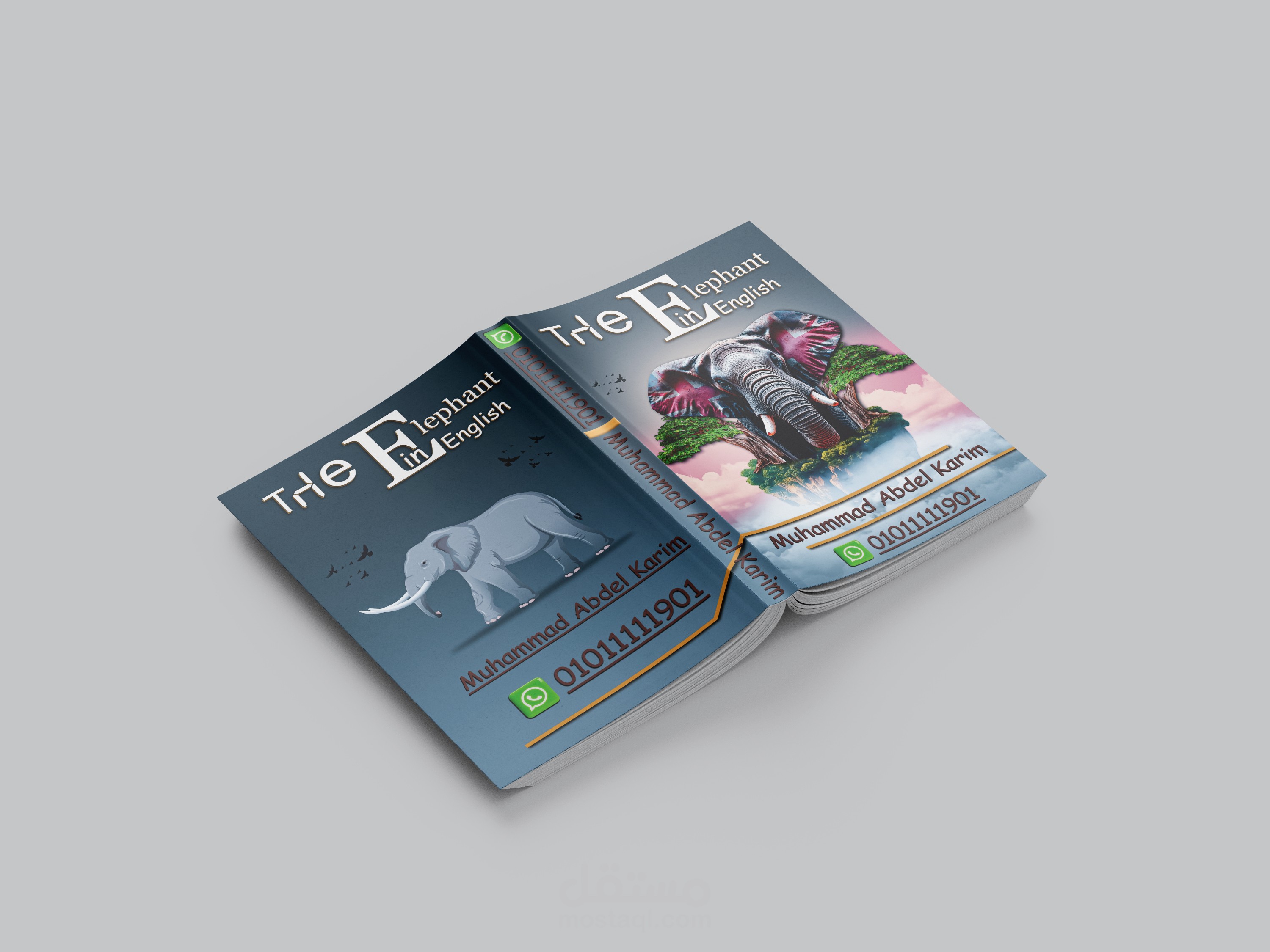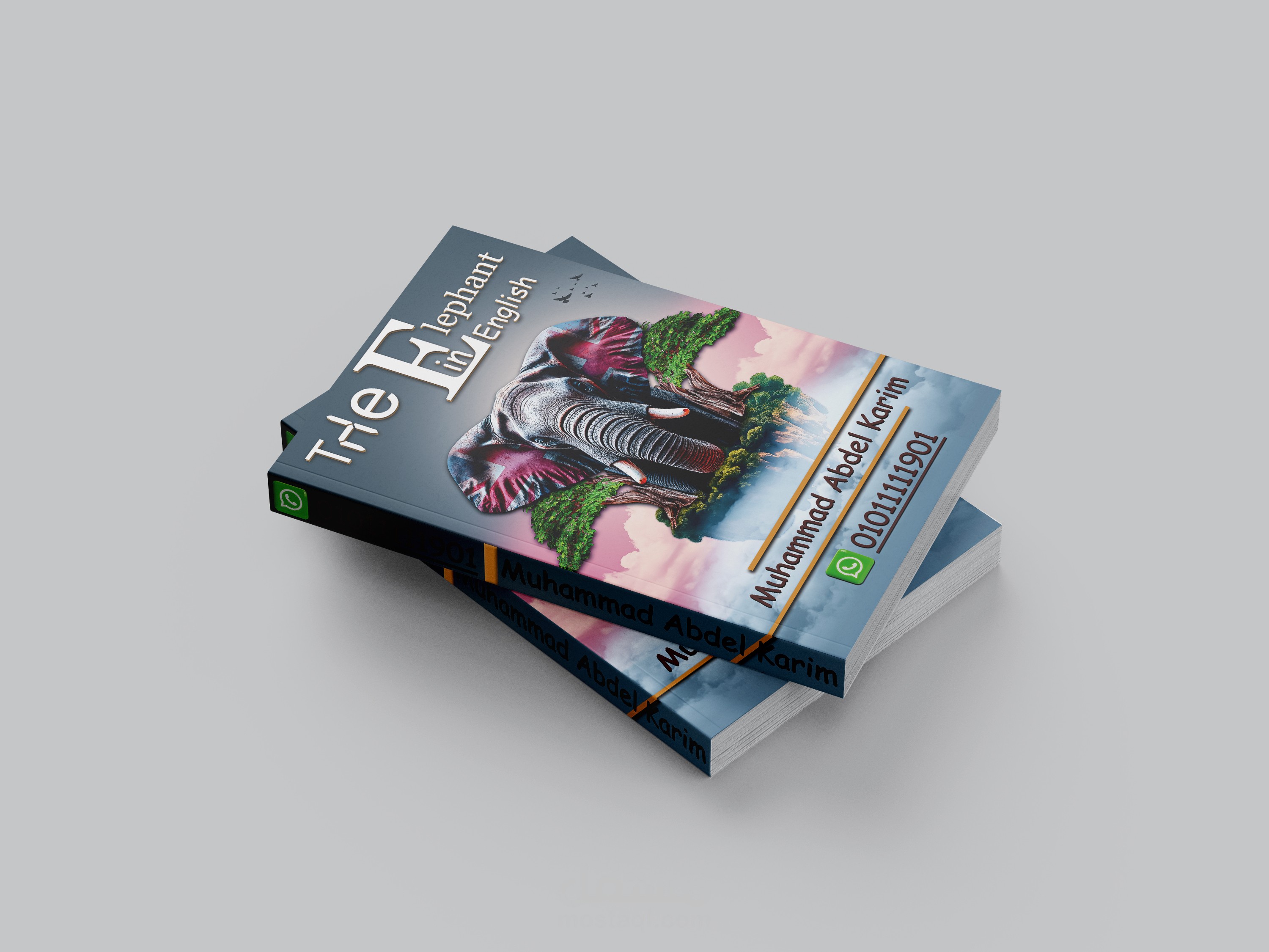 هذا التصميم هو غلاف لكتيّب دراسة لغة إنجليزية من إعداد معلم. يظهر العنوان "The Elephant in English" بشكل بارز بأسلوب typographic إبداعي. ويتميز الغلاف برسمة جذابة لفيل وسط مشهد طبيعي نابض بالحياة، مما يضفي طابعاً مشوّقاً ومليئاً بالخيال على المحتوى التعليمي.