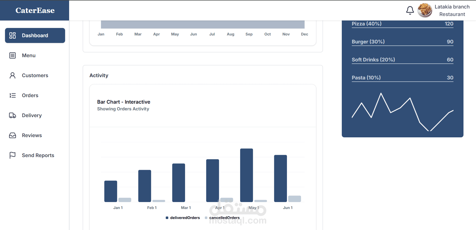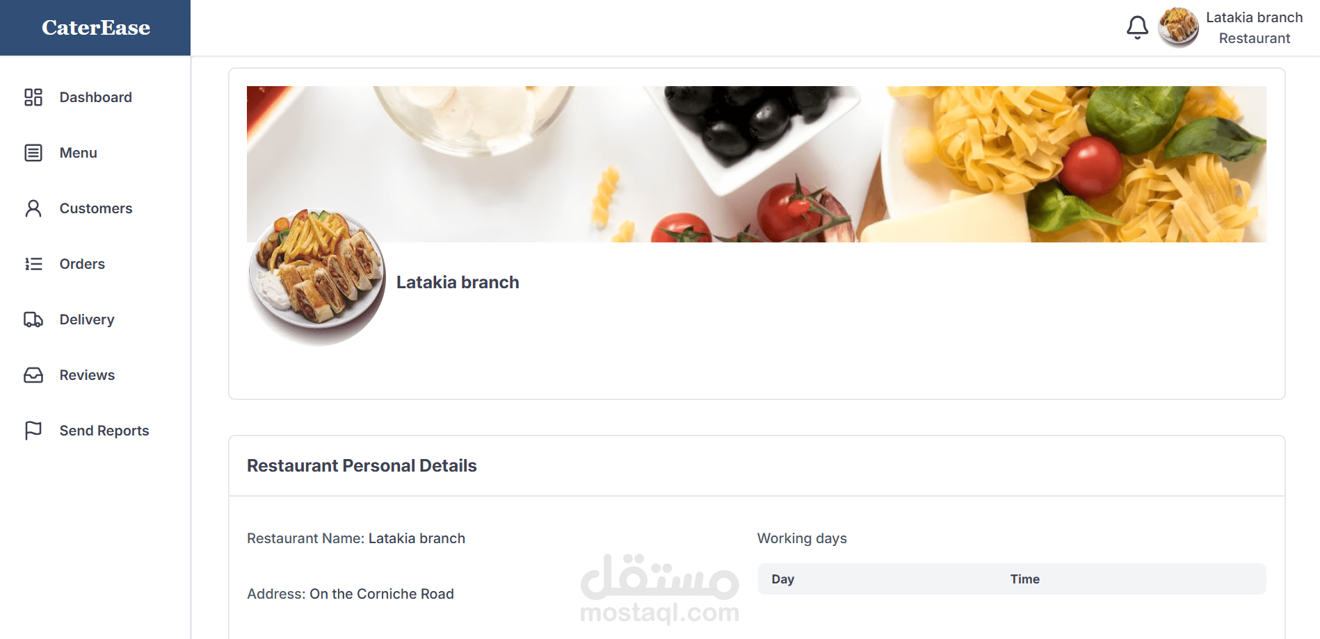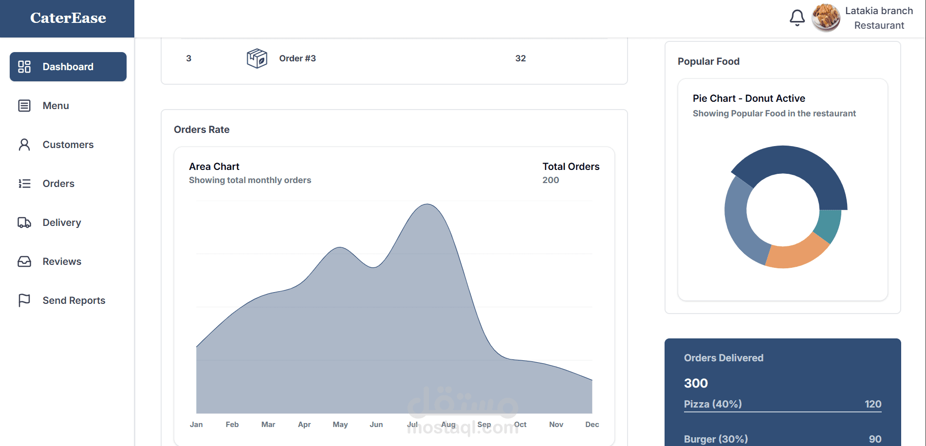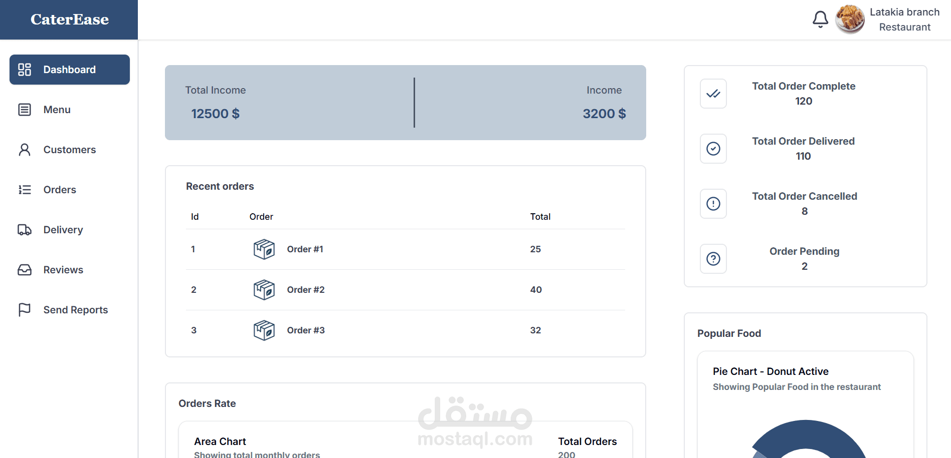 يقدم مشروع CaterEase نظامًا إداريًا متكاملًا لأصحاب المطاعم، مصممًا لتسهيل ومراقبة العمليات اليومية بكفاءة. توفر لوحة تحكم المدير واجهة مركزية لإدارة جميع جوانب المطعم، بدءًا من الطلبات والعملاء وصولًا إلى قائمة الطعام وفريق التوصيل.