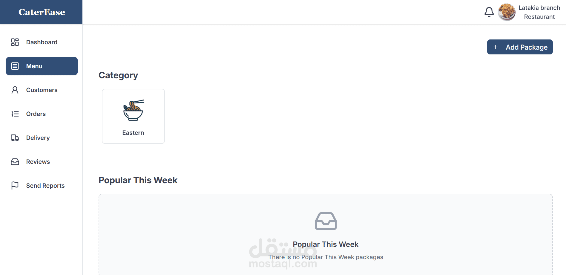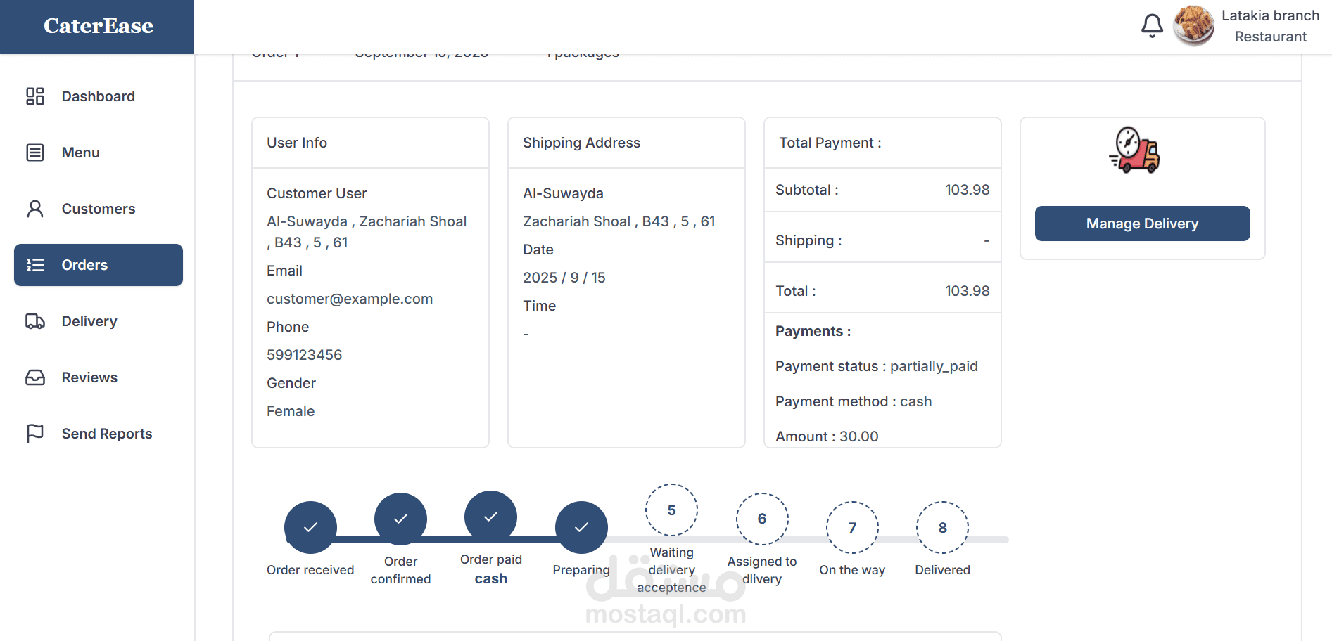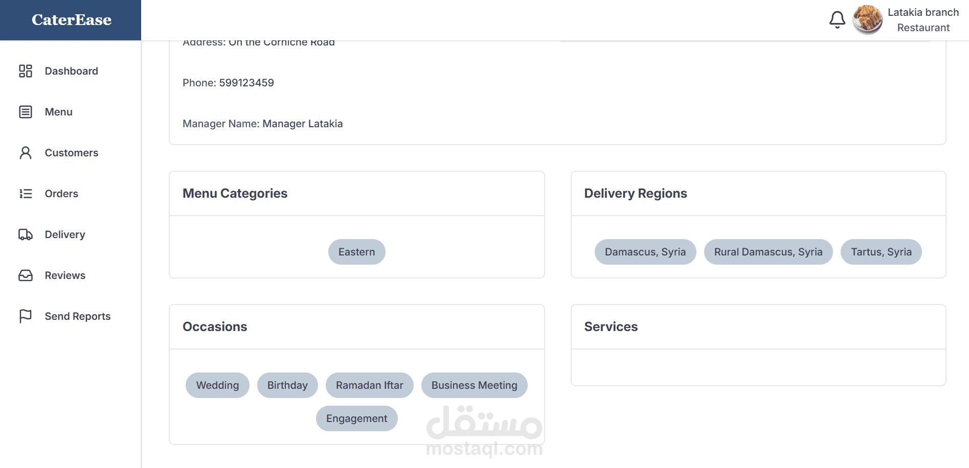 يقدم مشروع CaterEase نظامًا إداريًا متكاملًا لأصحاب المطاعم، مصممًا لتسهيل ومراقبة العمليات اليومية بكفاءة. توفر لوحة تحكم المدير واجهة مركزية لإدارة جميع جوانب المطعم، بدءًا من الطلبات والعملاء وصولًا إلى قائمة الطعام وفريق التوصيل.