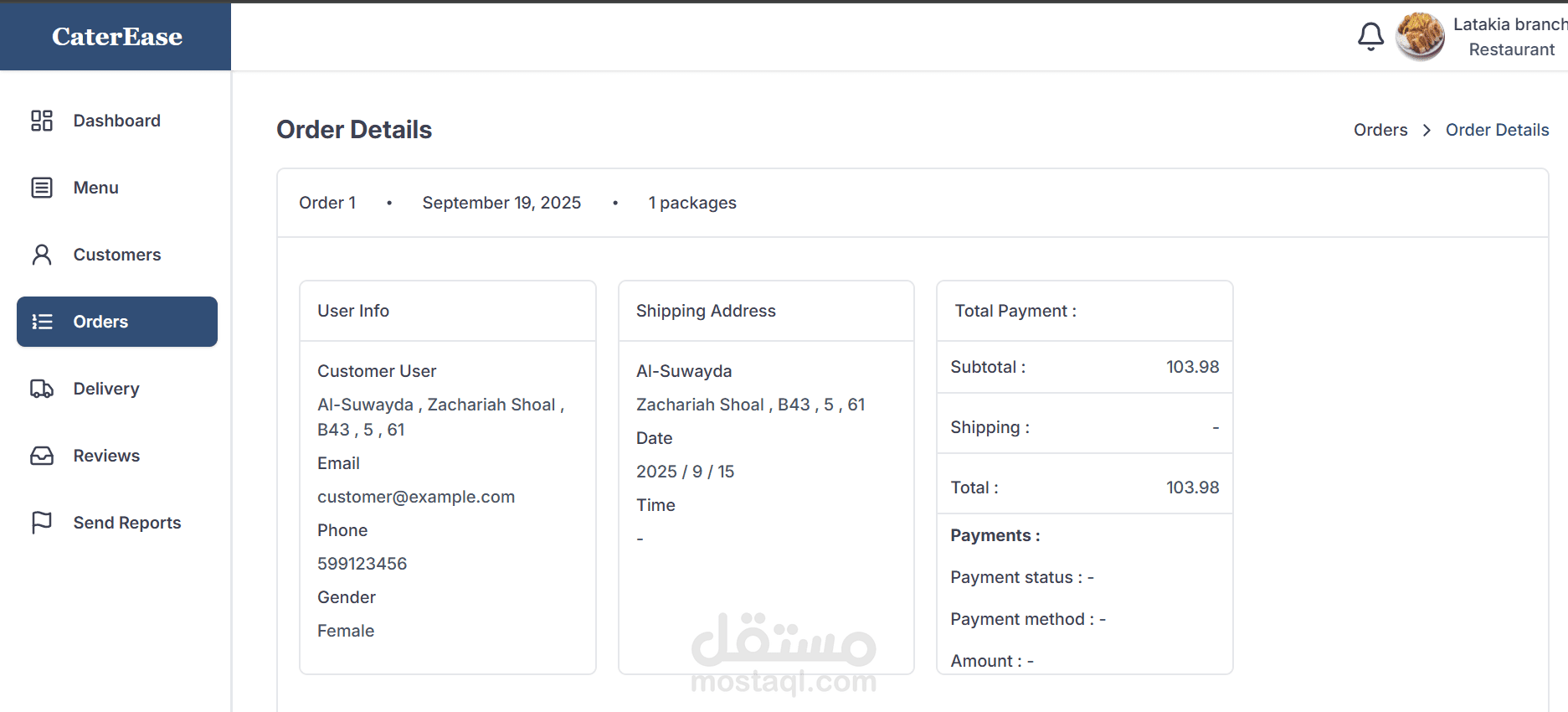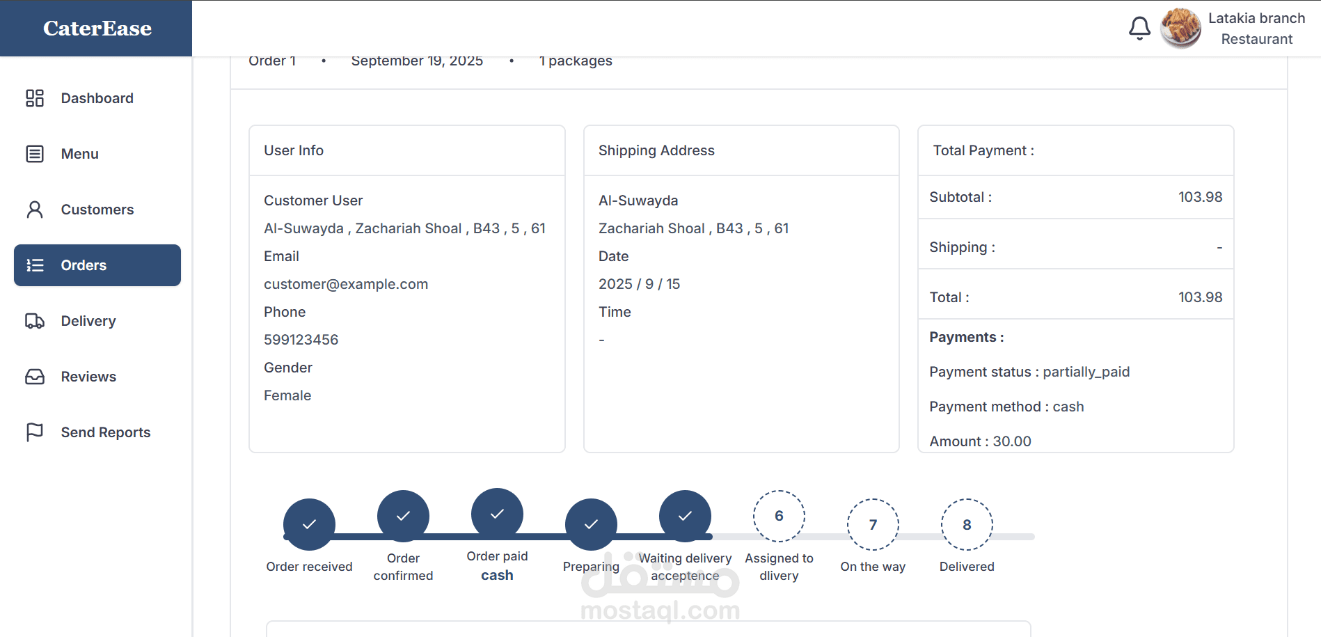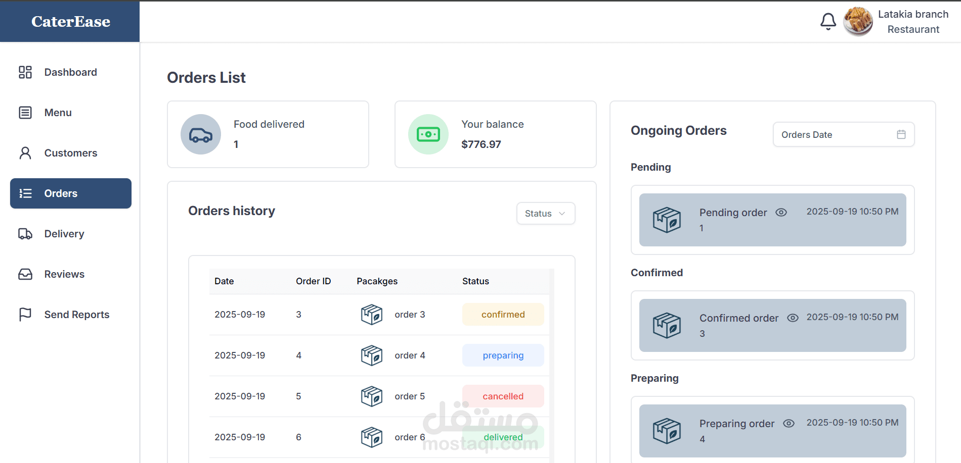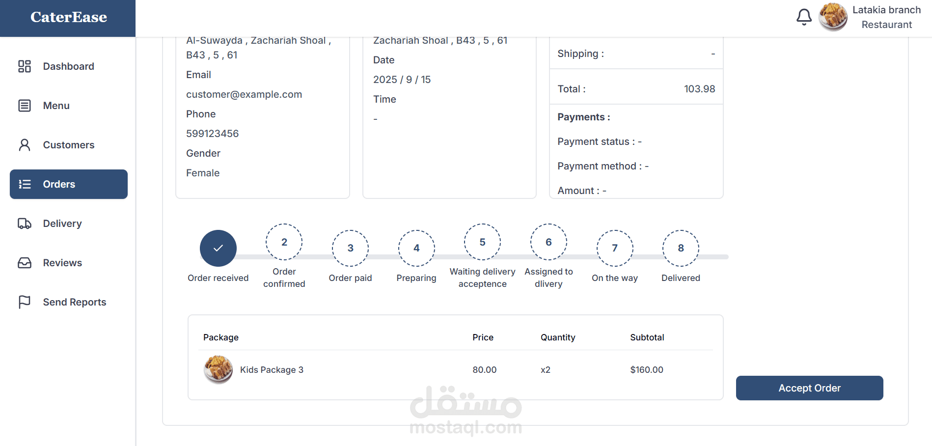 يقدم مشروع CaterEase نظامًا إداريًا متكاملًا لأصحاب المطاعم، مصممًا لتسهيل ومراقبة العمليات اليومية بكفاءة. توفر لوحة تحكم المدير واجهة مركزية لإدارة جميع جوانب المطعم، بدءًا من الطلبات والعملاء وصولًا إلى قائمة الطعام وفريق التوصيل.