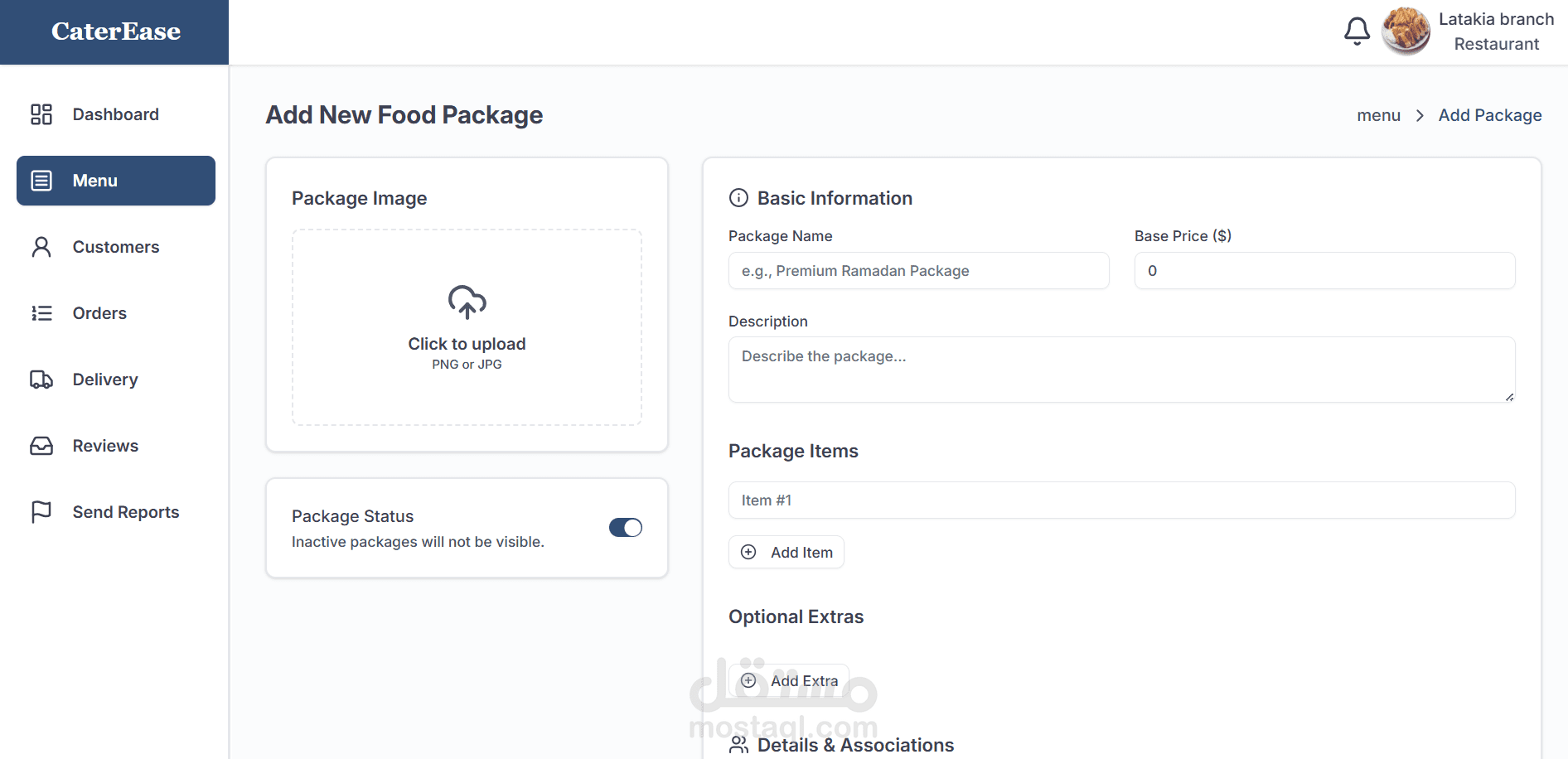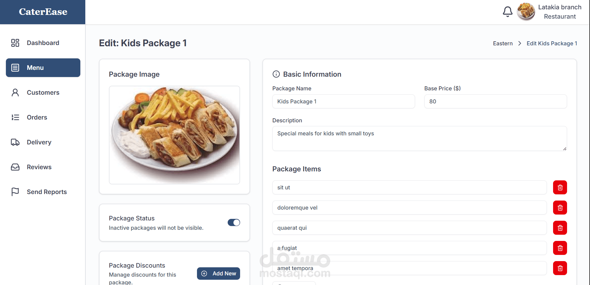تسمح هذه الميزة للمدير بإدارة فئات الأطعمة، وإضافة وتعديل "حزم الطعام" مع تفاصيل مثل السعر والصورة والوصف. يمكن أيضًا إدارة الخصومات والعروض الترويجية المرتبطة بكل حزمة.