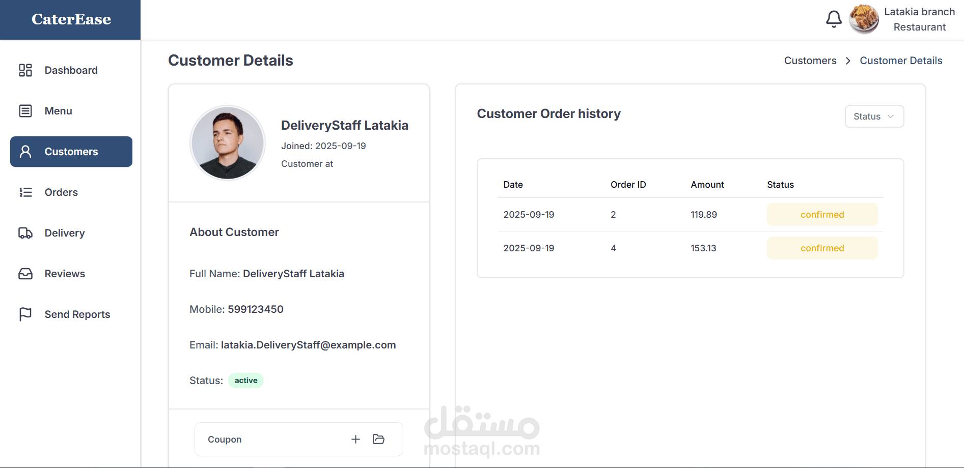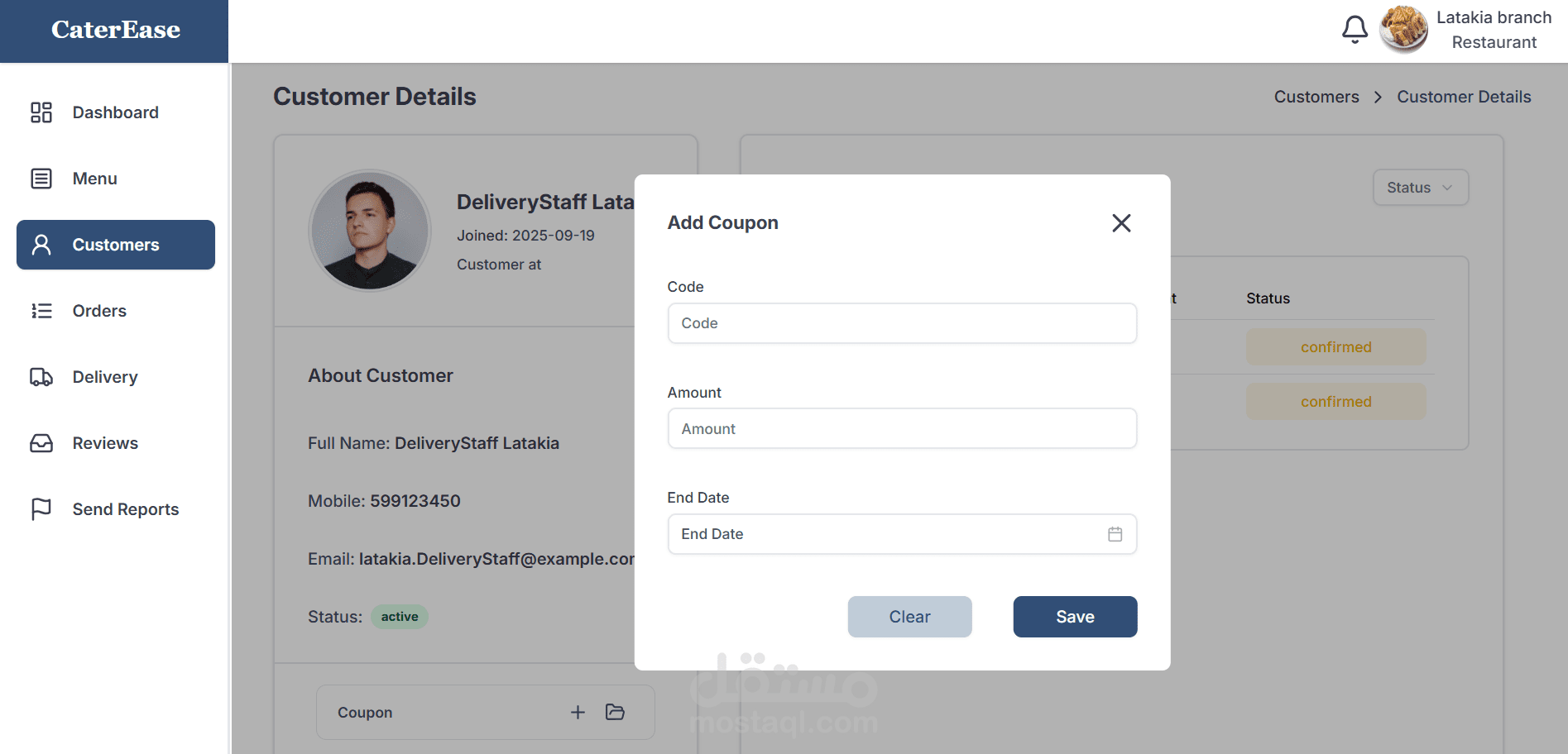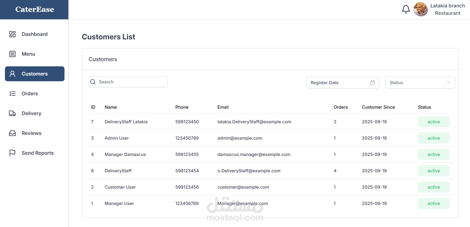 تتيح للمدير عرض قائمة بجميع العملاء، والبحث عن عملاء محددين، وتصفية القائمة بناءً على تاريخ التسجيل أو الحالة (نشط/غير نشط). كما يمكن عرض تفاصيل كل عميل، بما في ذلك سجل الطلبات الخاص به.