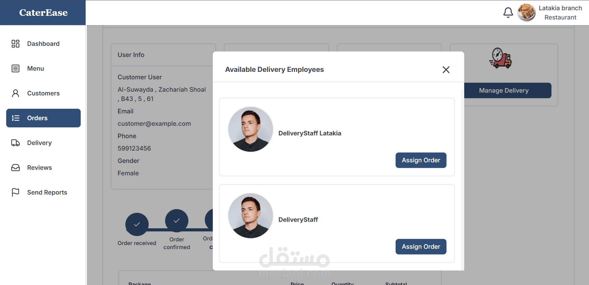 يمكن للمدير إضافة موظفي توصيل جدد إلى النظام، وإدارة قائمة الموظفين الحاليين، وتعديل معلوماتهم. يوفر النظام أيضًا القدرة على تعيين الطلبات المعلقة لموظفي التوصيل المتاحين.