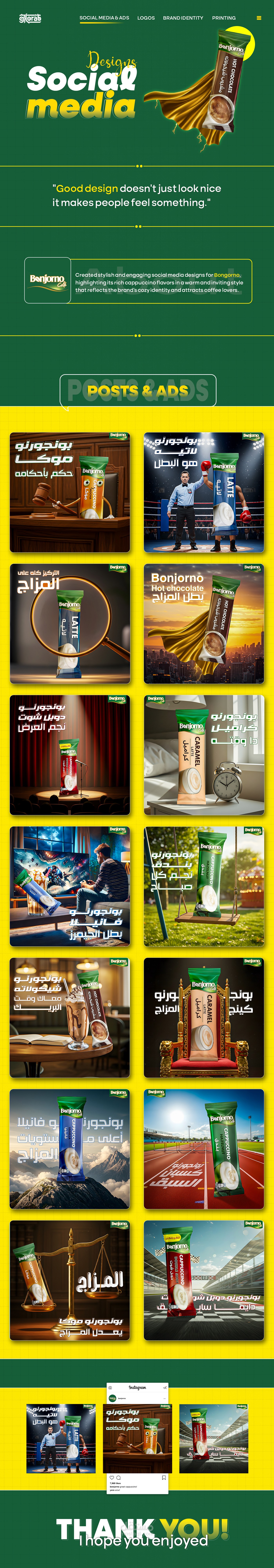 عملت على تصميم مجموعة من بوستات السوشيال ميديا لشركة Bonjorno المتخصصة في منتجات الكابتشينو والقهوة.