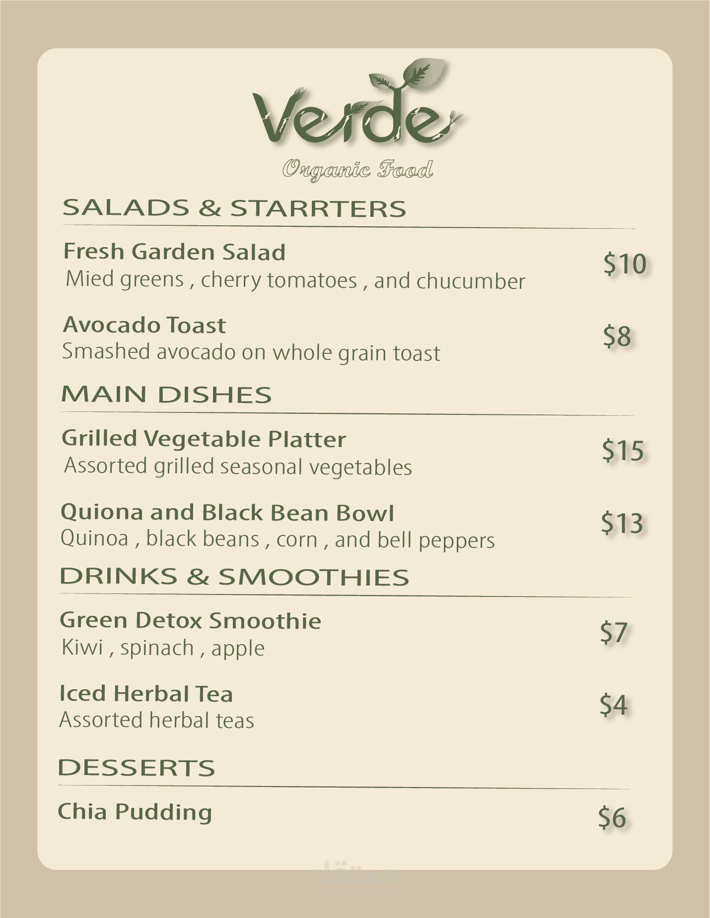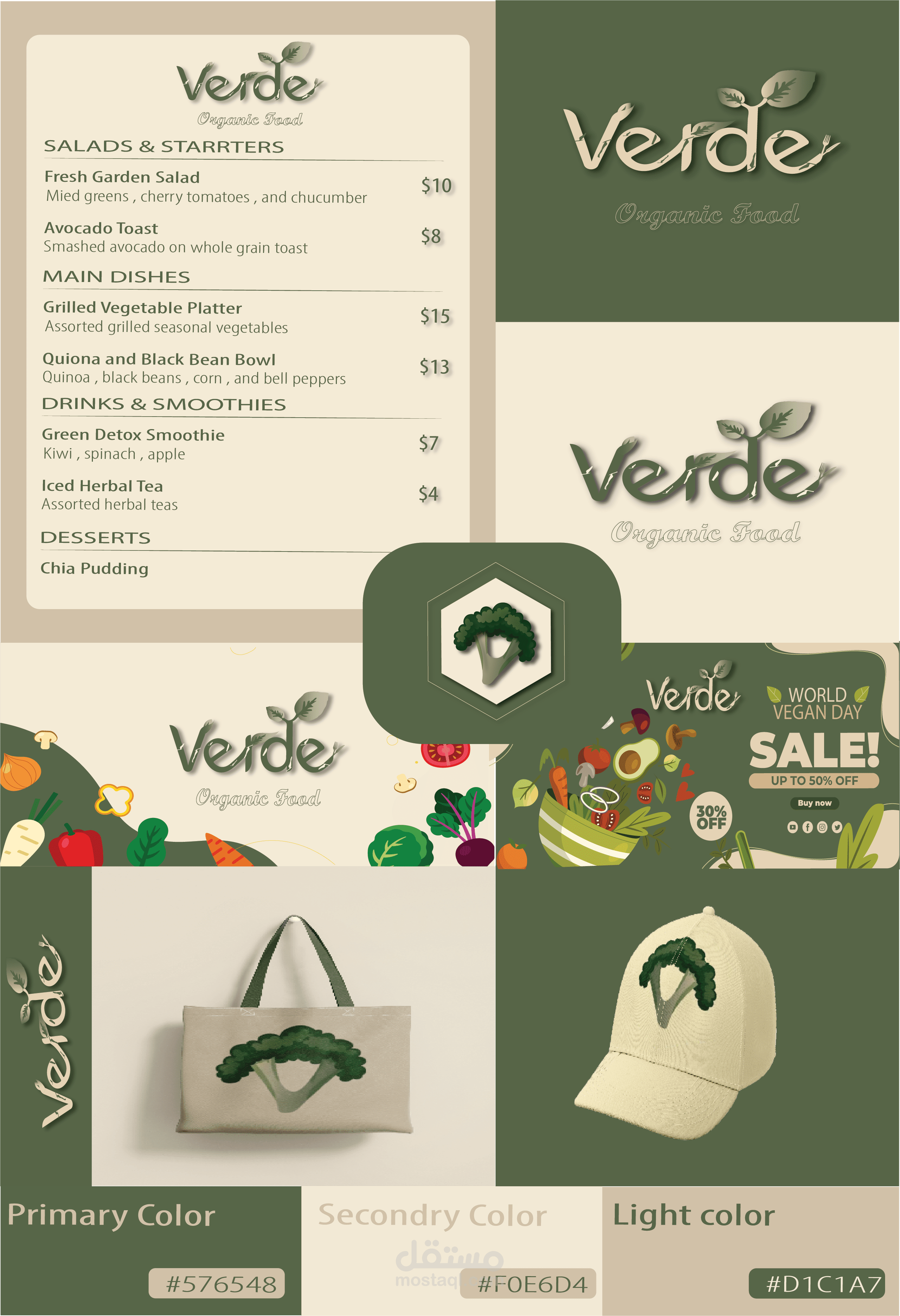 تم العمل على تصميم شعار وهوية بصرية كاملة لمطعم Verde المتخصص في تقديم الأطعمة العضوية والطبيعية. الهدف من التصميم هو إبراز القيم الأساسية للعلامة التجارية: النقاء، الطبيعة، التوازن، والصحة، مع الحفاظ على مظهر حديث وأنيق يجذب الفئة المستهدفة من محبي الطعام الصحي والمنتجات الطبيعية.