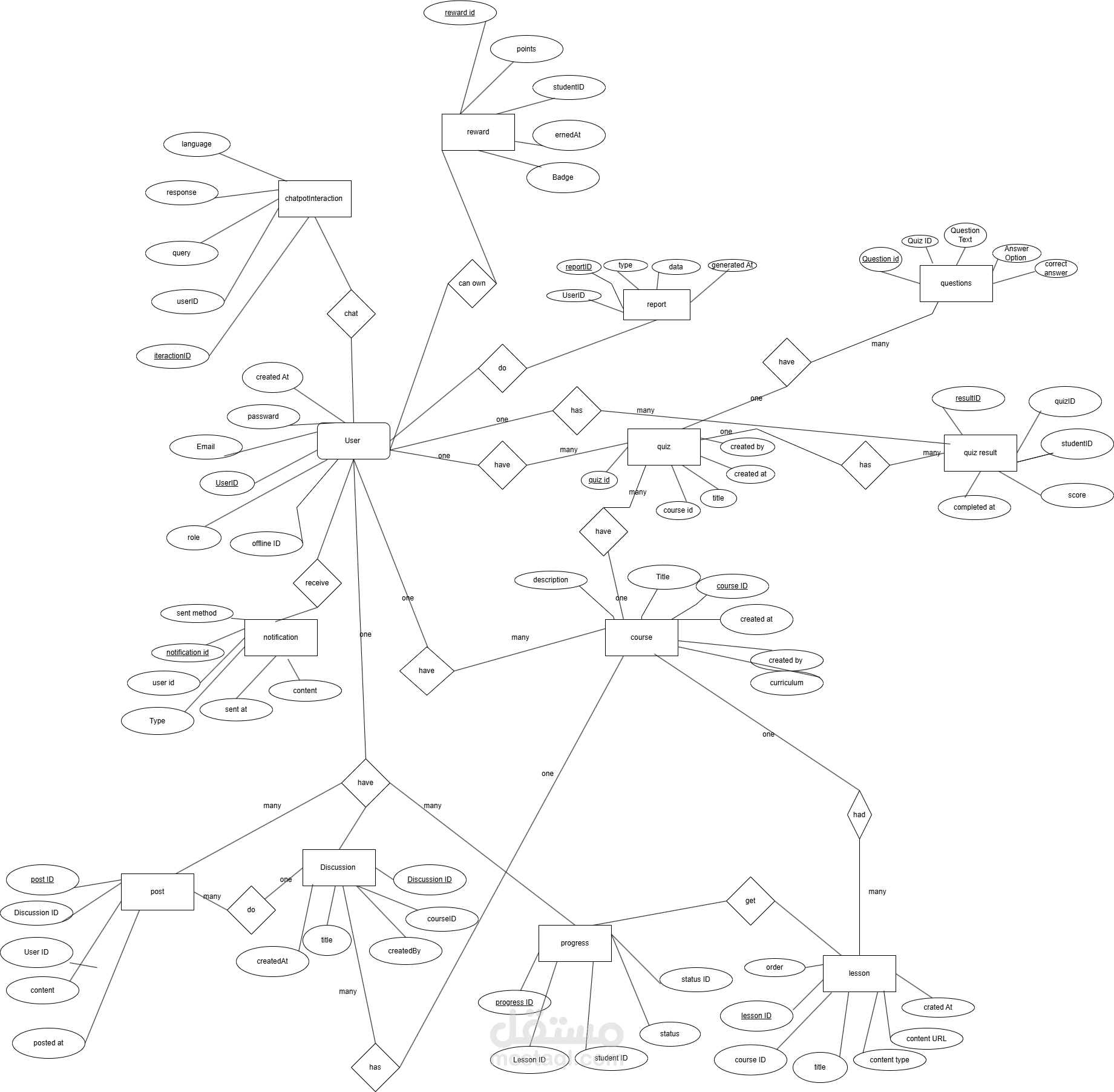 أرغب في تطوير قاعدة بيانات (Database) مع تصميم ERD خاص بمنصة تعليمية إلكترونية (E-learning Platform).