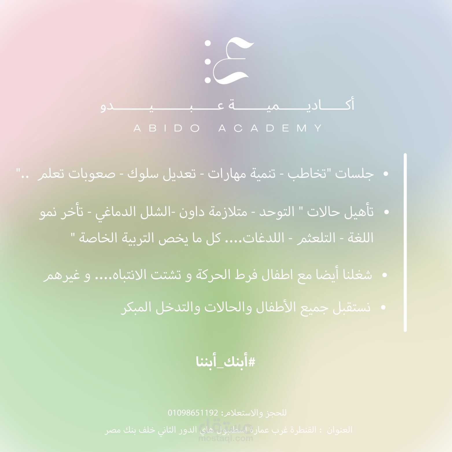 - الخلفية تتضمن تداخلًا متعدد للألوان، مما يعكس ان الأكاديمية تقبل جميع حالات الأطفال الذين يعانون من مختلف الألوان من الأمراض الموجودة عند الأطفال ذوي الهمم.