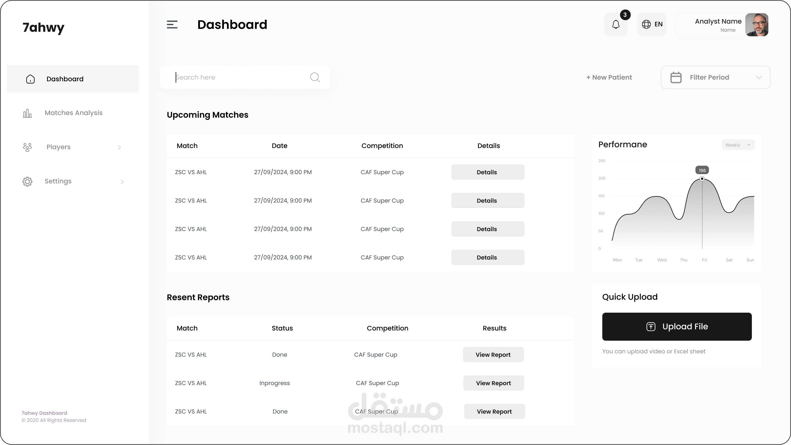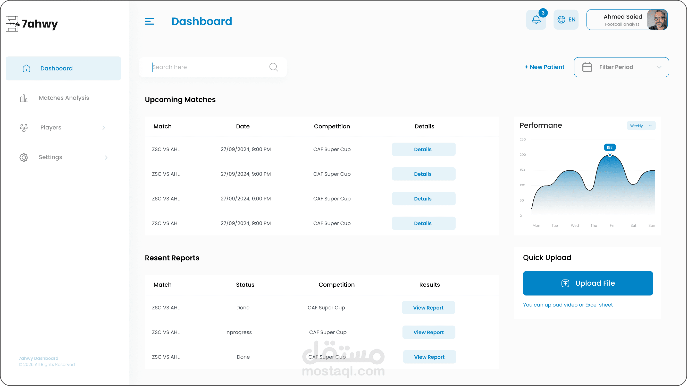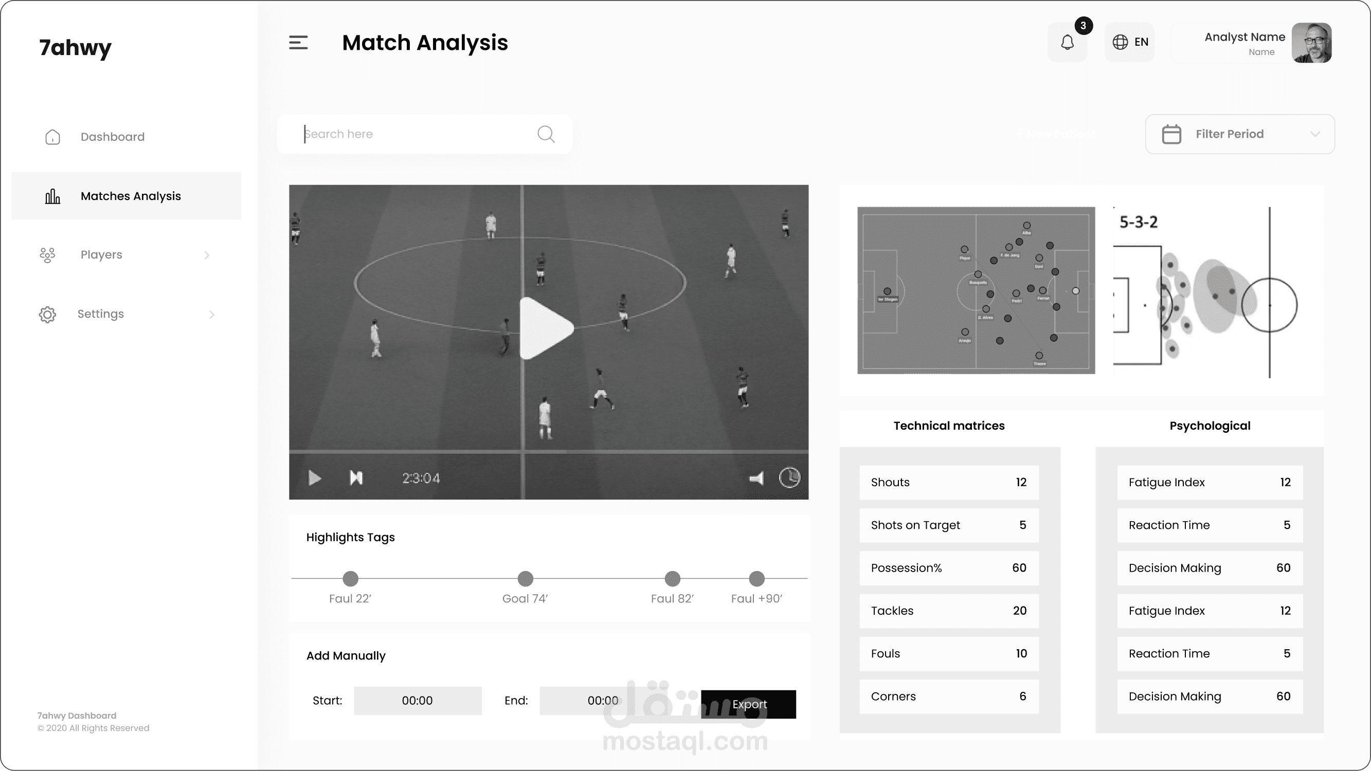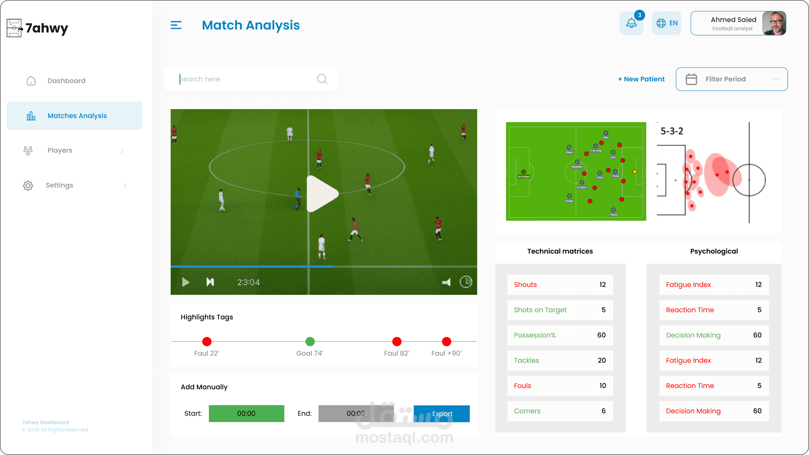 رفع الفيديوهات وتحليلها يدويًا + بالذكاء الاصطناعي مع نظام Tagging للأحداث (أهداف – أخطاء – تمريرات…).