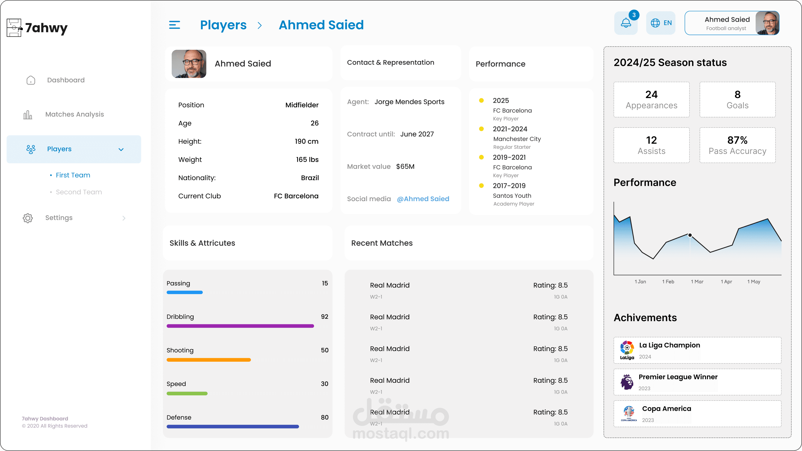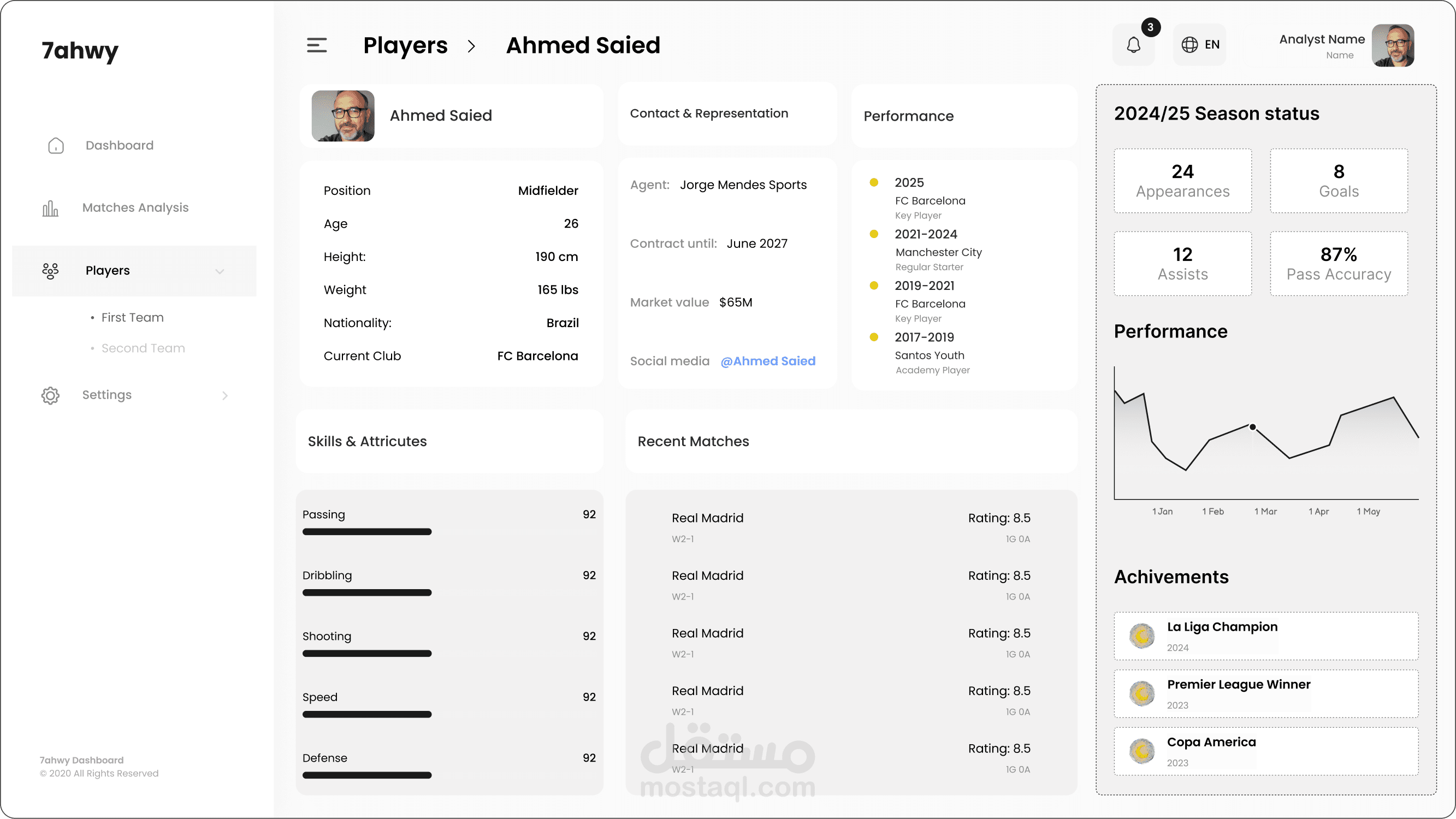 أقوم بتصميم وتطوير واجهة مستخدم وتجربة مستخدم UI/UX لمنصة ويب متخصصة في تحليل بيانات كرة القدم، مع مراعاة سهولة الاستخدام وسرعة الوصول للمعلومات.