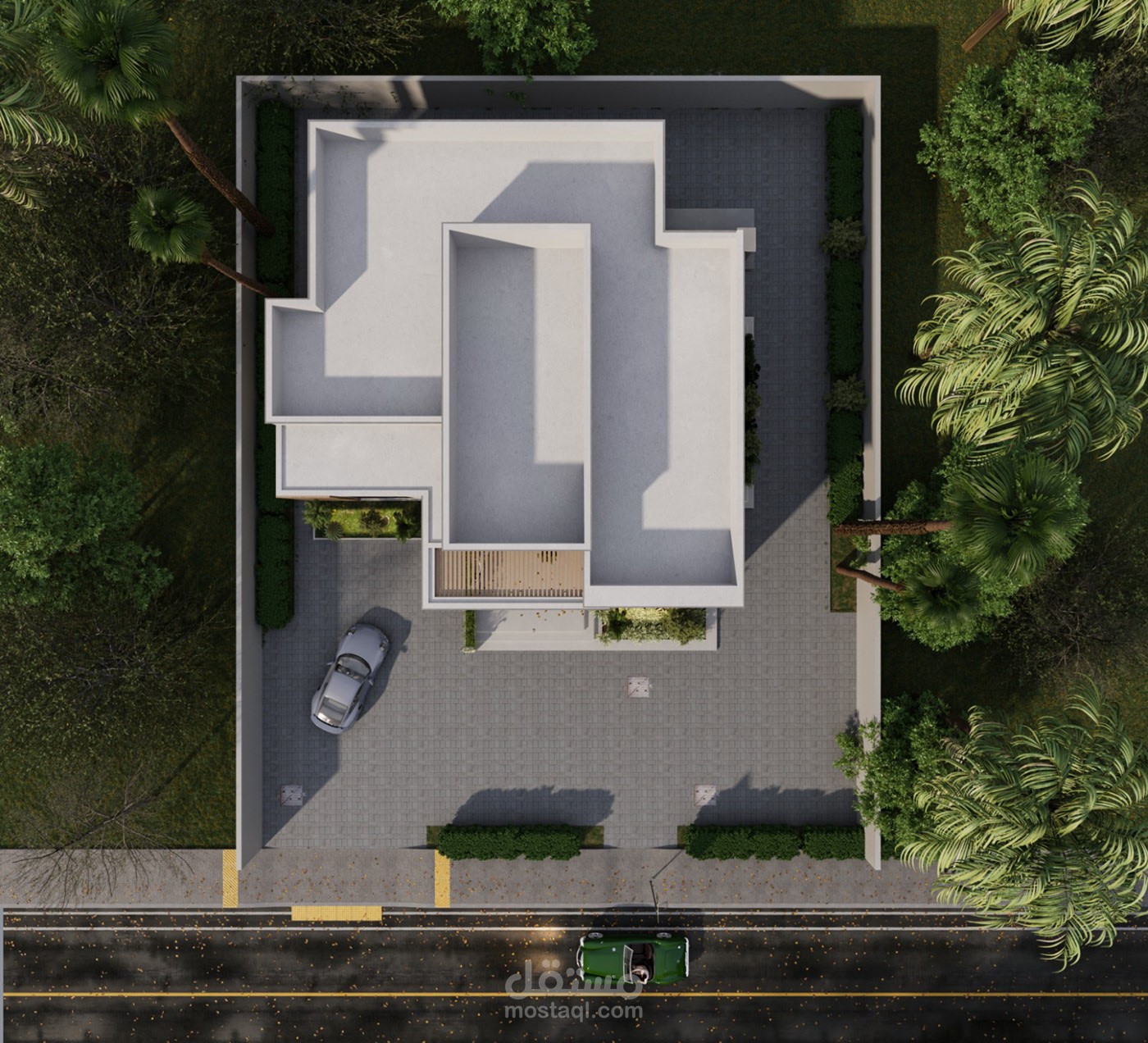 The material palette features dark-toned natural finishes that emphasize elegance and depth, complemented by extended pergolas that merge architectural rhythm with shading performance — enriching both aesthetic value and environmental functionality.