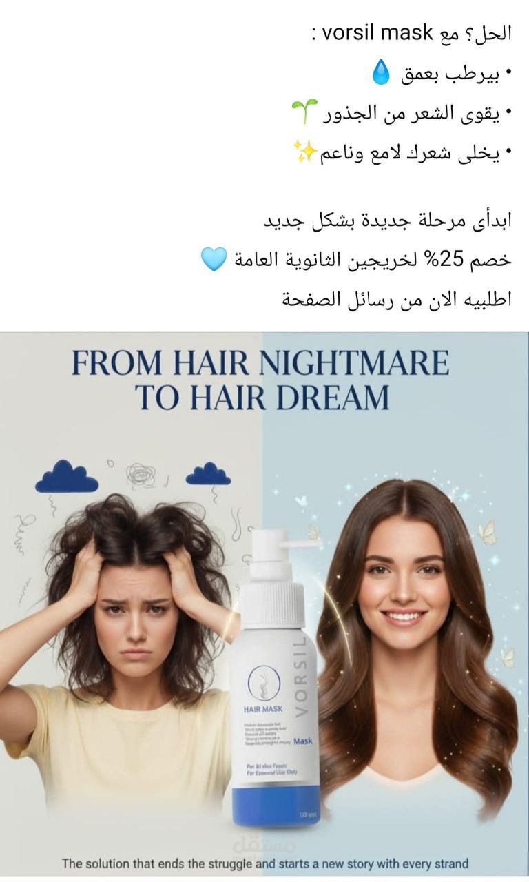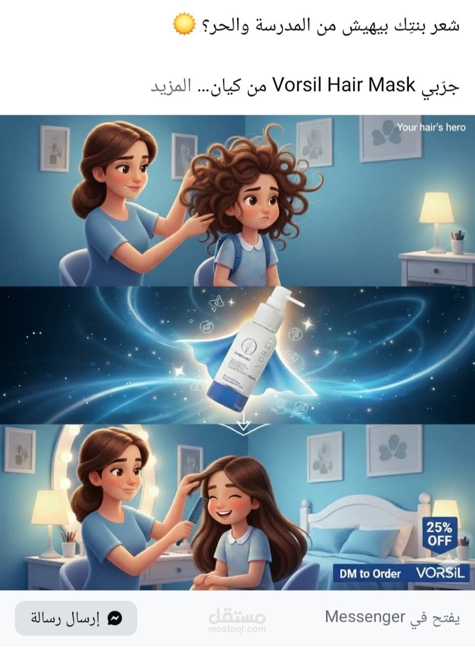 3 بوستات إعلانية لمنتج Vorsil Hair Mask من براند كيان، ركزت فيها على إبراز مشاكل الشعر الشائعة للجمهور المستهدف (خريجين الثانوية العامة، الأمهات ومعاناتهم فى تسريح شعر بناتهم، السيدات بعد الصيف ) وربطها مباشرة بالحلول اللي بيقدمها المنتج.