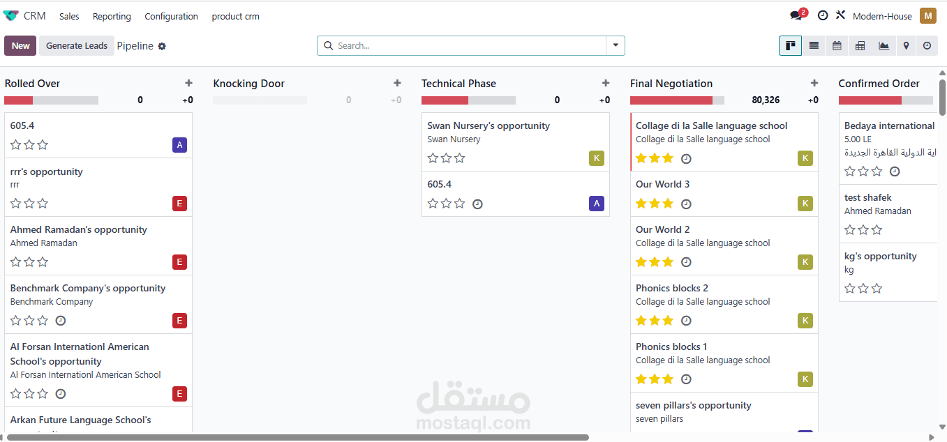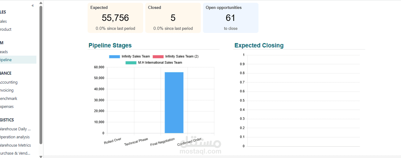 تصميم وتنفيذ نظام CRM متكامل لمتابعة العملاء المحتملين (Leads) وتحويلهم إلى فرص بيع (Opportunities)، مع تتبع مراحل المبيعات وتحليل أداء الفريق التجاري.
