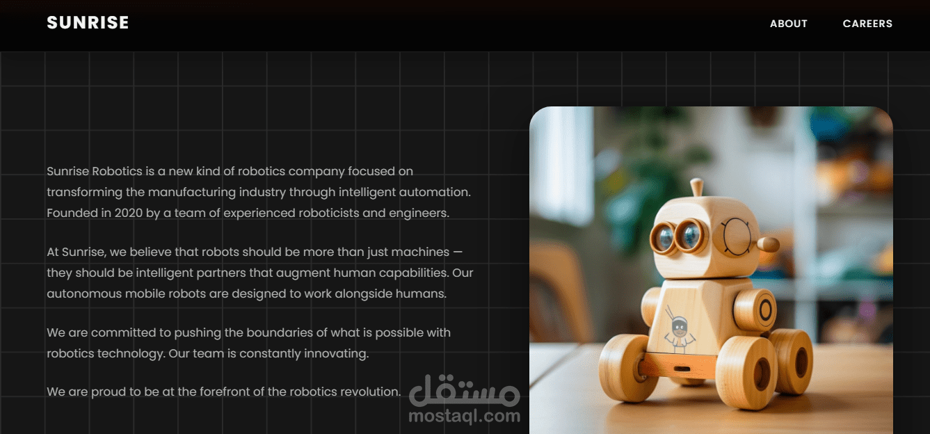 Sunrise Robotics is a cutting-edge robotics company redefining the manufacturing landscape through intelligent automation. This landing page presents a bold yet refined identity, reflecting a brand built on innovation, autonomy, and collaboration.