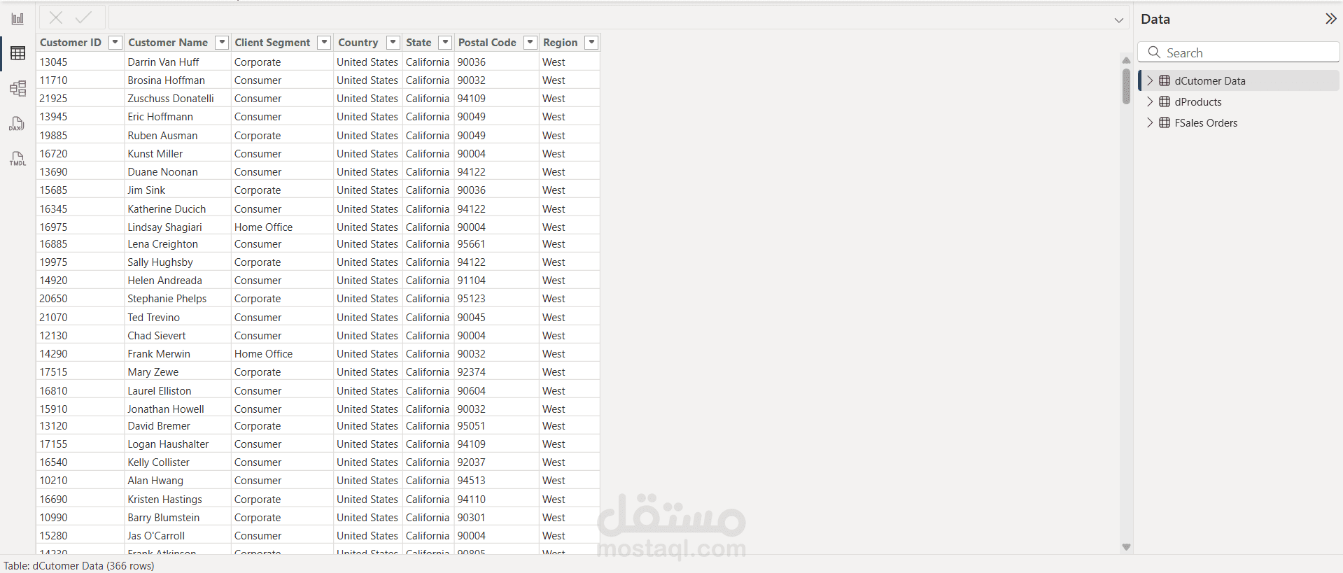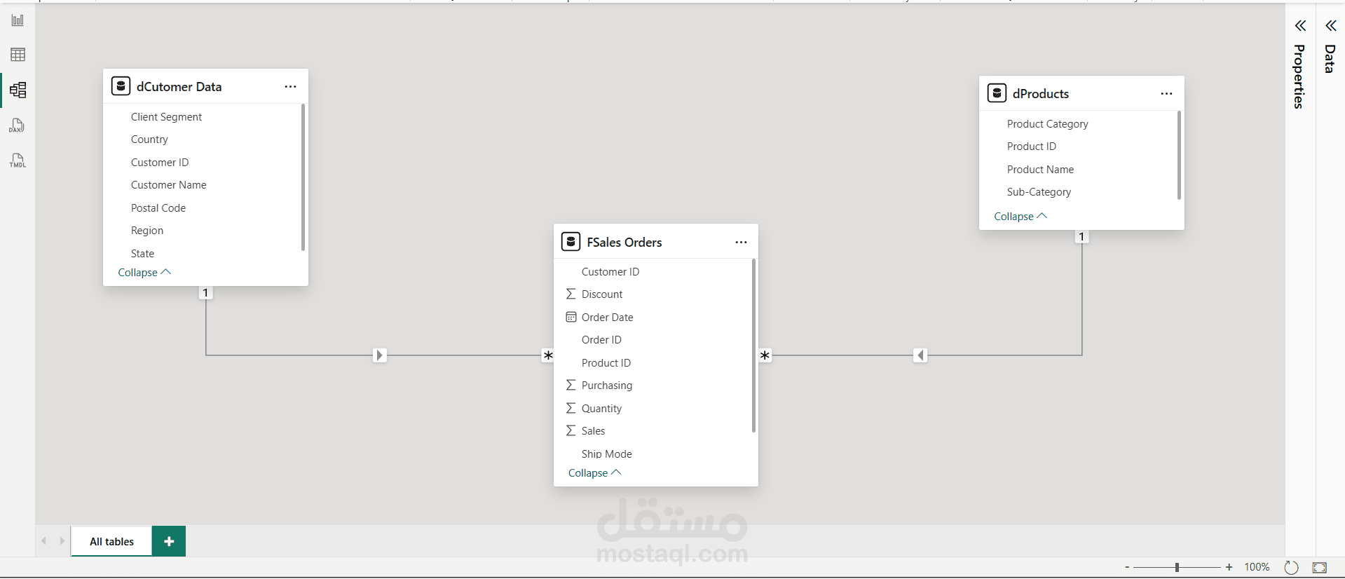 قمت بتطبيق نمذجة البيانات (Data Modeling) بتصميم نموذج نجمي (Star Schema) يتضمن جداول الأبعاد مثل العملاء والمنتجات وجدول الوقائع (Sales Orders) لدعم التحليل بكفاءة.