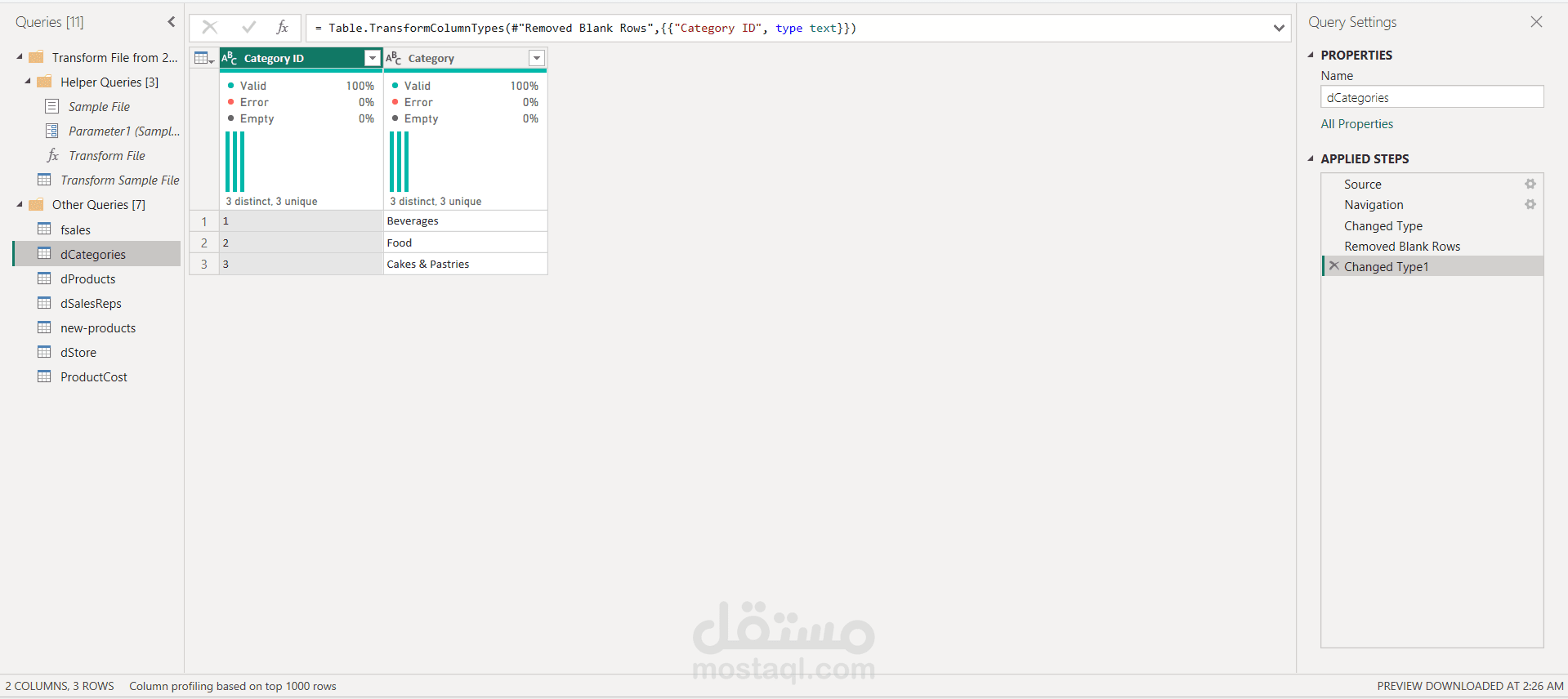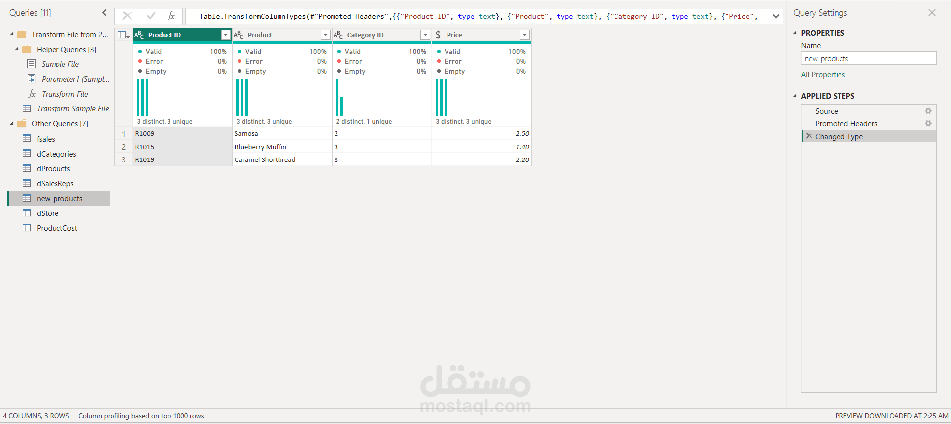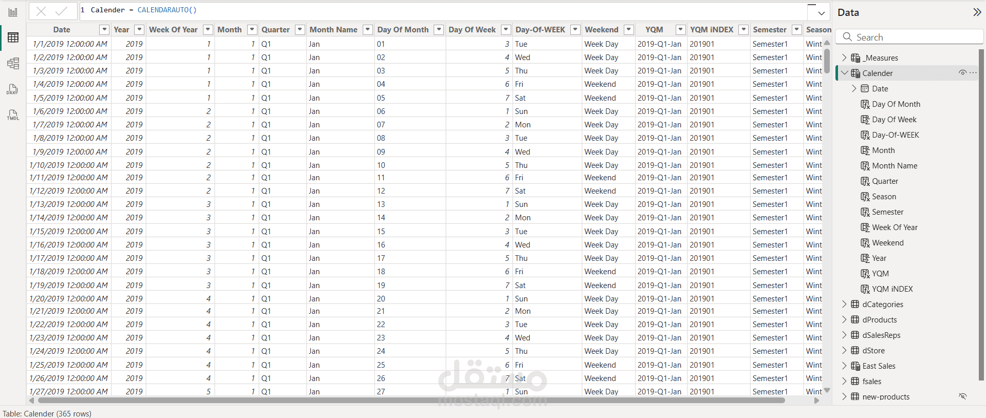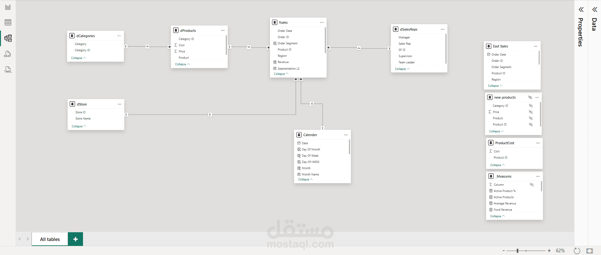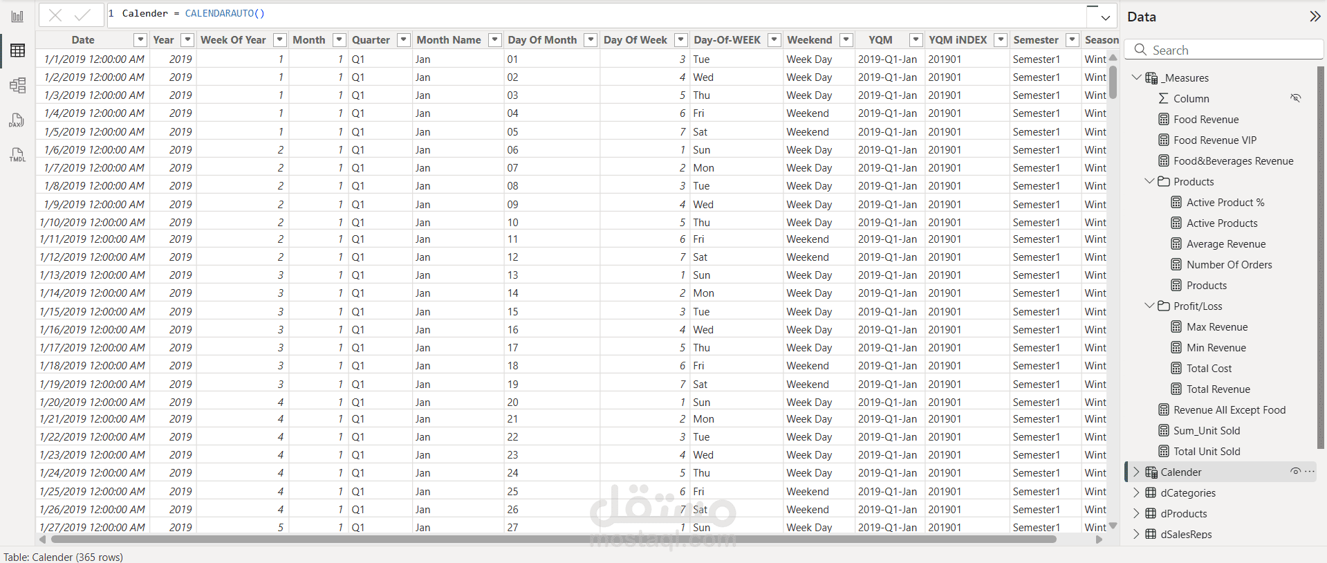 اعتمد المشروع على Power Query في تنظيف البيانات وتحويلها، وتم إنشاء نموذج بيانات (Data Modeling) متكامل يربط بين جداول المبيعات والعملاء والمنتجات لدعم التحليل بكفاءة. كما تم تطوير معادلات DAX لاحتساب مؤشرات الأداء مثل نسب النمو، ومتوسطات الإيرادات، وتحليل الفروق بين الفترات الزمنية.