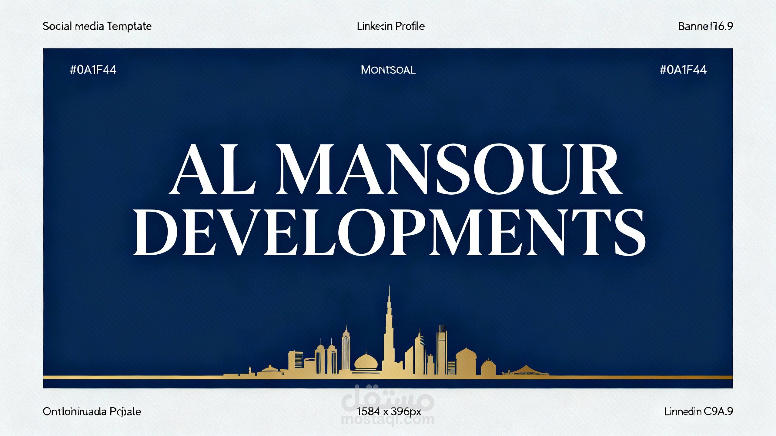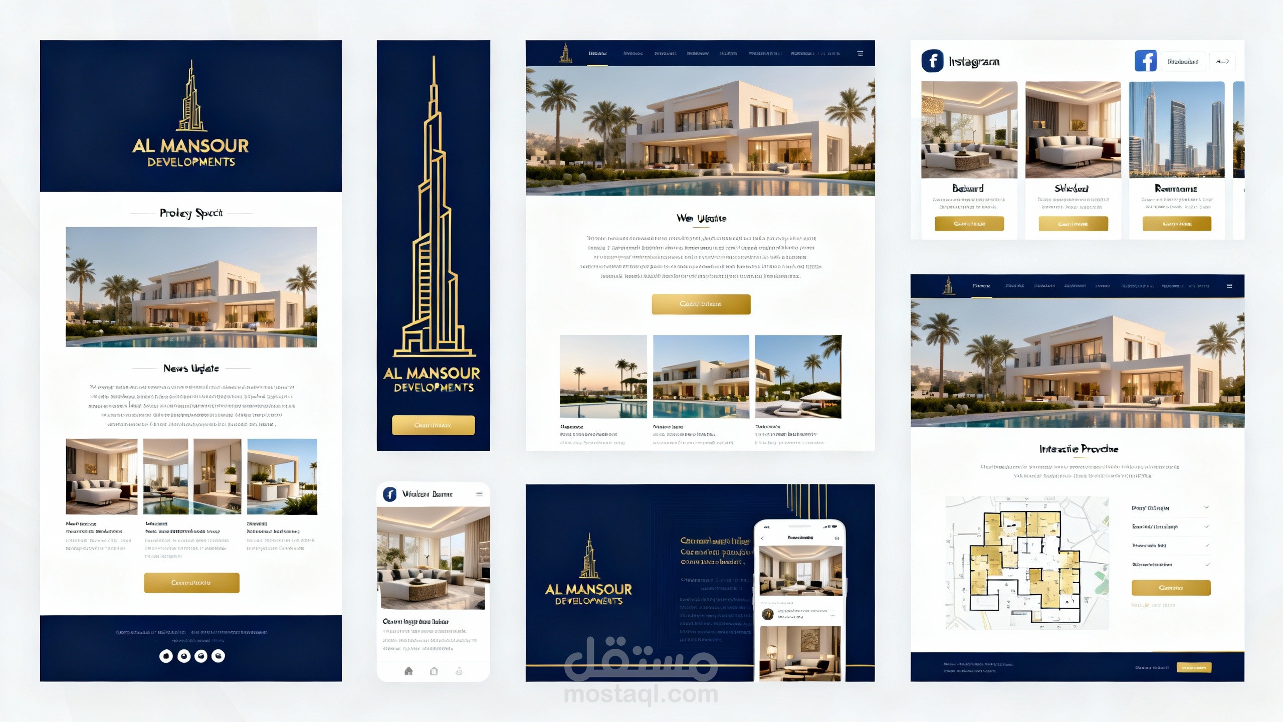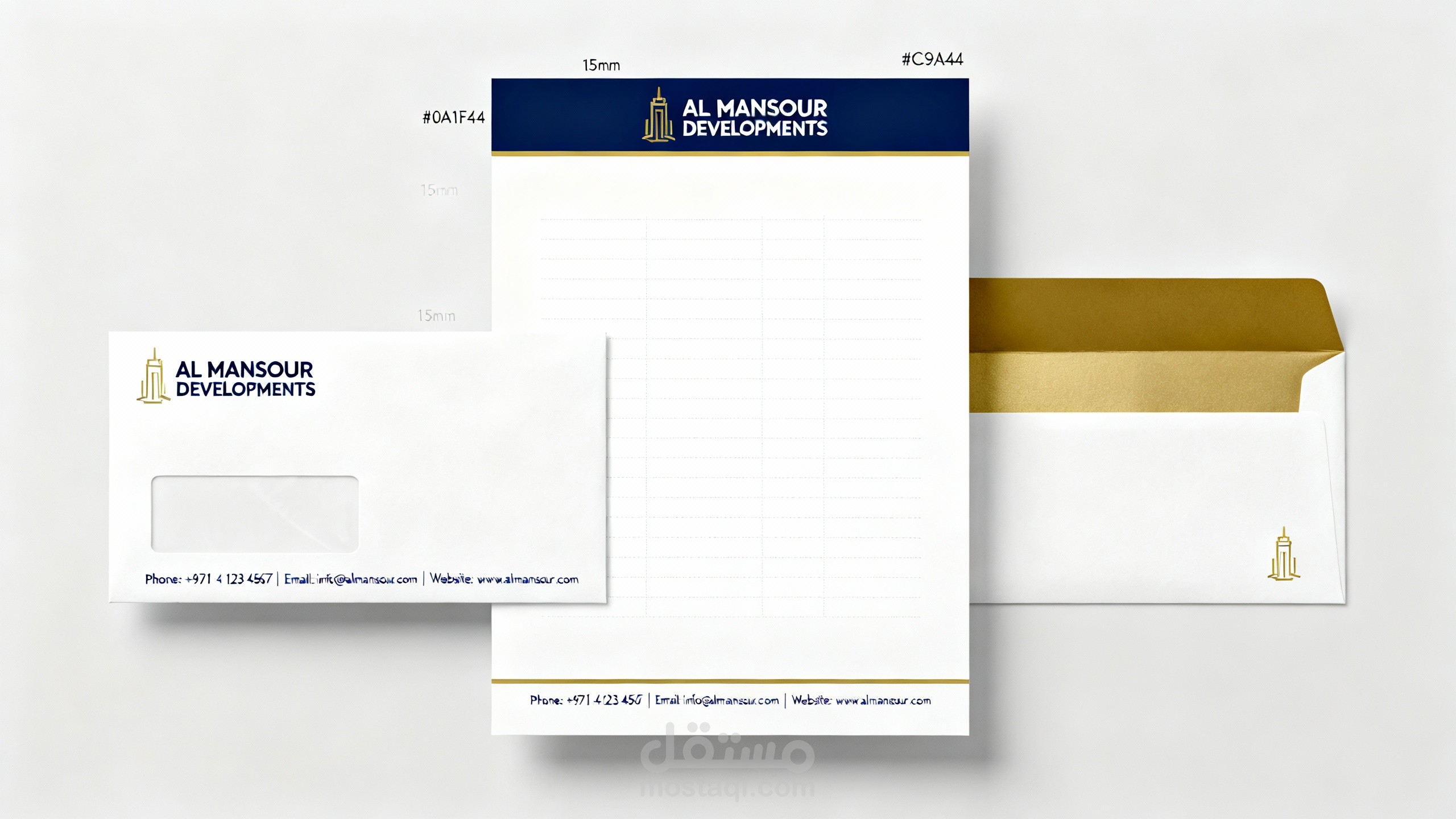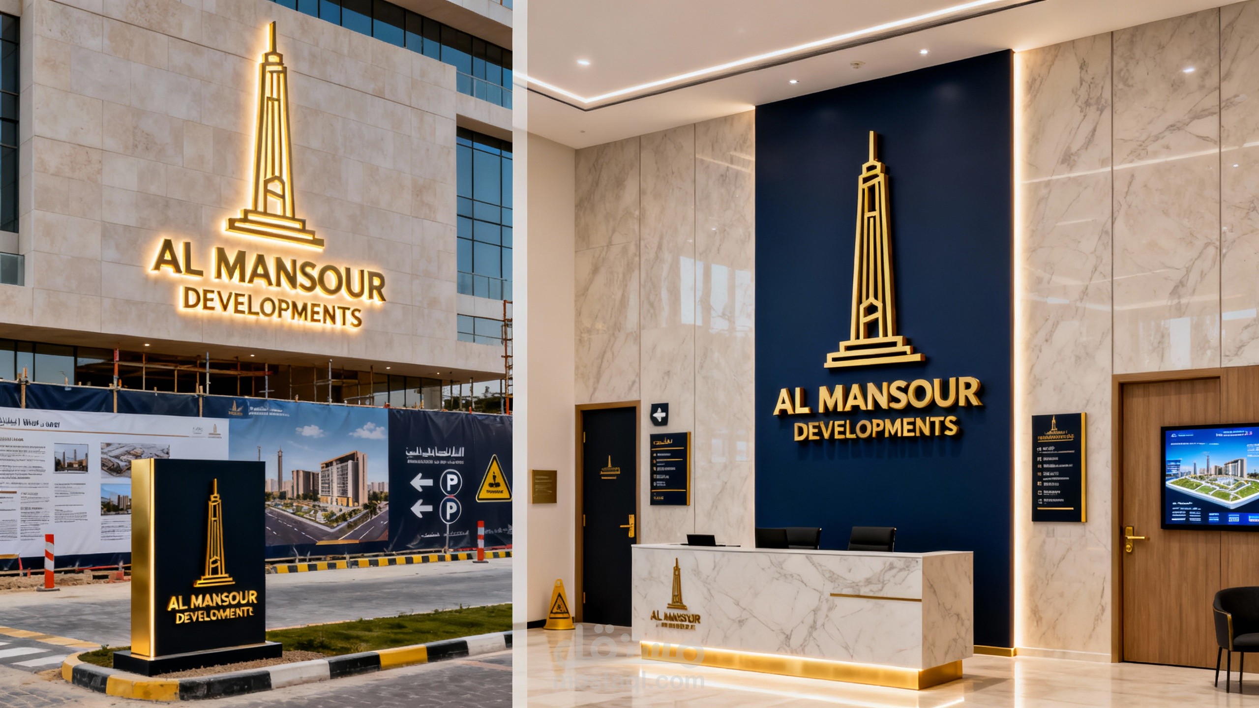 تم تصميم هوية بصرية متكاملة لشركة المنصور للتطوير العقاري (AL MANSOUR DEVELOPMENTS)، لتعكس مكانتها كشركة رائدة في الاستثمار والتطوير العقاري الفاخر.