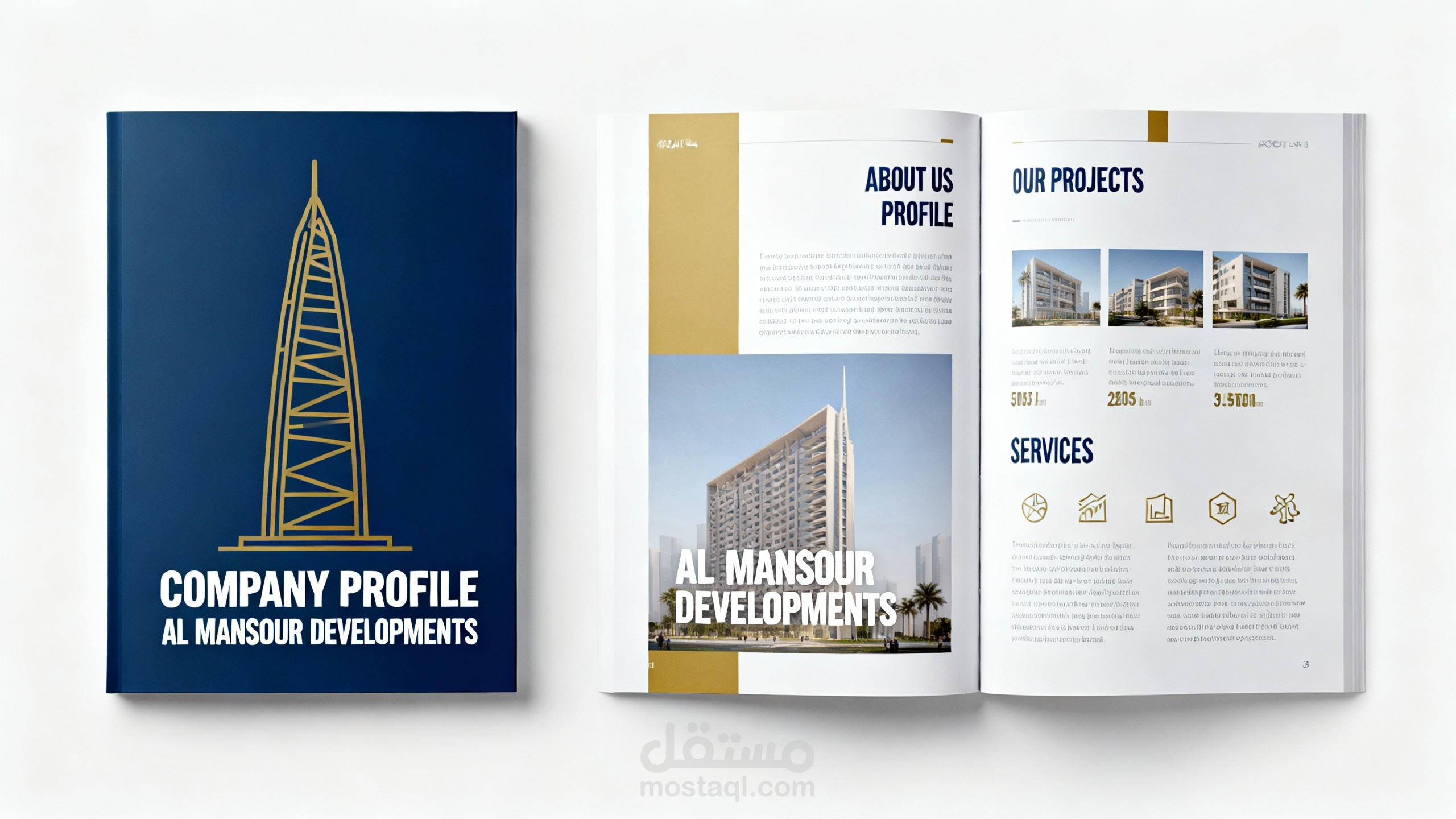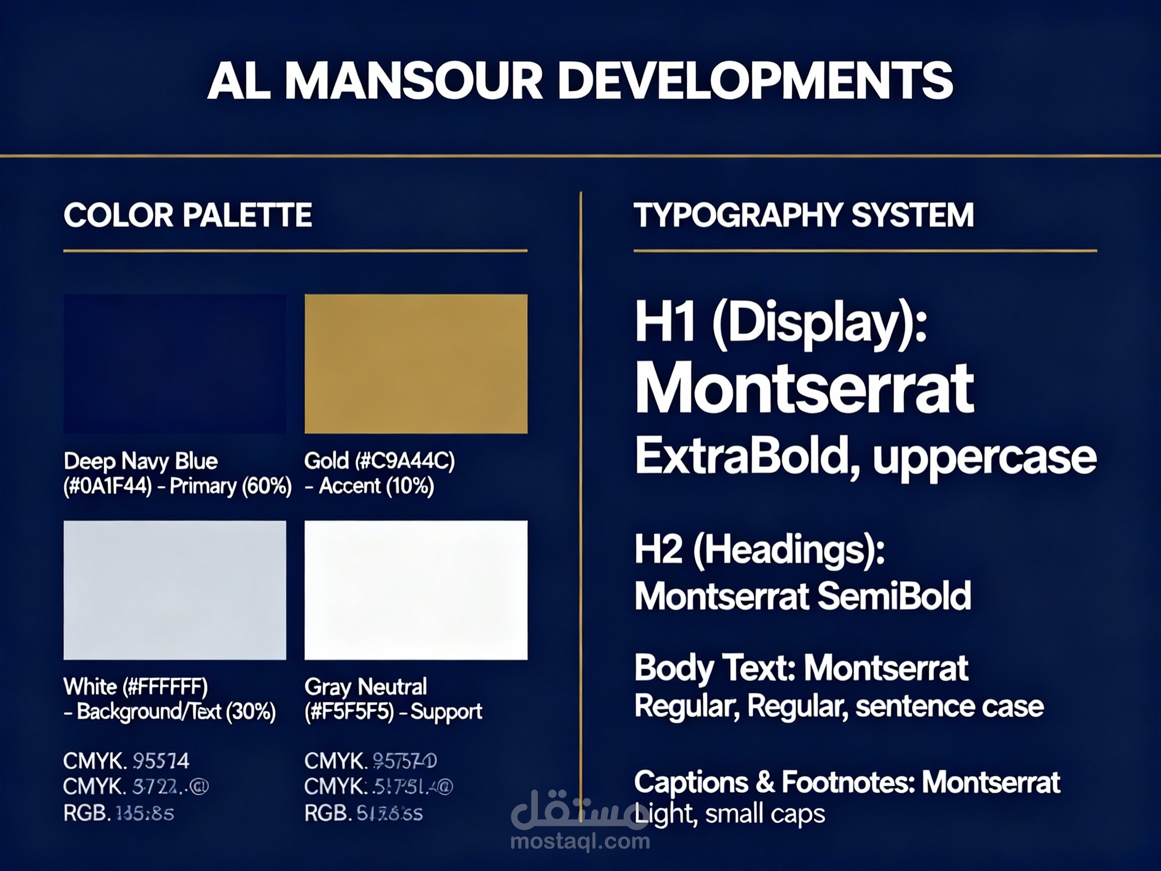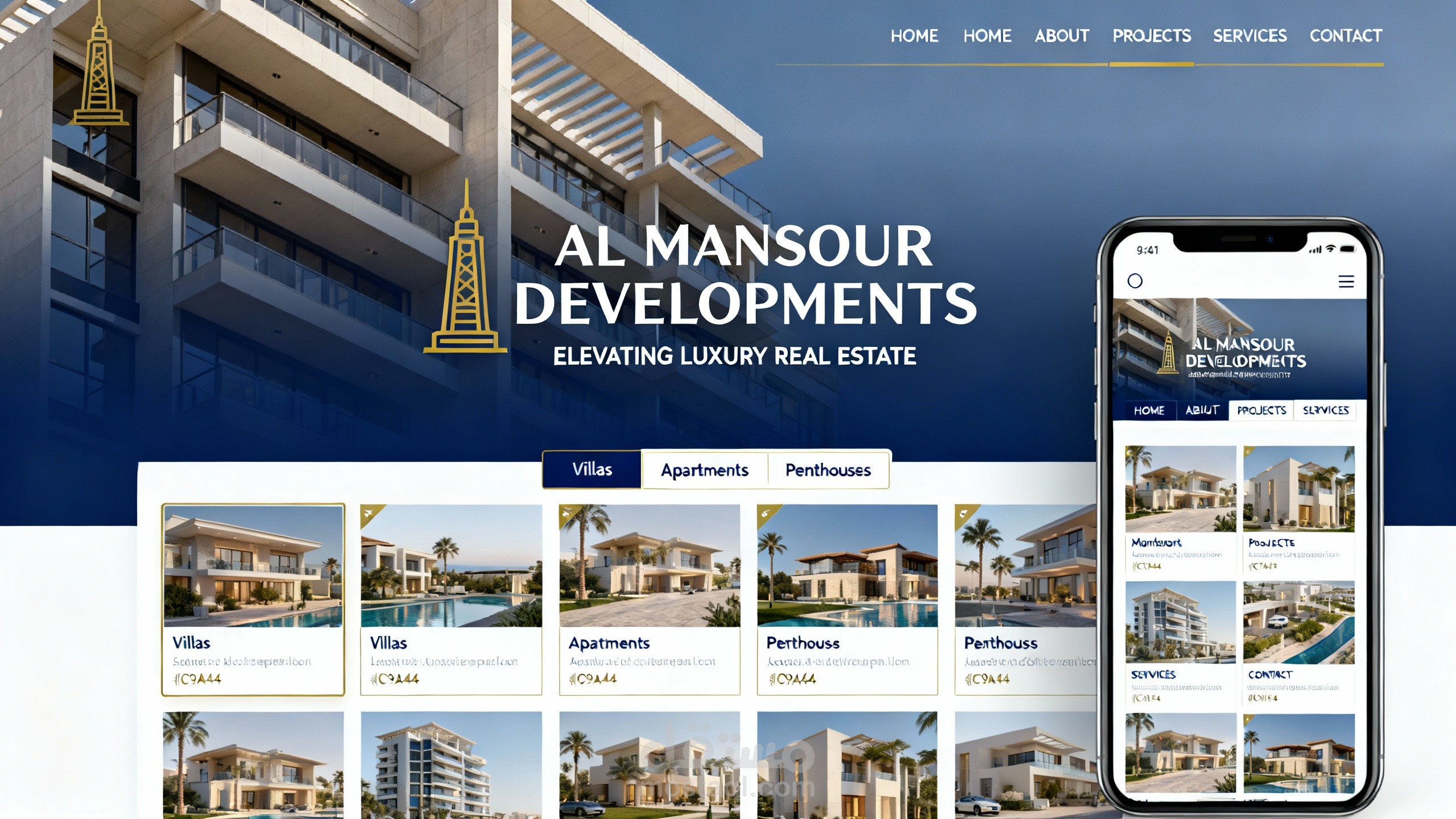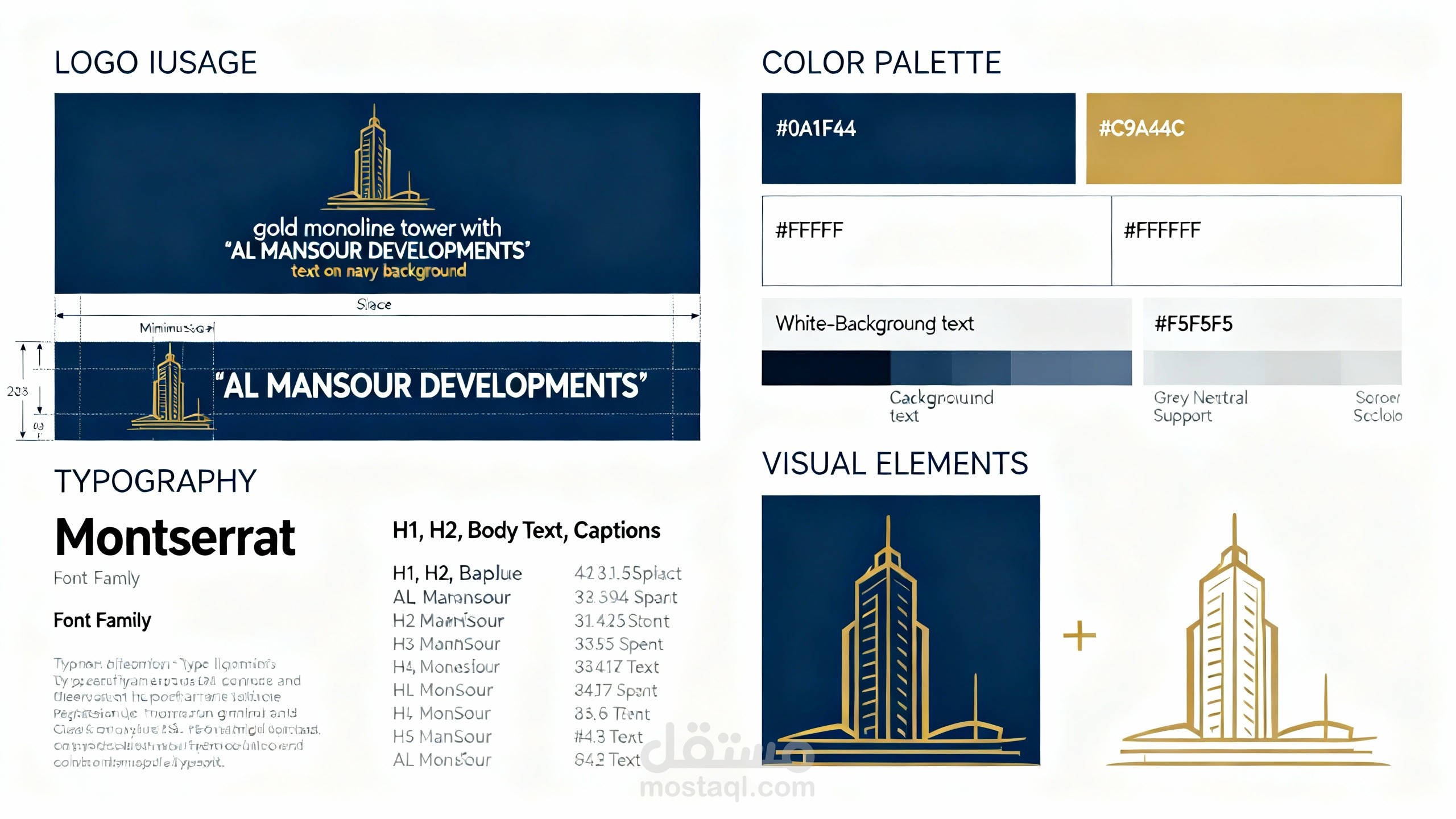 تم تصميم هوية بصرية متكاملة لشركة المنصور للتطوير العقاري (AL MANSOUR DEVELOPMENTS)، لتعكس مكانتها كشركة رائدة في الاستثمار والتطوير العقاري الفاخر.