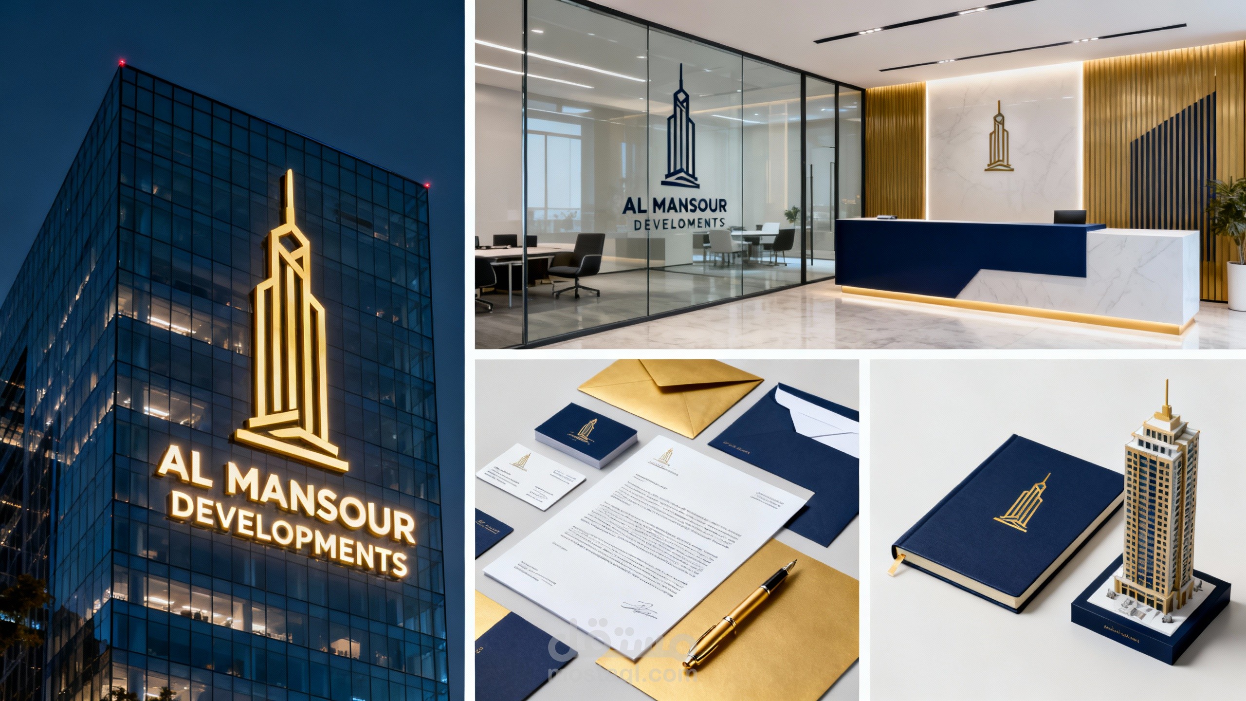 - عرض تقديمي (Mockups) للشعار على المباني والزجاج والقرطاسية لإبراز فخامة الهوية.